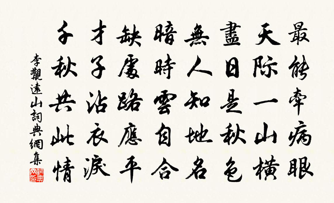 詩詞名句歷史字典書法欣賞書法字典國語詞典說文解字康熙字典古漢語字典標 題 作 者 詩 句 遠山作者:李覯 朝代:宋代遠山原文最能牽病眼,天際一山橫。盡日是秋色,無人知地名。暗時雲自合,缺處路應平。才子沾衣淚,千秋共此情。詩詞問答問:遠山的作者是誰?答:李覯問:遠山寫於哪個朝代?答:宋代李覯遠山書法欣賞遠山書法作品詩詞推薦酬束丈貺詩兼弱敘所懷王令〔宋代〕白日立中路,犬去不形相。夜以盜自來,何敢怨犬傷。主人忽加念,謝恕犬無良。盜子愧伏前,有言願加詳。見賜明融盆池二首沈說〔宋代〕老瓦盆深漾細萍,雨多流卻半瓣青。夜涼偶出庭心看,缺處光涵三兩星。題偶愛方岳〔宋代〕長汀宜日山宜雨,盡在鷗看鷺聽中。想見夜寒留客醉,倚闌拍手喚漁篷。題天慶觀碧玉堂龔準〔宋代〕清曉叩玄關,憂時鬢已斑。何如閒道士,隔竹看君山。次韻黔陽王令詩五絕句項安世〔宋代〕見說吟喔三十載,從來此事一生功。勸君莫用雕鐫得,只恐今人晚更窮。冬夜讀書有感陸游〔宋代〕落葉殘蕪又一冬,老人光景易匆匆。不論病惰耕桑業,但恨貧分學問功。馬昔騰驤離冀北,鶴今憔悴返遼東。六經沁園春(壽張府判夫人)姚勉〔宋代〕梅笑東風,只兩日間,又新歲華。有 * 阿母,獻三蟠實,蕊宮仙子,飛七香車。春滿蝦簾,雪晴鴛瓦,窗戶非煙四伯父生朝三首項安世〔宋代〕夜闌修竹罷傅觴,清曉詵詵輯燕堂。浴冠舞童春服盛,秀眉齯齒頌聲長。傅山細吐晴霏潤,大斗高斟腊味香。華發句孫子進〔宋代〕酒祿嗟予薄。挽許秋浦馬廷鸞〔宋代〕蒼顏白髮王官谷,綠幕黃簾六館生。閱世舊嗟身偃蹇,懷人新有淚縱橫。病起王諶〔宋代〕連日新晴愜病懷,跧藏一室絕纖埃。出來未得寒猶在,窮不奈何春又回。酒盞慚疎朋舊少,紙簾不為俗人開。日長贈張受益檢校陳深〔宋代〕山水經行遍,蕭閒吏隱情。劍寒光不泯,鶴老骨逾清。傾蓋逢知已,論詩盍鑲卿。從來說張祐,不是浪傳名。偈頌二百零五首釋正覺〔宋代〕陰極而陽生,力窮而位轉。蒼龍退骨而驤,玄豹披霧而變。要將三世佛髑髏,穿作數珠子一穿。莫道明頭暗頭,真觀安西兵過赴關中待命二首杜甫〔唐代〕四鎮富精銳,摧鋒皆絕倫。還聞獻士卒,足以靜風塵。老馬夜知道,蒼鷹飢著人。臨危經久戰,用急始如神。奇兵題花木障杜荀鶴〔唐代〕不假東風次第吹,筆勻春色一枝枝。由來畫看勝栽看,免見朝開暮落時。陪盱眙王使君東遊四首陳造〔宋代〕錦席浮波影,牙檣轉霧霏。飛花窺碧酒,舞蝶傍紅衣。野日歌前淡,雲峰望處微。游魚應與樂,啼鳥莫催歸。致政楊圖南僉判惠園亭石刻來索惡語寄題四首周必大〔宋代〕有竹無花山澤癯,有花無竹雪肌膚。洛陽城裡花連竹,迂叟規模定不迂。送人之荊門周弼〔宋代〕昔年此路達王畿,荒燒畲煙事已非。山向崤函空北望,水隨江漢自東歸。淒涼坂路徵車遠,寂寞郵亭候火稀。遙想句李一鰲〔宋代〕玉盆應有意,要洗貪者廉。發臨洮將赴北庭留別(得飛字)岑參〔唐代〕聞說輪台路,連年見雪飛。春風曾不到,漢使亦應稀。白草通疏勒,青山過武威。勤王敢道遠,私向夢中歸。名句推薦辜負我,悔憐君,告天天不聞。牛嶠《更漏子·春夜闌》 卷盡殘花風未定,休恨,花開元自要春風。辛棄疾《定風波·暮春漫興》 欲知方寸,共有幾許清愁,芭蕉不展丁香結。賀鑄《石州引·薄雨初寒》 大江東去,浪淘盡,千古風流人物。蘇軾《念奴嬌·赤壁懷古》 赤壁磯頭落照,肥水橋邊衰草,渺渺喚人愁張孝祥《水調歌頭·和龐佑父》 雪紛紛,掩重門,不由人不斷魂,瘦損江梅韻。關漢卿《大德歌·冬》 春日宴,綠酒一杯歌一遍。馮延巳《長命女·春日宴》 半死梧桐老病身,重泉一念一傷神。白居易《為薛台悼亡》 重陽過後,西風漸緊,庭樹葉紛紛。晏殊《少年游·重陽過後》 死別已吞聲,生別常惻惻。杜甫《夢李白二首·其一》