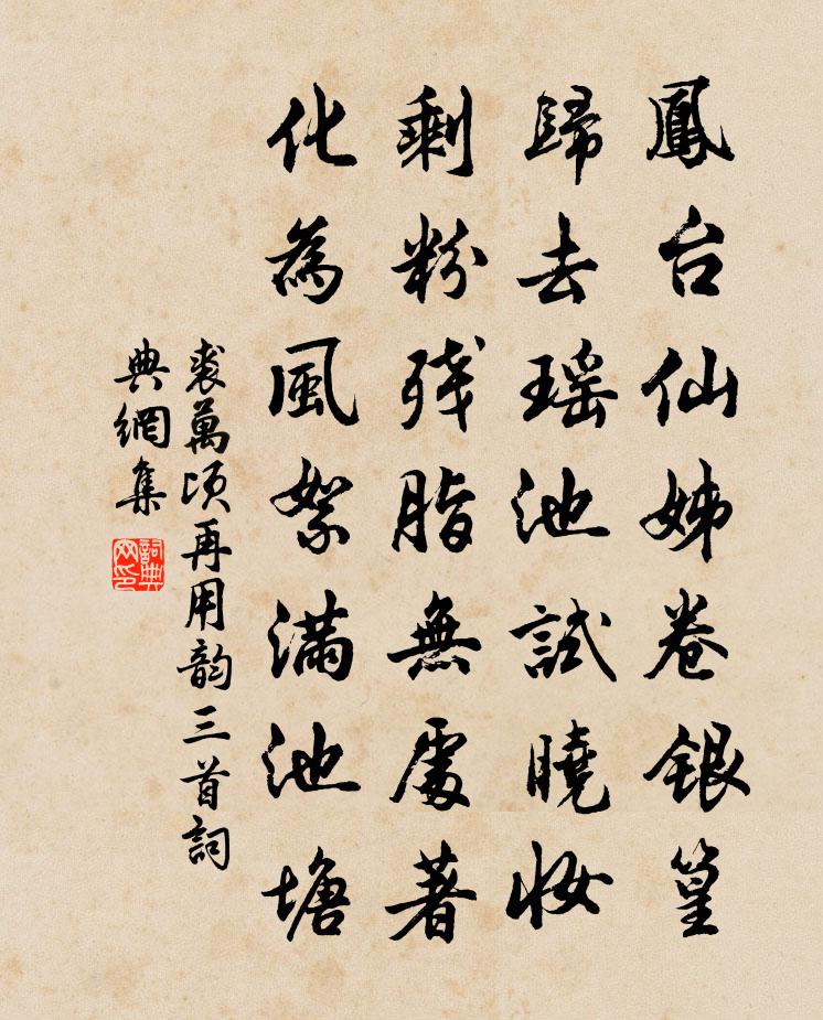 詩詞名句歷史字典書法欣賞書法字典國語詞典說文解字康熙字典古漢語字典標 題 作 者 詩 句 再用韻三首作者:裘萬頃 朝代:宋代再用韻三首原文鳳台仙姊卷銀篁,歸去瑤池試曉妝。剩粉殘脂無處著,化為風絮滿池塘。詩詞問答問:再用韻三首的作者是誰?答:裘萬頃問:再用韻三首寫於哪個朝代?答:宋代裘萬頃再用韻三首書法欣賞再用韻三首書法作品詩詞推薦清平樂張炎〔宋代〕百花開後。一朵疑堆繡。絕色年年常似舊。因甚不隨春瘦。脂痕淡約蜂黃。可憐獨倚新妝。太白醉游何處,定應忘題方大夫家訓錢時〔宋代〕中興天子方御戎,長城萬里張魏公。此時此家盡好武,抵掌一呼來幕中。幕中群雄肝膽烈,指顧關河日彈鋏。若為送傅正之官禮部孔武仲〔宋代〕妙道微言早自知,鈞衡何事器君遲。連牆並屋相從久,聳壑昂霄此去宜。畫省含香修故事,雲台呼仗請私儀。想君題王侍御池亭白居易〔唐代〕朱門深鎖春池滿,岸落薔薇水浸莎。畢竟林塘誰是主?主人來少客來多。題梅山雲悅樓鍾訧〔宋代〕我匪悅云云悅我,雲兮與我一無心。知君只愛雲中隱,不肯出山無處尋。送楷維那釋普度〔宋代〕輥底怒濤千丈雪,轉空明月一天秋。贈行莫道□□窖,歷歷君家拄杖頭。題韓乾馬圖張耒〔宋代〕頭如翔鸞月頰光,背如安輿鳧臆方。心知不載田舍郎,猶帶開元天子紅袍香。韓乾寫時國無事,綠樹陰低春晝長。寄呈座主李左史三首程公許〔宋代〕絲絇趁曉紫宸朝,憫俗超然曲遠遊。富貴儻來心止水,隱思不耐鬢先秋。誰知皓首太玄草,獨對青山大白浮。只恐初夏出遊陸游〔宋代〕平生與世曠周旋,惟有清游意獨便。小灶炊菰山市口,束芻秣蹇海雲邊。春融恨欠舒長日,秋爽已悲搖落天。首夏賀新郎(許遂寧奕生日)魏了翁〔宋代〕多少龍頭客。數從前、何官不做,清名難得。萬里將旜歸報漢,青鎖還應催當夕。又一葉、扁舟去國。許史廬前車和任宰元紹見寄十首以歸來問信湖山撫摩松菊吳芾〔宋代〕出仕慚無補,長年詠式微。天公憐我意,一旦許來歸。【中呂】朝天子_山中雜書三張可久〔元代〕山中雜書三首罷手,去休,已落在淵明後。百年心事付沙鷗,更誰是忘機友。洞口漁舟,橋邊村酒,這清閒何處有寒夜范成大〔宋代〕萬象閒無語,一蛩吟獨嘩。肅肅月浸樹,滿庭穠李花。風從月中來,吹我兩鬢華。北斗聲迴環,南斗亦橫斜。人生魯直以詩饋雙井茶次韻為謝蘇軾〔宋代〕江夏無雙種奇茗,汝陰六一夸新書。磨成不敢付僮僕,自看湯雪生璣珠。列仙之儒瘠不腴,只有病渴同相如。明年過襄城韓愈〔唐代〕郾城辭罷過襄城,潁水嵩山刮眼明。已去蔡州三百里,家人不用遠來迎。好事近·馬首望青山納蘭性德〔清代〕馬首望青山,零落繁華如此。再向斷煙衰草,認蘚碑題字。休尋折戟話當年,只灑悲秋淚。斜日十三陵下,過新豐過毛國鎮夜飲蘇轍〔宋代〕風格照人華省郎,江山繞郭古仙鄉。漫傳鉛鼎八百歲,未比金釵十二行。不動歌聲人已醉,旋聞詩句夜初長。簿書送左眉州之任寇準〔宋代〕分官離法署,承命守眉州。山館鄰孤寺,春城過亂流。江雲長映日,蜀魄似悲秋。到郡揚清政,遺黎病必瘳。郊廟歌辭。享文敬太子廟樂章。登歌陳京〔唐代〕歌以德發,聲以樂貴。樂善名存,追仙禮異。鸞旌拱修,鳳鳴合吹。神聽皇慈,仲月皆至。窗下繡(一落索)賀鑄〔宋代〕初見碧紗窗下繡。寸波頻溜。錯將黃暈壓檀花,翠袖掩、纖縴手。金縷一雙紅豆。情通色授。不應學舞愛垂楊,甚名句推薦逢流星兮問路,顧我指兮從左。王逸《九思》 勝概日相與,思君心鬱陶。岑參《鞏北秋興寄崔明允》 連山變幽晦,綠水函晏溫柳宗元《飲酒》 低頭羞見人,雙手結裙帶。毛鉉《 * 詞·下床著新衣》 撥雪尋春,燒燈續晝。毛滂《踏莎行·元夕》 信人莫若信己,防人毋存幸念。來俊臣《羅織經·閱人卷第一》 快上西樓,怕天放、浮雲遮月。辛棄疾《滿江紅·中秋寄遠》 何處營巢夏將半,茅檐煙里語雙雙。杜牧《村舍燕》 綠葉素榮,紛其可喜兮。屈原《九章》 昨夜江邊春水生,艨艟巨艦一毛輕。朱熹《活水亭觀書有感二首·其二》
