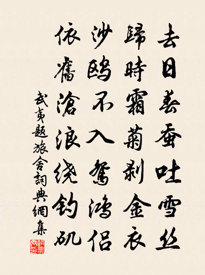 詩詞名句歷史字典書法欣賞書法字典國語詞典說文解字康熙字典古漢語字典標 題 作 者 詩 句 題旅舍作者:武夷 朝代:宋代題旅舍原文去日春蠶吐雪絲,歸時霜菊剝金衣。沙鷗不入鴛鴻侶,依舊滄浪繞釣磯。詩詞問答問:題旅舍的作者是誰?答:武夷問:題旅舍寫於哪個朝代?答:宋代武夷題旅舍書法欣賞題旅舍書法作品詩詞推薦賦黃任道韓乾馬王令〔宋代〕天寶天子監天廄,吐蕃入馬上天壽。紫衣馭吏偏坐前,騎入都門不容驟。西極苜蓿得氣肥,六閒飛黃臥嗟瘦。千秋晨炊翫鞭亭二首楊萬里〔宋代〕老賊平欺晉鼎輕,一輪五色夢中驚。寶鞭脫急非無策,何似休將日遶營。寄趙著作趙蕃〔宋代〕有客東來為我言,詔書傳已下修門。幡然要識朝廷意,易此方明父子恩。物望只今誰得似,道行寧負夙心存。公其雨晴後步至四望亭下魚池上遂自乾明寺前東岡蘇軾〔宋代〕雨過廢浮萍合,廢蛙聲滿四廢鄰。海棠廢真一夢,梅子欲嘗新。拄杖閒挑菜,鞦韆不見人。殷勤木芍藥,獨自殿余鹹平御樓四首佚名〔宋代〕應門有翼,羽術斯陳。山龍兗冕,律度聲身。峨峨奉璋,肅肅九實。清明在躬,志氣如神。和楊尚書罷相後夏日游永安水亭兼招本曹楊侍郎同行白居易〔唐代〕道行無喜退無憂,舒捲如雲得自由。良冶動時為哲匠,巨川濟了作虛舟。竹亭陰合偏宜夏,水檻風涼不待秋。遙愛稚卿約郭外之游鄭獬〔宋代〕舉世尚刻飾,趨時獨放達。醉眼掛飛雲,孤心貯明月。大匠坐高堂,群材就剞劂。楩楠即赤霄,容此蟠根屈。平明念奴嬌·西湖和人韻辛棄疾〔宋代〕晚風吹雨,戰新荷、聲亂明珠蒼璧。誰把香奩收寶鏡,雲錦紅涵湖碧。飛鳥翻空,游魚吹浪,慣趁笙歌席。坐中豪暮春戲贈樊宗憲鮑溶〔唐代〕羌笛胡琴春調長,美人何處樂年芳。野船弄酒鴛鴦醉,官路攀花騕褭狂。應和朝雲垂手語,肯嫌夜色斷刀光。次李提舉過南園飲散賦詩韻曹勛〔宋代〕小山叢薄棲南郭,蘭若蔽虧如間錯。竹色低侵几案涼,海雲常壓波濤惡。遣愁五字了未有,取醉一樽良可托。折簡送王西樞出鎮鄭圃八首之三賀鑄〔宋代〕公論由來重,高懷此去輕。吾非厚知己,感嘆此蒼生。慶金枝(中呂宮)張先〔宋代〕青螺添遠山。兩嬌靨、笑時圓。抱雲勾雪近燈看。妍處不堪憐。今生但願無離別,花月下、繡屏前。雙蠶成繭共纏送馮勉仲赴省舒邦佐〔宋代〕客餞旗亭酒半酣,摶風九萬送鵬南。薄勞汗馬功收一,肯怨長途玉獻三。去年梅花催驛騎,看看柳色斗恩藍。長篇上周少保劉過〔宋代〕遊戲公孤了,歸來不愛名。昌黎前進士,司馬老先生。有節化宜晚,無波水自平。翳雲遮不得,南極益精明。挽趙秋曉張昭子〔宋代〕家住青山擅一丘,菜畦花圃足夷猶。哲人造物何慳壽,公子平生不識愁。雞黍情緣成夢斷,鶯花心性蓋棺休。草亭東壩以里沿岸人家皆對門植葦於小嶼不曉其旨岳珂〔宋代〕曲江西畔鎖離宮,細柳新蒲日日風。想見千門映春綠,君王未見碧成叢。次明仲涼字韻劉子翬〔宋代〕浮暑熏人只欲狂,秋聲未肯抹橫塘。倦看黃奶渾無味,醉著白練如許涼。掃砌政須修竹舞,蔭花絕愛巨荷張。紫髯餞高仁卿農丞奉使還北牟巘五〔宋代〕裝輕路穩好兼程,還向鵷班侶雋英。自葉流根誰識此,老農摩腹送餘生。李鄴侯贊陳長方〔宋代〕四海九州,如一戱具。運之失機,人與俱仆。嗟世小兒,坐旁窺觀。擬指其手,目動心寒。偉茲鄴侯,把握是器。九日會連雲樓分韻得落字林景熙〔宋代〕冉冉酒海霧深,酒荒荒山日酒薄。登高酒集華裾,縱目天宇廓。落葉悲徂年,寒英照深酌。心醉乃文字,意行非澗名句推薦一張一弛,文武之道戴聖《禮記·雜記下》 獨憐幽草澗邊生,上有黃鸝深樹鳴。韋應物《滁州西澗》 弱冠弄柔翰,卓犖觀群書。左思《詠史八首·其一》 明月幾時有?把酒問青天。蘇軾《水調歌頭·丙辰中秋》 過而能改者,民之上也。左丘明《國語·魯語·季文子論妾馬》 欸乃一聲山水綠。回看天際下中流,岩上無心雲相逐柳宗元《漁翁》 將軍發白馬,旌節度黃河。李白《發白馬》 桃花落。閒池閣。山盟雖在,錦書難托。陸游《釵頭鳳·紅酥手》 非知之難,行之為難;非行之難,終之斯難。吳兢《貞觀政要·卷十·論慎終》 上有流思人,懷舊望歸客。謝朓《送江水曹還遠館》