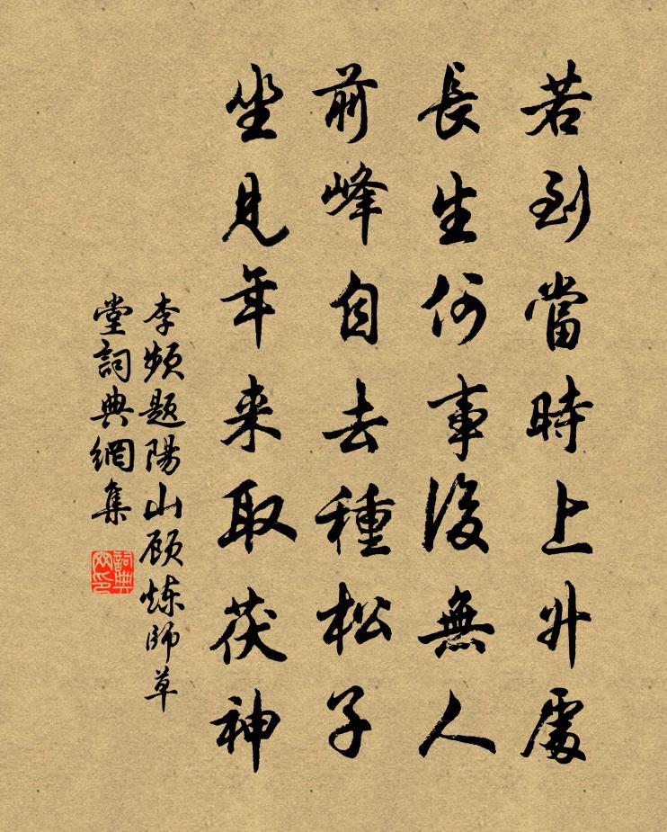 詩詞名句歷史字典書法欣賞書法字典國語詞典說文解字康熙字典古漢語字典標 題 作 者 詩 句 題陽山顧鍊師草堂作者:李頻 朝代:唐代題陽山顧鍊師草堂原文若到當時上升處,長生何事後無人。前峰自去種松子,坐見年來取茯神。詩詞問答問:題陽山顧鍊師草堂的作者是誰?答:李頻問:題陽山顧鍊師草堂寫於哪個朝代?答:唐代問:題陽山顧鍊師草堂是什麼體裁?答:七絕李頻題陽山顧鍊師草堂書法欣賞題陽山顧鍊師草堂書法作品注釋全唐詩:卷587-35詩詞推薦仙都山鹿蘇軾〔宋代〕日月何促促,塵世苦局束。仙子去無蹤,故山遺白鹿。仙人已去鹿無家,孤棲悵望層城霞。至今聞有游洞客,夜來梓潼歲暮鄭谷〔唐代〕江城無宿雪,風物易為春。酒美消磨日,梅香著莫人。老吟窮景象,多難損精神。漸有還京望,綿州減戰塵。問說劉開〔清代〕君子之學必好問。問與學,相輔而行者也。非學無以致疑,非問無以廣識;好學而不勤問,非真能好學者也。理明十二時頌釋文準〔宋代〕日昳未,法身清淨絕方比。乾坤遐邇盡東西,千山萬山翠相倚。斜徑王安石〔宋代〕斜徑遇通南埭路,數家遙對北山岑。草頭蛺蝶黃花晚,菱角蜻蜓翠蔓深。書感劉克莊〔宋代〕仲尼已沒世無師,新學專門各自私。死守不為它說勝,秘藏似恐外人窺。欲招程子看通典,兼起歐公講擊辭。浩嘆梅花喜神譜欲謝一十六枝宋伯仁〔宋代〕倦翼已知還,投林謀夜宿。戈宿無容心,機深未為福。高二承宣以長句餉新茶輒次韻為謝晁說之〔宋代〕春風伴我到僧家,嘆息無名供佛花。劉子枕糟非枕酒,陸生論水不論茶。少多何必求玄鵠,一二唯當較白沙。更恨鶴沖天·清明天氣杜安世〔宋代〕清明天氣,永日愁如醉。台榭綠陰濃,薰風細。燕子巢方就,盆池小,新荷蔽。恰是逍遙際。單袷衣裳,半籠軟玉六么令晏幾道〔宋代〕日高春睡,喚起懶裝束。年年落花時候,慣得嬌眠足。學唱宮梅便好,更暖銀笙逐。黛蛾低綠。堪教人恨,卻似江傷雙燕佚名〔宋代〕燕燕于飛春欲暮,終日呢喃語如訴。但聞寄唳來瀟湘,不聞有意如烈婦。夏氏狂兒好遊獵,彈射飛禽類幾絕。梁間陪留守余處恭、總領錢進思、提刑傅景仁游清楊萬里〔宋代〕已守台城更石城,不知併力或分營。六師只遣環天闕,一壘真成藉寇兵。向者王蘇俱解此,冤哉隗愶可憐生。若言賀中丞晏尚書春陰宋祁〔宋代〕輕寒剪剪著春旗,樓外晨光已暗移。小霧不還添柳弱,餘寒未去惱花遲。麼弦促柱愁成曲,遠水迎船巧作漪。誰在讀山海經十三首·其四陶淵明〔魏晉〕丹木生何許?迺在峚山陽。黃花復朱實,食之壽命長。白玉凝素液,瑾瑜發奇光。豈伊君子寶,見重我軒黃。次韻劉敷言新雁陳棣〔宋代〕倦飛聊復下江湖,此去衡陽萬里余。陣合魚麗司馬法,字排草聖右軍書。隨陽度塞身良苦,避繳銜蘆計已疏。一抹寄答周協律 來詩多敘蘇州舊遊。白居易〔唐代〕故人敘舊寄新篇,惆悵江南到眼前。暗想樓台萬餘里,不聞歌吹一周年。橋頭誰更看新月,池畔猶應泊舊船。最憶陽羅磯孔武仲〔宋代〕石壯山獰不可乾,傾江波浪作驚湍。殘霞一抹吳天晚,正苦扁舟不上灘。次黃司戶紅糟韻四首項安世〔宋代〕江南水作桃花紅,釀成十五女兒容。眉山先生忽驚見,一曲便欲拚千鍾。誰傅春過信江北,小槽殘滴何能豐。相逢詠淮陰侯王珪〔唐代〕秦王日凶慝,豪傑爭共亡。信亦胡為者,劍歌從項梁。項羽不能用,脫身歸漢王。道契君臣合,時來名位彰。北討三十二初度次日書懷曾國藩〔清代〕男兒三十殊非少,今我過之詎足歡!齷齪摯瓶嗟器小,酣歌鼓缶已春闌。眼中雲物知何兆,鏡里心情只獨看。飽食名句推薦不知馬骨傷寒水,惟見龍城起暮雲。王涯《塞下曲二首·其二》 琵琶弦上說相思。當時明月在,曾照彩雲歸。晏幾道《臨江仙·夢後樓台高鎖》 兩鬢可憐青,只為相思老。晏幾道《生查子·關山魂夢長》 應知早飄落,故逐上春來。何遜《詠早梅 / 揚州法曹梅花盛開》 舊苑荒台楊柳新,菱歌清唱不勝春。李白《蘇台覽古》 九曲黃河萬里沙,浪淘風簸自天涯。劉禹錫《浪淘沙·九曲黃河萬里沙》 紫燕一雙嬌語碎,翠屏十二晚峰齊,夢魂消散醉空閨。毛熙震《浣溪沙·花榭香紅煙景迷》 梅落繁枝千萬片,猶自多情,學雪隨風轉。馮延巳《鵲踏枝·梅落繁枝千萬片》 時雨降矣,而猶浸灌,其於澤也,不亦勞乎!莊子《莊子·內篇·逍遙遊》 家國興亡自有時,吳人何苦怨西施。羅隱《西施》
