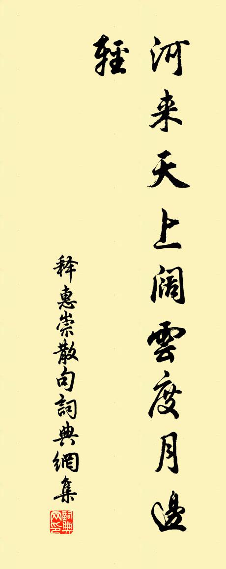 詩詞名句歷史字典書法欣賞書法字典國語詞典說文解字康熙字典古漢語字典標 題 作 者 詩 句 句作者:釋惠崇 朝代:宋代句原文河來天上闊,雲度月邊輕。詩詞問答問:句的作者是誰?答:釋惠崇問:句寫於哪個朝代?答:宋代釋惠崇句書法欣賞句書法作品詩詞推薦偈頌七十六首釋師範〔宋代〕數百禪和數十州,襤襂破衲面掐搜。諸方有道不肯學,甘共山僧拽木頭。祖傳禪人求贊釋宗杲〔宋代〕藞苴全似川僧,蕭灑渾如浙客。偏向情未生時,拈出報慈一隔。尊性不定,莫可窺測。見小時嫌蟭螟眼太寬。見大于闐鍾歌送靈徹上人歸越(鍾在越靈嘉寺,從天竺飛來)竇庠〔唐代〕海中有國傾神功,烹金化成九乳鍾。精氣激射聲沖瀜,護持海底諸魚龍。聲有感,神無方,連天雲水無津梁。不知寄題杭州通判胡學士官居詩四首方庵文同〔宋代〕眾人庵盡圓,君庵獨雲方。君雖樂其中,無乃太異常。勸君刓其角,使稱著月床。自然制度穩,名號亦可詳。東西和祝季通韻王炎〔宋代〕踏破蒼苔馬有聲,百金一諾不寒盟。揮犀議論高流輩,落筆典刑追老成。犯雪方知松節直,截河不變濟流清。論交三山杜門作歌陸游〔宋代〕中歲遠遊踰劍閣,青衫誤入征西幙。南沮水邊秋射虎,大散關頭夜聞角。畫策雖工不見用,悲吒那復從軍樂。鳴呼戲呈珉禪師周麟之〔宋代〕我來何幸識支郎,百丈峰頭寶月光。質薄自憐非燕頷,途窮誰信是龜腸。漸看鬢底千絲白,敢說眉間一點黃。坐見偈頌七十六首釋師觀〔宋代〕今朝七月一,解夏半月日。摩挲拄杖子,笠頭勤拂拭。狗子無佛性,一文也不直。山中吟釋文珦〔宋代〕山林雖寂寞,變可息塵勞。野食分猿果,寒衣補毳袍。雲蹤常散誕,松貌極孤高。賦詠隨吾意,無心更擬騷。寶鏡吟柴元彪〔宋代〕荊山已童若耶涸,若耶可采山可鑿。金精少皞不敢秘,鑒壞飛就歐冶錯。祝融煽焰千丈芒,玄冥洗光萬里爍。冷侵李倅生辰三首陳棣〔宋代〕伯陽飛御上層天,繼世雲礽盡謫仙。炯炯方瞳真壽相,不勞頌祝自長年。賀雪齊己〔唐代〕上清凝結下乾坤,為瑞為祥表致君。日月影從光外過,山河形向靜中分。歌揚郢路誰同聽,聲灑梁園客共聞。堪想萬年歡王安禮〔宋代〕雅出群芳。占春前信息,臘後風光。野岸郵亭,繁似萬點輕霜。清淺溪流倒影,更黯淡、月色籠香。渾疑是、姑射望鄉台楊維楨〔元代〕望鄉台上客,秋至望鄉關。中願遮望眼,可奈燕支山?毘藍岩盛奇〔宋代〕別開洞壑翠微齊,蘿薜雲深路轉迷。一榻繁陰炎掃午,六秋岩畔足幽棲。次韻朱喬年送山老住三峰二首劉子翬〔宋代〕平生耳裹三峰寺,況識峰頭新主人。借我一筇扶病去,月林松吹度綸巾。鄰家翁輓辭二首鄧肅〔宋代〕凜然風韻老尤癯,方寸經營包九區。窖粟巧為任氏策,縛船冷笑退之迂。深藏未肯驕僮僕,儉德端能率里閭。故使秋懷三十六首邵雍〔宋代〕淡煙羃疏林,輕風裊寒雨。日暮人已歸,群雞猶啄黍。此心固不動,此事極難處。一言以蔽之,尚恐費言語。田家陳師道〔宋代〕雞鳴人當行,犬鳴人當歸。秋來公事急,出處不待時。昨夜三尺雨,灶下已生泥。人言田家樂,爾苦人得知。奉和四月三日上陽水窗賜宴應制得春字孫逖〔唐代〕今日逢初夏,歡游續舊旬。氣和先作雨,恩厚別成春。鳳吹臨清洛,龍輿下紫宸。此中歌在藻,還見躍潛鱗。名句推薦琴瑟在御,莫不靜好。佚名《女曰雞鳴》 桃李出深井,花艷驚上春。李白《中山孺子妾歌》 征蓬出漢塞,歸雁入胡天。王維《使至塞上》 一看腸一斷,好去莫回頭。白居易《南浦別》 知足者富。強行者有志。不失其所者久。老子《老子·道經·第三十三章》 一日不見,如三月兮。佚名《子衿》 苟利國家生死以,豈因禍福避趨之。林則徐《赴戍登程口占示家人·其二》 先拂商弦后角羽,四郊秋葉驚摵摵。李頎《聽董大彈胡笳聲兼寄語弄房給事》 愛人者此為博焉,利人者此為厚焉。墨子《墨子·26章 天志(上)》 那年離別日,只道住桐廬。劉采春《囉嗊曲·那年離別日》