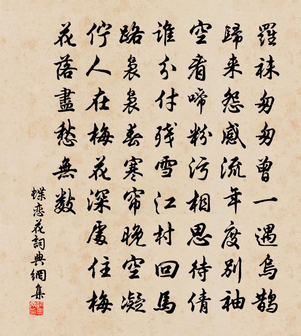 殘雪江村回馬路。裊裊春寒,簾晚空凝佇。人在梅花深處住。梅花落盡愁無數。