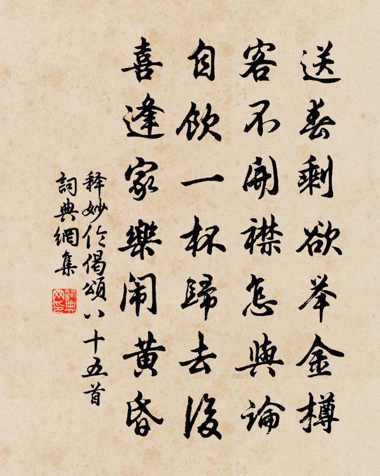 詩詞名句歷史字典書法欣賞書法字典國語詞典說文解字康熙字典古漢語字典標 題 作 者 詩 句 偈頌八十五首作者:釋妙倫 朝代:宋代偈頌八十五首原文送春剩欲舉金樽,客不開襟怎與論。自飲一杯歸去後,喜逢家樂鬧黃昏。詩詞問答問:偈頌八十五首的作者是誰?答:釋妙倫問:偈頌八十五首寫於哪個朝代?答:宋代釋妙倫偈頌八十五首書法欣賞偈頌八十五首書法作品詩詞推薦漢嗣唐彥謙〔唐代〕漢嗣安危係數君,高皇決意勢難分。張良口辨周昌吃,同建儲宮第一勛。寄子兼弟時聞有平都之游晁公溯〔宋代〕春風殿閣百花香,欲去題詩細作行。聞爾東遊有佳句,只應先我賦靈光。招縉雲寺關彥遠教授曾彥和集平山堂次關韻晁補之〔宋代〕蜀岡勢與蜀山通,龍虎盤挐上紫空。小語還憂驚太一,高堂元自在天中。少師楊柳無遺蹟,承旨歌謠有舊風。斜日重送道標上人劉長卿〔唐代〕衡陽千里去人稀,遙逐孤雲入翠微。春草青青新覆地,深山無路若為歸。鳴雁行李白〔唐代〕胡雁鳴,辭燕山,昨發委羽朝度關。一一銜蘆枝,南飛散落天地間,連行接翼往復還。客居煙波寄湘吳,凌霜觸雪稼說送張琥蘇軾〔宋代〕曷(盍)嘗觀於富人之稼乎?其田美而多,其食足而有餘。其田美而多,則可以更休,而地力得全;其食足而有餘報師恩 虢縣渭南濼里丘處機〔元代〕一方勝景滿川稀。水竹彎環四面圍。簇檻名花紅冉冉,當門幽檜綠依依。爭歌稚子春風舞,鬥巧靈禽曉樹啼。社內和李才甫先輩快閣五首黃庭堅〔宋代〕西南佳氣浮馬祖,東北祥風繞靜居。山邑豐年人少訟,身來訪道得齋魚。二十六日下山觀勝業寺禹柏偃臥地上分為九枝項安世〔宋代〕人言禹時柏,是否何必研。要知是古物,少亦逾千年。盤盤九龍子,脊尾何蜿蜒。疏髯挾雷雨,瘦骨含風煙。居然詩二首趙與時〔宋代〕達人澄此心,肯為萬法起。眼看聲色塵,不直一杯水。七娘子(三衢道中作)陳亮〔宋代〕風流家世傳張緒。似靈和新種垂縷。綺席離詞,銀台奏賦。當年夢繞蓬山路。賣花聲斷藍橋暮。記吟鞭醉帽曾經處禁中瑞竹同本異莖梅堯臣〔宋代〕孤竹二君子,聖人知獨清。但將奇節並,何用首陽名。石州慢(九日)秦觀〔宋代〕深院蕭條,滿地蒼苔,一叢荒菊。含霜冷蕊,全無佳思,向人搖綠。客邊節序,草草付與清觴,孤吟只把羈懷觸。早梅芳/喜遷鶯陳允平〔宋代〕鳳釵橫,鸞帶繞。獨步鴛鴦沼。闌乾斜倚,自打精神對花笑。貼衣瓊佩冷,襯襪金蓮小。卷香茵縹緲,舞袖稱纖妙句江休復〔宋代〕郡邸獄冤誰與辯,皋橋客死世同悲。奉和幸韋嗣立山莊侍宴應制武平一〔唐代〕三光回斗極,萬騎肅鉤陳。地若游汾水,畋疑歷渭濱。圓塘冰寫鏡,遙樹露成春。弦奏魚聽曲,機忘鳥狎人。築岩走筆和張功父玉照堂十絕楊萬里〔宋代〕年年春信遣人疑,賺出詩人枉覓詩。著意探梅偏不發,月斜偶見一橫枝。次韻耿薦可催菊三首仲並〔宋代〕年來花意亦難猜,陶令東籬獨未開。伴賦落英吾豈敢,狂言聊復為君催。換徐敦濟郎中詞二首韓元吉〔宋代〕南渡推人物,彝常有世家。州麾三上最,使節五分華。通籍恩初渥,登車病已加。甘泉垂入侍,華屋漫興嗟。題龍隱岩王迤祖〔宋代〕龍蟠此地不知年,飛去穿成萬仞淵。霖雨四方今欲遍,後人空自想蜿蜓。名句推薦妖嬈艷態,妒風笑月,長殢東君。李清照《慶清朝·禁幄低張》 煙霏霏。雪霏霏。雪向梅花枝上堆。吳淑姬《長相思令·煙霏霏》 不見又思量,見了還依舊。李之儀《謝池春·殘寒銷盡》 朔風吹雪透刀瘢,飲馬長城窟更寒。盧汝弼《和李秀才邊庭四時怨·其四》 酹酒蒼茫,倚歌平遠,亭上玉虹腰冷。吳文英《十二郎·垂虹橋》 兒女此情同。往事朦朧。湘娥竹上淚痕濃。辛棄疾《浪淘沙·賦虞美人草》 記問之學,不足以為人師。戴聖《禮記·學記》 選賢於野,則治身業弘;求士子朝,則飾智風起。沈約《宋書·列傳·卷五十五》 水激則悍,矢激則遠劉向《說苑·談叢》 造物無言卻有情,每於寒盡覺春生。張維屏《新雷》