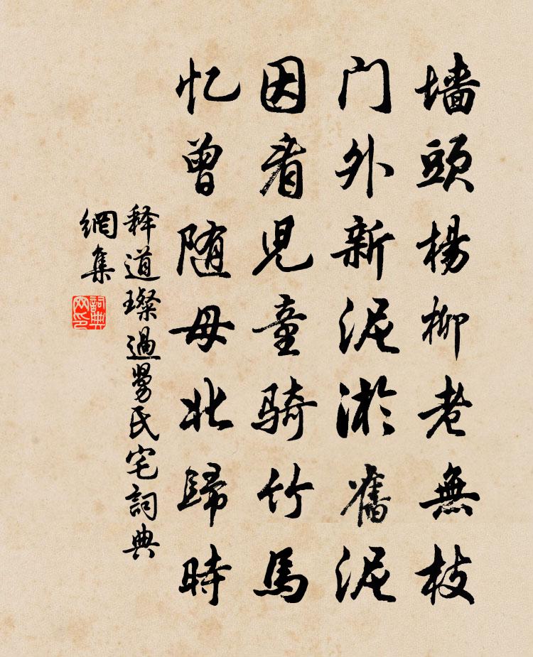 詩詞名句歷史字典書法欣賞書法字典國語詞典說文解字康熙字典古漢語字典標 題 作 者 詩 句 過舅氏宅作者:釋道璨 朝代:宋代過舅氏宅原文牆頭楊柳老無枝,門外新泥淤舊泥。因看兒童騎竹馬,憶曾隨母北歸時。詩詞問答問:過舅氏宅的作者是誰?答:釋道璨問:過舅氏宅寫於哪個朝代?答:宋代釋道璨過舅氏宅書法欣賞過舅氏宅書法作品詩詞推薦觀風閣文同〔宋代〕危閣覆高林,晚步聊徒倚。東南兩峰斷,空闊見萬里。茫茫落霞外,苒苒孤煙里。忽暗識歸雲,乍明知積水。風從於清河見挽船士新婚與妻別詩徐幹〔魏晉〕與君結新婚。宿昔當別離。涼風動秋草。蟋蟀鳴相隨。冽冽寒蟬吟。蟬吟抱枯枝。枯枝時飛揚。身體忽遷移。不悲和太原山亭懷古詩張賈〔唐代〕中庭起崖谷,漱玉下漣漪。丹丘誰雲遠,寓象得心期。豈不貴鐘鼎,至懷在希夷。唯當蓬萊閣,靈鳳復來儀。江上對酒二首白居易〔唐代〕酒助疏頑性,琴資緩慢情。有慵將送老,無智可勞生。忽忽忘機坐,倀倀任運行。家鄉安處是,那獨在神京?久貯釋奠詩應令江總〔隋代〕肅仰鴻化。恭聞盛典。人握懸藜。家藏瑚璉。顧惟朽謝。暮識膚淺。恩謬爵浮。心慚貌{忄典}。彭湖道中雜書五首方回〔宋代〕一夜大雷電,神喧復鬼嘩。橫岡風折樹,漲路雨頹沙。小小閒籬落,依然自野花。登寺閣見月上率然成詠張嵲〔宋代〕殘陽猶半谷,片月已臨山。暮色千林起,鄉心萬里還。不堪常俯仰,寧有但間關。絕世非吾意,幽棲寄暫閒。頌古三十九首釋道樞〔宋代〕同行自古不相肯,峰頂老人何足論。山凹落盡桃花片,流水依前繞竹門。燕歸梁(高平調)張先〔宋代〕夜月啼烏促亂弦。江樹遠無煙。缺多圓少奈何天。愁只恐、下關山。粉香生潤,衣珠弄彩,人月兩蟬娟。留連殘夜濠州四望亭閒眺梅詢〔宋代〕南北舟行互擲梭,長淮混混接天河。石樑景絕虹垂渚,桐柏春深雪作波。四望空明無俗翳,數聲欸乃有漁歌。誰言六月二十三日立秋喜聞賊平鎮將凱回歸府官俱方回〔宋代〕亂起杏花落,賊平梧葉飛。頓忘三伏暑,竟解萬山圍。大將傷流矢,諸軍曳血衣。先登不如此,焉得凱歌歸。漁家傲歐陽玄〔元代〕四月都城冰碗凍。含桃初薦瑛盤貢。南寺新開羅漢洞。伊蒲供。楊花滿院鶯聲弄。歲幸上京車駕動。近臣準備鑾輿水調歌頭·隱括杜牧之齊山詩朱熹〔宋代〕江水侵雲影,鴻雁欲南飛。攜壺結客,何處空翠渺煙霏。塵世難逢一笑,況有紫萸 * ,堪插滿頭歸。風景今朝是虞美人 大光祖席,醉中賦長短句陳與義〔宋代〕張帆欲去仍搔首,更醉君家酒。吟詩日日待春風,及至桃花開後卻匆匆。歌聲頻為行人咽,記著樽前雪。明朝酒醒曲肱詩二十首白玉蟾〔宋代〕我到人間未百年,恰如頃刻在三天。向來我本雷霆吏,今更休疑作甚仙。目眚忌食戲成鄭清之〔宋代〕生平未省讀食經,蟛蜞何事乾荀卿。霜螯帶糟老饕賦,素鱗斫膾晶盤行。政欲蓴鱸飽歸興,肯嫌蛙蛤譏南烹。誰言寄題尉遲少卿郊居姚合〔唐代〕卿仕在關東,林居思不窮。朝衣掛壁上,廄馬放田中。隅坐唯禪子,隨行只藥童。砌莎留宿露,庭竹出清風。濃翠景德祀皇寺祗三首佚名〔宋代〕妙用無方,條來忽逝。蠲潔寅恭,式終社痤。水調歌頭(八月十五夜集長樂堂月大明常歲所無眾客皆歡。戲用伯恭韻作)李彌遜〔宋代〕白髮閩江上,幾度過中秋。陰晴相半,曾見玉塔臥寒流。不似今年三五,皎皎冰輪初上,天闕恍神遊。下視人間世上丁郎中敖陶孫〔宋代〕仲章薛公十一鶴,季章李白詩百篇。自我過都得地老,頗覺閩蜀堪同川,今來劃逢丁將軍,秀傑萬里來嶓岷。篋中名句推薦舉賢任能,不時日而事利。尉繚《尉繚子·戰威》 成人不自在,自在不成人。佚名《增廣賢文·下集》 出南門即大海,一日兩潮,如萬丈銀堤破海而過。沈復《浮生六記·浪遊記快》 玉梅消瘦,恨東皇命薄。汪元量《傳言玉女·錢塘元夕》 登高壯觀天地間,大江茫茫去不還。李白《廬山謠寄盧侍御虛舟》 泥融飛燕子,沙暖睡鴛鴦。杜甫《絕句二首》 池塘生春草,園柳變鳴禽。謝靈運《登池上樓》 故園渺何處,歸思方悠哉。韋應物《聞雁》 我見青山多嫵媚,料青山見我應如是。辛棄疾《賀新郎·甚矣吾衰矣》 山高自有客行路,水深自有渡船人。吳承恩《西遊記·第七十四回》
