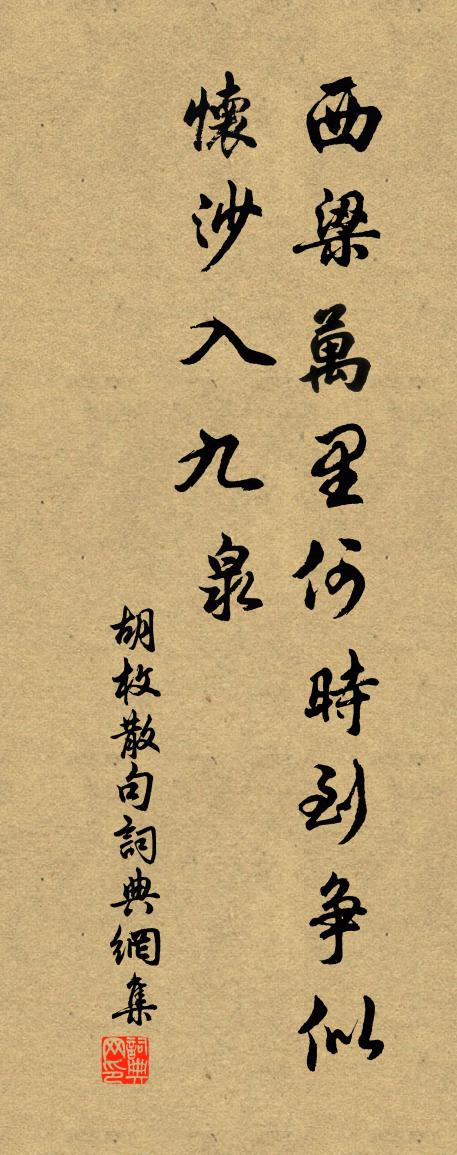 詩詞名句歷史字典書法欣賞書法字典國語詞典說文解字康熙字典古漢語字典標 題 作 者 詩 句 句作者:胡枚 朝代:宋代句原文西梁萬里何時到,爭似懷沙入九泉。詩詞問答問:句的作者是誰?答:胡枚問:句寫於哪個朝代?答:宋代胡枚句書法欣賞句書法作品詩詞推薦頌古六首釋鹹傑〔宋代〕一橈劈腦沒遮攔,大海波濤徹底乾。盡謂單傳並直指,誰知總被祖師謾。端午日楊時〔宋代〕悠悠南北各天涯,欲望鄉關眼已花。憶得親庭誰共語,應憐遊子未還家。送沈鶴賈島〔唐代〕家楚婿於秦,攜妻雲養親。陸行千里外,風卷一帆新。夜泊疏山雨,秋吟搗藥輪。蕪城登眺作,才動廣陵人。和石解元白蓮釋慧遠〔宋代〕玉女欹冠瑩夜塘,雪敷仙掌犯秋香。江南五月多風韻,素艷天資難點妝。清明值雨宋祁〔宋代〕有渰興芳序,餘寒惜慘悽。遠山沈向盡,雜樹望先迷。天闊都成暝,雲昏本自低。漂灰禁餘火,浮棗祓殘溪。檻篠偈頌一百二十三首釋普度〔宋代〕雲收海山橫,月印江天曉。擾擾紅塵中,青春有多少。鐵壁銀山一拶開,落花流水空徘徊。端禪人開田乞頌釋正覺〔宋代〕衲僧田地有來端,底意相攜出問檀。春塢耕開雲錦曉,月津劃破練光寒。飽期束肚三條篾,功就移身百尺竿。恰恰寄禪師寺華上人次韻三首戴叔倫〔唐代〕百年渾是客,白髮總盈顛。佛國三秋別,雲台五色連。朝盤香積飯,夜瓮落花泉。遙憶談玄地,月高人未眠。禪心黃無悔輓詞四首陳師道〔宋代〕敏慧仍江夏,風流更妙年。貧焚酒家券,病得里胥錢。精爽來鷹隼,清明瀉澗瀍。無兒傳素業,有淚徹黃泉。幽居陸游〔宋代〕翳翳桑麻巷,幽幽水竹居。紉縫一獠婢,樵汲兩蠻奴。雨挾清砧急,籬懸野蔓枯。鄰村有鬻子,吾敢嘆空無!題靈龜洞張安修〔宋代〕何年六丁驅霹靂,蒼龍驚起穿崖石。拿雷掣電卷波濤,來與真仙分窟宅。上崖窅深如偶瓮,下崖人谽谺如空洞。不高士詠楚狂接輿夫妻吳筠〔唐代〕接輿耽沖玄,伉儷亦真逸。傲然辭徵聘,耕績代祿秩。鳳歌誡文宣,龍德遂隱密。一游峨嵋上,千載保靈術。朱壽昌郎中少不知母所在刺血寫經求之五十年蘇軾〔宋代〕嗟君七歲知念母,憐君壯大心愈苦。羨君臨老得相逢,喜極無言淚如雨。不羨白衣作三公,不愛白日升青天。愛君雨中望蓬萊山張君房〔宋代〕重簾垂密雨,孤夢隔秋宮。紅爐九華暗,香消芳思融。仙忻望不及,鶴信遣誰通。但云許玉斧,寧知張巨公。西江月姬翼〔元代〕物里存亡有限,人生光景無多。不禁兩曜急銷磨。枉恁爭人競我。見解明如龜鏡,從渠辯若懸河。到頭無計避閻羅夜雨徐集孫〔宋代〕夜半倏驚覺,狂風攪秋鳴。掣電起迅雷,驟雨翻盆傾。逆知造物意,揫斂寶成。天威不竟夕,須臾山月明。柳子厚放鷓鴣詞首章日楚越有鳥甘且腴嘲自名鄭剛中〔宋代〕腸腹元無一字書,杯羹那敢嗜甘腴。廚人不用催煙火,已學羅池放鷓鴣。鷓鴣天·陌上柔桑破嫩芽辛棄疾〔宋代〕陌上柔桑破嫩芽,東鄰蠶種已生些。平岡細草鳴黃犢,斜日寒林點暮鴉。山遠近,路橫斜,青旗沽酒有人家。城中答章林伯劉克莊〔宋代〕自笑狂吟浪竊名,敢將孤壘敵長城。才高君策追風驃,計急吾陳背水兵,遠道書來如面見。異時序反托詩行。殘年雜曲歌辭。少年行二首王昌齡〔唐代〕西陵俠年少,送客過長亭。青槐夾兩路,白馬如流星。聞道羽書急,單于寇井陘。氣高輕赴難,誰顧燕山銘。走馬名句推薦草木雖無情,因依尚可生李白《樹中草》 好一似食盡鳥投林,落了片白茫茫大地真乾淨。曹雪芹《紅樓夢·第五回》 為者敗之,執者失之。老子《老子·道經·第二十九章》 池上柳依依,柳邊人掩扉。左緯《春晚》 為報今年春色好。花光月影宜相照。李清照《蝶戀花·上巳召親族》 今朝有酒今朝醉,明日愁來明日愁。羅隱《自遣》 倚杖柴門外,臨風聽暮蟬。王維《輞川閒居贈裴秀才迪》 如花美眷,似水流年曹雪芹《紅樓夢·第二十三回》 卦也者,著天下之時也。爻也者,效天下之動也。王通《中說·卷七·述史篇》 一生傲岸苦不諧,恩疏媒勞志多乖。李白《答王十二寒夜獨酌有懷》