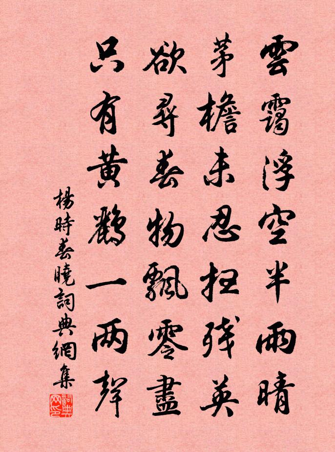 詩詞名句歷史字典書法欣賞書法字典國語詞典說文解字康熙字典古漢語字典標 題 作 者 詩 句 春曉作者:楊時 朝代:宋代春曉原文雲靄浮空半雨晴,茅檐未忍掃殘英。欲尋春物飄零盡,只有黃鸝一兩聲。詩詞問答問:春曉的作者是誰?答:楊時問:春曉寫於哪個朝代?答:宋代楊時春曉書法欣賞春曉書法作品詩詞推薦鵲橋仙(七夕)盧炳〔宋代〕餘霞散綺,明河翻雪。隱隱鵲橋初結。牛朗織女兩逢迎,□勝卻、人間歡悅。一宵相會,經年離別。此語真成浪說雜興宋祁〔宋代〕商君要術惟強國,孟子深心肯信書,大抵空言是糟粕,斲輪甘苦定何如。宿白馬津寄寇立沈亞之〔唐代〕客思聽蛩嗟,秋懷似亂砂。劍頭懸日影,蠅鼻落燈花。天外歸鴻斷,漳南別路賒。聞君同旅舍,幾得夢還家。蛙聲王炎〔宋代〕官蛙不問雨兼晴,閣閣無端聒耳鳴。對客自誇聞鼓吹,稚圭此語豈真情。杭州謝驛〔宋代〕誰把杭州曲子謳,荷花十里桂三秋。那知卉木無情物,牽動長江萬里愁。浣溪沙·風撼芳菲滿院香孫光憲〔五代〕風撼芳菲滿院香,四簾慵卷日初長,鬢雲垂枕響微鍠。春夢未成愁寂寂,佳期難會信茫茫。萬般心,千點淚,泣蘭七夕後一夜,月中露坐二首楊萬里〔宋代〕今古詩人愛月圓,未堪商略玉嬋娟。修眉半璧各自好,團鏡磨鎌俱可憐。一夜一般新樣出,幾回幾換為人妍。教渠念奴嬌遊子西〔宋代〕暑塵收盡,快晚來急雨,一番初過。是處涼飆回爽氣,直把殘雲吹破。星律飛流,銀河搖盪,只恐冰輪墮。雲梯穩減字木蘭花(和孔純老送鄭深道移守嚴州)王之道〔宋代〕金尊頻倒。照坐梅花清更好。春到長楊。寵拜三公入鄭莊。月城兩載。千里生靈蒙惠愛。舞徹歌詞。並立新妝綠帶苦雨虞儔〔宋代〕經時梅熟雨翻盆,老我無聊正杜門。日焙衣巾留白醭,年侵腰腳倦黃昏。掃除雲霧風無力,點滴軒楹漏有痕。入市【中呂】紅繡鞋_竹衫兒並刀喬吉〔元代〕竹衫兒並刀剪龍鬚為寸,玉絲穿龜背成文,襟袖清涼不沾塵。汗香晴帶雨,肩瘦冷搜雲,是玲瓏剔透人。浹背全無仲光寄紵袍晁補之〔宋代〕手裁白紵制新袍,犢鼻應憐犬子勞。倚仗衡門聊服此,良人身不屬臨洮。秋夕病中作李中〔唐代〕臥病當秋夕,悠悠枕上情。不堪拋月色,無計避蟲聲。煎藥惟憂澀,停燈又怕明。曉臨清鑒里,應有白髭生。獨步小園四首曾幾〔宋代〕只道江梅發不遲,最先零落使人悲。從今穠李花千樹,未抵前村雪一枝。送嚴上舍並寄諸公十首寄何解元陳造〔宋代〕舊識追風足,抵摧坂下車。長騎待雲路,小捷已鄉書。唾手須科第,差肩有詔除。公飲富佳句,記我渾樵漁。春聲碎(南浦送別自度腔)譚宣子〔宋代〕津館貯輕寒,脈脈離情如水。東風不管,垂楊無力,總雨顰煙寐。欄乾外。怕春燕掠天,疏鼓疊、春聲碎。劉郎易池州春送前進士蒯希逸杜牧〔唐代〕芳草復芳草,斷腸還斷腸。自然堪下淚,何必更殘陽。楚岸千萬里,燕鴻三兩行。有家歸不得,況舉別君觴。華山畿·啼著曙南朝民歌〔南北朝〕啼著曙,淚落枕將浮,身沉被流去。菩薩蠻·赤闌橋盡香街直陳克〔宋代〕赤闌橋盡香街直,籠街細柳嬌無力。金碧上青空,花晴簾影紅。黃衫飛白馬,日日青樓下。醉眼不逢人,午香吹暗秋夕書事陸游〔宋代〕寂寂青楓岸,蕭蕭白版扉。端居常嬾動,偶出卻忘歸。時泰徵科簡,師還驛置稀。江村日無事,煙火自相依。名句推薦當壚秦女,十五語如弦。賀鑄《行路難·縛虎手》 遇酒且呵呵,人生能幾何!韋莊《菩薩蠻·勸君今夜須沈醉》 四十年來家國,三千里地山河李煜《破陣子·四十年來家國》 金陵津渡小山樓,一宿行人自可愁。張祜《題金陵渡》 淇園春竹美,軍宴日椎牛。司馬光《送龔章判官之衛州·新及第》 桐花半畝,靜鎖一庭愁雨。周邦彥《瑣窗寒·寒食》 微吟不道驚溪鳥,飛入亂雲深處啼。沈周《題畫》 記得綠羅裙,處處憐芳草。賀鑄《綠羅裙·東風柳陌長》 我住長江頭,君住長江尾。李之儀《卜運算元·我住長江頭》 相州晝錦堂廚醞,衛國淇川岸竹萌。姜特立《雅志小飲適寬仲送相州法醞並竹萌同至》