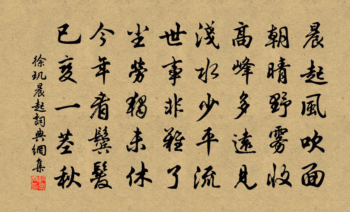 詩詞名句歷史字典書法欣賞書法字典國語詞典說文解字康熙字典古漢語字典標 題 作 者 詩 句 晨起作者:徐璣 朝代:宋代晨起原文晨起風吹面,朝晴野霧收。高峰多遠見,淺水少平流。世事非難了,塵勞獨未休。今年看鬢髮,已變一莖秋。詩詞問答問:晨起的作者是誰?答:徐璣問:晨起寫於哪個朝代?答:宋代徐璣晨起書法欣賞晨起書法作品詩詞推薦秋風二首杜甫〔唐代〕秋風淅淅吹巫山,上牢下牢修水關。吳檣楚柁牽百丈,暖向神都寒未還。要路何日罷長戟,戰自青羌連百蠻。中巴讀毛秘新新詩梅堯臣〔宋代〕毛公明於詩,其系宜善續。前示五長篇,大須傾幾曲。豈特元和間,咳唾成珠玉。林簽判輓詩葉適〔宋代〕作邑有何好,利民翻害身。怕回湘水月,驚失象台春。暮草已多碧,園花空復新。更嫌鶯自語,幽憤不勝陳。即事高蟾〔唐代〕三年離水石,一旦隱樵漁。為問青雲上,何人識卷舒。種梅李龍高〔宋代〕別嶺移根置小園,半鋤明月半鋤雲。世間下是無花卉,若個清高得似君。野眺即景鄧深〔宋代〕山晚餘紅照,林昏集眾鴉。泥深茭欲筍,水滿稻初花。燭丁謂〔宋代〕影抱銅芝直,光搖鑄鳳圓。叢花生木蓼,凝密墮金蓮。積貨徒供爨,當官竟不燃。曾窺司烜氏,明燧奉高天。滿江紅 懷子由作蘇軾〔宋代〕清穎東流,愁目斷、孤帆明滅。宦遊處、青山白浪,萬重千疊。孤負當年林下意,對床夜雨聽蕭瑟。恨此生、長向送焦浚明黃庭堅〔宋代〕西瞻岷山兮東望峨眉,錦江清且漣漪。地靈山秀誕豪傑,來入中州振羽儀。相如傲萬物,子云窮一經。黃金賣賦聘玉笥山李與〔宋代〕葛峰相對為文筆,蕭水迴環當墨池。說與晚衙休報事,長官亭上有新詩。冬夜與故友聚送吉校書李端〔唐代〕途窮別則怨,何必天涯去。共作出門人,不見歸鄉路。殷勤執杯酒,悵望送親故。月色入閒軒,風聲落高樹。雲霄紅梅花高似孫〔宋代〕帶雪匆匆別楚雲,天寒依約見湘君。只疑不合瑤池去,引得春風 * 分。次韻李士舉丈除夕王灼〔宋代〕暗燈延鼠輩,殘漏付雞人。柏酒浮三酌,蔬盤薦五辛。凍吟多累句,孤坐絕來賓。鏡里絲絲髮,平時六十春。景福東廂詩夜意司馬光〔宋代〕清夜四無嘩,深嚴上帝家。星翻珠綱白,斗掛玉樓斜。風靜虛成韻,霜輕未作花。還疑漢津客,浩蕩寄流槎。送李國史釋心月〔宋代〕父翁伯季忠清節,凜凜同班立聖朝。次第到孫孫又子,老僧屈指日非遙。詩一首石待問〔宋代〕平生無女只生兒,三子登科一子隨。家在白雲青嶂里,不求閒散待何時。紅窗迥侯善淵〔元代〕玄門尋,休胡覓。指汝等、修行端的。常清淨、意不浮游,保元精無失。煉陽魂,消陰質。兩眉間、神光飛出。通偈頌一百零一首釋慧性〔宋代〕爽氣生襟袂,清飈襲四維。白雲抱幽石,冷淡更清奇。玲瓏八面自回合,峭峻一方誰敢窺。題李八百洞符載〔唐代〕太極之年混沌坼,此山亦是神仙宅。後世何人來飛升,紫陽真人李八百。頌古一百則釋正覺〔宋代〕鳥之行空,魚之在水。江湖相忘,雲天得志。擬心一絲,對面千里。知恩報恩,人間几几。名句推薦不經一事,不長一智。佚名《增廣賢文·下集》 因風吹火,用力不多。佚名《增廣賢文·上集》 東指羲和能走馬,海塵新生石山下。李賀《天上謠》 教民親愛,莫善於孝。孔子及其弟子《孝經·廣要道》 凡與敵戰,其將愚而不知變,可誘之以利。佚名《百戰奇略·第五卷·利戰》 人生如逆旅,我亦是行人。蘇軾《臨江仙·送錢穆父》 千里鶯啼綠映紅,水村山郭酒旗風。杜牧《江南春》 一騎紅塵妃子笑,無人知是荔枝來。杜牧《過華清宮絕句三首》 世間無限丹青手,一片傷心畫不成。高蟾《金陵晚望》 是節東籬菊,紛披為誰秀。杜甫《九日寄岑參》