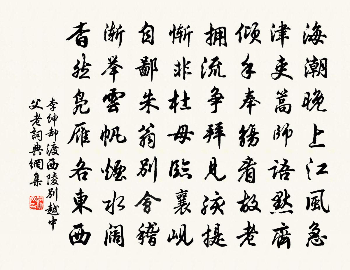 詩詞名句歷史字典書法欣賞書法字典國語詞典說文解字康熙字典古漢語字典標 題 作 者 詩 句 卻渡西陵別越中父老作者:李紳 朝代:唐代卻渡西陵別越中父老原文海潮晚上江風急,津吏篙師語默齊。傾手奉觴看故老,擁流爭拜見孩提。慚非杜母臨襄峴,自鄙朱翁別會稽。漸舉雲帆煙水闊,杳然鳧雁各東西。詩詞問答問:卻渡西陵別越中父老的作者是誰?答:李紳問:卻渡西陵別越中父老寫於哪個朝代?答:唐代問:卻渡西陵別越中父老是什麼體裁?答:七律李紳卻渡西陵別越中父老書法欣賞卻渡西陵別越中父老書法作品注釋全唐詩:卷482-2詩詞推薦山居雜詩九十首曹勛〔宋代〕農人作田務,耘者最辛苦。肘膝伏泥塗,拔莠連茹取。所拔隨已多,悉釀所伏處。惟冀禾稻肥,豈問正炎暑。禪人並化主寫真求贊釋正覺〔宋代〕貌古而孤,氣清而癯。秋生林壑,月在江湖。見道之體盈而虛,隨世之用有而無。佛佛祖祖,只個規模。題春江漁父圖楊維楨〔元代〕一片青天白鷺前,桃花水泛住家船。呼兒去換城中酒,新得槎頭縮項鯿。嘲鷺方岳〔宋代〕曾有詩矜白鷺閒,一生詩眼乞山漫。朝來更覺忙於我,雪沍蒼溪不道寒。賀監宅王炎〔宋代〕輕解金龜呼酒徒,卻問君王求鑑湖。歸來蹁躚著鶴氅,自辦米帛供妻孥。鸞驂一去杳無跡,數畝荒園生草棘。惟有蒙恩易鎮豫章丐假還鄉途中偶成十七首吳芾〔宋代〕蒼崖崛地聳,飛瀑從天下。一嶺跨兩州,千年無九夏。奉和聖制送張說上集賢學士賜宴(賦得西字)韋抗〔唐代〕廣庭臨璧沼,多士侍金閨。英宰文儒葉,明君日月齊。集賢光首拜,改殿發新題。早夏初移律,餘花尚拂溪。壺觴頌古釋道顏〔宋代〕洗腳處更不安排,側聆時非是啗啄。趙州臨濟二老人,相見何曾不註腳。梅花引蘇小小墓朱彝尊〔清代〕小溪澄,小橋橫,小小墳前松柏聲。碧雲停,碧雲停,凝想往時,香車油壁輕。 溪流飛遍紅襟鳥,橋頭生遍紅心贈柳三解晁說之〔宋代〕海角那知有宮柳,故園春思尚依依。可憐風韻去人遠,一日花開天際飛。感二鳥梅堯臣〔宋代〕雄雌雙好鳥,托棲空樹中。有蛇出傍穴,噴毒氣如虹。半夜此驚飛,瞥目隨西東。有喙不能達,啼雲復嘯風。迴翔偈頌一百四十一首釋師範〔宋代〕谷熟豆熟,粥足飯足。仰面看天,兩手捫腹。寄題林憲景思雪巢趙蕃〔宋代〕雪堂竟向雪中成,四壁紛紛灑雪霙。春秋記事有成法,匪同風月徒虛名。雪巢之雪竟何許,豈角主人清且苦。長鑱和潞公游天章楚諫議園宅司馬光〔宋代〕名卿新治第,上宰舊連牆。槐蔭青青葉,星鄰兩兩光。林花裂錦狹,門路築沙長。共引庭間水,交生壁外篁。魚窺書懷絕句陸游〔宋代〕丈人祠西山谷盤, * 洞前松櫟寒。仙翁欲覓渺無處,聞在青溪浴大丹。擬白樂天詩晃逈〔宋代〕權要亦在苦,苦在當憂責。閒慢亦有樂,樂在無縈迫。戈文雪景圖唐寅〔明代〕柴門深閉蕷徐煨,沽得鄰家村釀來。白髮衰頹聊遺歲,山妻稚子笑顏開。橫浦十詠周程三先生書院劉黻〔宋代〕千載斯文冷,先生以道鳴。山川師友趣,日月弟兄情。門靜一松在,源深雙浦橫。兒童游里巷,猶喜說周程。奉和襲美題達上人藥圃二首陸龜蒙〔唐代〕藥味多從遠客齎,旋添花圃旋成畦。三椏舊種根應異,九節初移葉尚低。山莢便和幽澗石,水芝須帶本池泥。從今又過妙智寺後因賦董嗣杲〔宋代〕我貌甚癯棘,極愛山林住。才說廬山去,不憚葺芒屨。郁懷得少解,動腳即健步。誰言多岌業,堂堂大驛路。萬景名句推薦馬駭輿,則君子不安輿;庶人駭政,則君子不安位。荀子《荀子·王制》 物是人非事事休,欲語淚先流。李清照《武陵春·春晚》 人方為刀俎,我為魚肉司馬遷《史記·項羽本紀》 東風動百物,草木盡欲言。李白《長歌行》 尋思不似鵲橋人,猶自得、一年一度。趙以夫《鵲橋仙·富沙七夕為友人賦》 喜得故人同待詔,擬沽春酒醉京華。高啟《清明呈館中諸公》 記年時、舊宿淒涼,暮煙秋雨野橋寒。吳文英《霜花腴·重陽前一日泛石湖》 為川者決之使導,為民者宣之使言。左丘明《國語·周語·邵公諫厲王弭謗》 記得別伊時,桃花柳萬絲。納蘭性德《菩薩蠻·新寒中酒敲窗雨》 紅豆生南國,春來發幾枝。王維《相思》