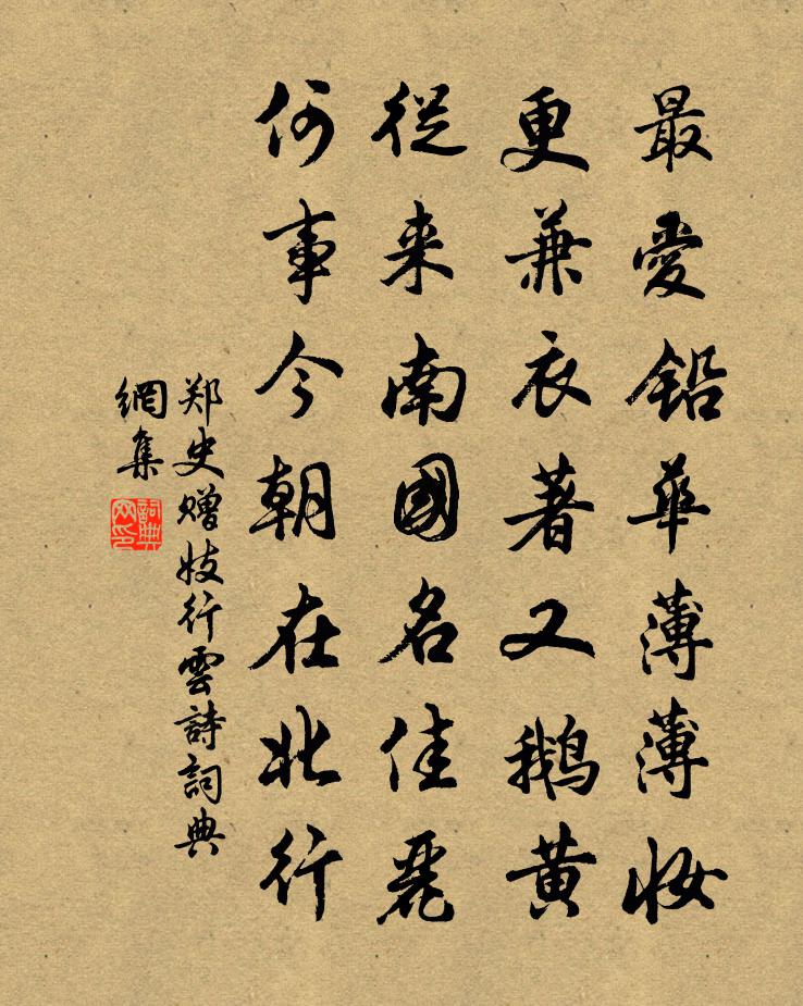 詩詞名句歷史字典書法欣賞書法字典國語詞典說文解字康熙字典古漢語字典標 題 作 者 詩 句 贈妓行雲詩作者:鄭史 朝代:唐代贈妓行雲詩原文最愛鉛華薄薄妝,更兼衣著又鵝黃。從來南國名佳麗,何事今朝在北行。詩詞問答問:贈妓行雲詩的作者是誰?答:鄭史問:贈妓行雲詩寫於哪個朝代?答:唐代問:贈妓行雲詩是什麼體裁?答:七絕鄭史贈妓行雲詩書法欣賞贈妓行雲詩書法作品注釋全唐詩:卷542-15詩詞推薦杏林春燕唐寅〔明代〕紅杏梢頭掛酒旗,綠楊枝上轉黃驪。鳥聲花影留人住,不賞東風也是痴。迎燕葛天民〔宋代〕咫尺春三月,尋常百姓家。為迎新燕入,不下舊簾遮。翅濕沾微雨,泥香帶落花。巢成雛長大,相伴過年華。寄中書劉舍人韋應物〔唐代〕雲霄路竟別,中年跡暫同。比翼趨丹陛,連騎下南宮。佳詠邀清月,幽賞滯芳叢。迨予一出守,與子限西東。晨露起淨慈方丈釋如淨〔宋代〕方方一丈牯牛欄,佛祖驅來要透關。聊借眉 * 架搆,遮天蓋地黑漫漫。戊戌冬仆客桂林雪中趙叔愚書張司業逢賈島絕樂雷發〔宋代〕朔風於水浸瓊沙,曾共騷翁理釣槎。對酒又吟端木葉,論詩還憶款冬花。飢能驅我瓶儲罄,老不饒人鏡影華。擬喚點絳唇(和鄧中甫晚春)劉辰翁〔宋代〕燕子池塘,亂紅過盡鞦韆晚。絮飛欲倦。正是簾初卷。睡起無情,猶道天涯遠。羞勻面。乍驚紅淺。夢自無人見。聽劉尊師彈琴曹鄴〔唐代〕曾於清海獨聞蟬,又向空庭夜聽泉。不似齋堂人靜處,秋聲常在七條弦。和劉後村雜興胡仲弓〔宋代〕近學時妝越樣新,空遺畎畎處忠臣。燭之武老未為老,劉伯龍貧可是貧。造物不應推若輩,江山亦合助詩人。掛冠和聖俞百花洲二首歐陽修〔宋代〕野岸溪幾曲,松蹊穿翠陰。不知芳渚遠,但愛綠荷深。木綿怨方回〔宋代〕湖山一笑乾坤破,欺孤弱寡成遷播。不念六宮將北行,太師雙擁嬋娟臥。甬東香艷到漳南,爭看並蒂芙蓉過。天兵八月二十五日聞布新條舒岳祥〔宋代〕民命無魂鹿,烹庖幾日休。紛紛渾未悟,炯炯為深憂。並和隣舂相,分漁步網收。聊為目前計,翁碗汲新篘。丫頭岩史彌寧〔宋代〕山前露立幾時休,老大垂髫羞不羞。與汝雲冠別梳洗,免教人喚作丫頭。無題陸游〔宋代〕畫閣無人晝漏稀,離悰病思兩依依。釵梁雙燕春先到,箏柱羈鴻暖不歸。迎得紫姑占近信,裁成白紵寄征衣。晚來枕上懷盧進齋顧逢〔宋代〕三載吳庠住,何由再合併。老來情不捨,枕上夢頻成。撼樹風終夜,敲窗雨數聲。每思湖上酒,無日不同傾。江神子/江城子李曾伯〔宋代〕白妃卷絮逐風顛。透朱簾。向空漫。剪出冰花,偏愛臘前看。能費化工多少力,千萬里,盡同天。歌樓清賞記當年後園雙松李復〔宋代〕群木喜春妍,凋落寒霜苦。昂藏兩大夫,森然須鬣古。堅姿不可回,正色少媚嫵。清風發好音,和氣琴中語。東谷樓鑰〔宋代〕舊說東柯谷,茲來到此山。樹深煙冉冉,花落雨潺潺。有客禮師塔,何人叩祖關。天連秋水遠,此意尚人間。東宮生日六首癸巳林光朝〔宋代〕昭代璿源遠,高秋寶月前。神光浮蜀道,瑞氣貫秦川。銀榜應如舊,金莖若個邊。龍樓清晝出,鶴禁彩雲連。妙選別權滬帥朱杞材太社李曾伯〔宋代〕猶記沖寒泝峽來,相期偕至亦偕回。朝廷有詔許歸老,藩岳無人值借才。雇我凋年嗟已矣,如君英略勉之哉。度滬次韻和厚卿答微之韓維〔宋代〕秉節當官號直清,非招不往為虞旌。書聞玉座光儒效,任久琳宮長道情。老縱筆鋒尤壯健,醉評花艷益精明。吾人名句推薦賈傳自憐多感慨,東門何意泥孤虛。王惲《送姬仲實隱士北還》 酒後競風采,三杯弄寶刀。李白《白馬篇》 雨余溪水掠堤平,閒看村童謝晚晴。陸游《觀村童戲溪上》 小人肥口,君子肥身。佚名《增廣賢文·下集》 此身如傳舍,何處是吾鄉。蘇軾《臨江仙·送王緘》 今日樓台鼎鼐,明年帶礪山河辛棄疾《西江月·堂上謀臣尊俎》 露下旗濛濛,寒金鳴夜刻。李賀《塞下曲》 金風玉露一相逢,便勝卻人間無數。秦觀《鵲橋仙·纖雲弄巧》 君子而詐善,無異小人之肆惡;君子而改節,不若小人之自新。洪應明《菜根譚·概論》 獨舞紛如雪,孤飛曖似雲。陳子昂《詠主人壁上畫鶴寄喬主簿崔著作》