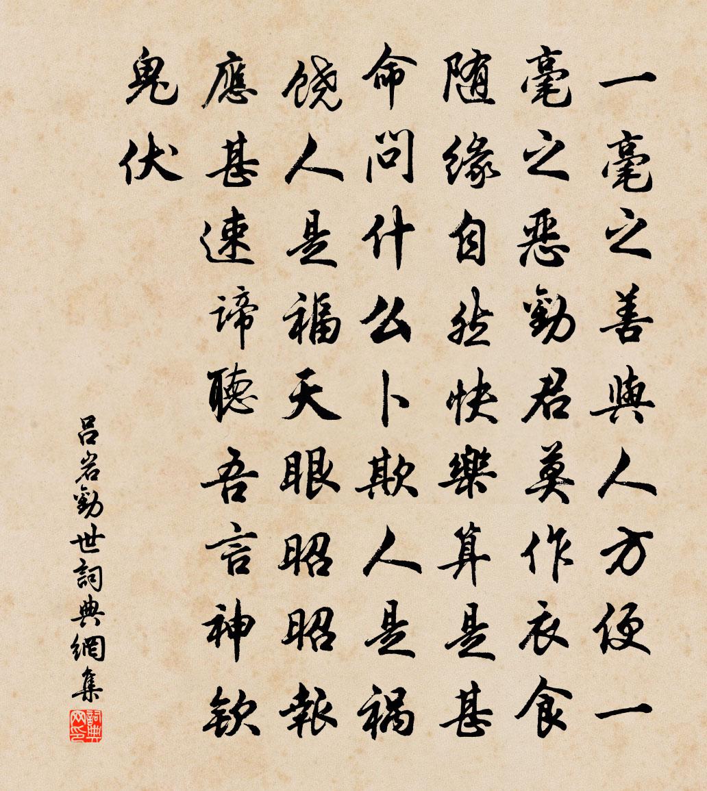 詩詞名句歷史字典書法欣賞書法字典國語詞典說文解字康熙字典古漢語字典標 題 作 者 詩 句 勸世作者:呂岩 朝代:唐代勸世原文一毫之善,與人方便。一毫之惡,勸君莫作。衣食隨緣,自然快樂。算是甚命,問什麼卜。欺人是禍,饒人是福。天眼昭昭,報應甚速。諦聽吾言,神欽鬼伏。詩詞問答問:勸世的作者是誰?答:呂岩問:勸世寫於哪個朝代?答:唐代問:勸世是什麼體裁?答:四古呂岩勸世書法欣賞勸世書法作品注釋全唐詩:卷858-47詩詞推薦松曾極〔宋代〕匯進 * 卒召戎,萌芽培養自熙豐。當時手植留遺愛,只有岩前十八公。雪寒圍爐小集范成大〔宋代〕席簾紙閣護香濃,說有談空愛燭紅。高飣膻根澆杏酪,旋融雪汁煮松風。康年氣象冬三白,浮世功名酒一中。無事陳寔徐鈞〔宋代〕世多揚激伯夷隘,公獨謙虛下惠和。吊死自慚知己少,逃生卻喜活人多。七夕舒岳祥〔宋代〕河似琉璃底,水行空影中。槎浮應恍惚,星會恐朦朧。七月初七夜,一年須一逢。經躔那有此,吾欲問天公。挽於湖沈端節〔宋代〕荒城難訪十全醫,半篋遺書世共悲。寧有故人憐阿騖,但余息女類文姬。忠籌屢畫平戎策,宦跡常留墮淚碑。醉扣偶成二首王安石〔宋代〕漸老偏諳世上情,已知吾事獨難行。脫身負米將求志,肋力求田豈為名。高論頗隨衰俗之,壯懷難值故人傾。相逢詠竹風張玉孃〔宋代〕滿庭修竹動秋風,掠地無痕一徑通。景弄綠窗金瑣碎,聲歸定瑟玉玲瓏。流雲不礙湘妃佩,隔水還疑蔡女桐。曲輕句岑參〔唐代〕初程莫早發,且宿灞橋頭。第二百零二卷哭故主人陳太師李中〔唐代〕十年孤跡寄侯門,入室升堂忝厚恩。游遍春郊隨茜旆,飲殘秋月待金尊。車魚鄭重知難報,吐握周旋不可論。長慟雨過至城西蘇家黃庭堅〔宋代〕飄然一雨灑青春,九陌淨無車馬塵。漸散紫煙籠帝闕,稍回晴日麗天津。花飛衣袖紅香濕,柳拂鞍韉綠色勻。管領玉樓春·燕雕樑畫棟原宋徵輿〔清代〕燕雕樑畫棟原無數,不問主人隨意住。紅襟惹盡百花香,翠尾掃開三月雨。半年別我歸何處?相見如將離恨訴。海水調歌頭汪莘〔宋代〕誰與玩芳草,公子未西歸。天然脫去雕飾,秋水落芙蕖。發軔朝兮東壁,弭節夕兮西極,故國入躊躇。夢裡不知路送元上人歸寧魏野〔宋代〕禪性雖無著,偏親奈白頭。直應飛錫到,方是倚門休。雪裡猶思去,花前豈易留。如何迎侍得,住近免離愁。四月十三日曉夢入試枕上口占蘇泂〔宋代〕百花開盡蝶蜂去,繞屋團團杏葉陰。除卻平生我與我,世上誰人誰此心。和范景仁王景彝殿中雜題三十八首並次韻其十梅堯臣〔宋代〕人間詩癖勝錢癖,搜尋肝脾過幾春。囊橐無嫌貧似舊,風騷有喜句多新。但將苦意摩層宙,莫計終窮涉暮津。試看冬至贈潘郎二首張耒〔宋代〕五更人語起江城,歌笑喧喧天欲明。酌酒壽君但一醉,百年珍重是人情。偈頌二百零五首釋正覺〔宋代〕深明無底,靈異無根。案山行盡,不見有家。識浪瀝乾,不見有己。石女掣開金鎖鑰,木人撥動玉輪機。方信道從看花呈子華內翰歐陽修〔宋代〕老雖可憎還可嗟,病眼眵昏愁看花。不知花開桃與李,但見紅白何交加。春深雨露新洗濯,日暖金碧相輝華。浮香秋夜玩月懷玉霄道士貫休〔唐代〕光異磨礱出,輪非雕斫成。今宵剛道別,舉世勿人爭。征婦砧添怨,詩人哭到明。惟宜華頂叟,笙磬有餘聲。次友人寒食書懷韻二首張元乾〔宋代〕往昔昇平客大梁,新煙然燭九衢香。車聲馳道內家出,春色禁溝宮柳黃。陵邑只今稱虜地,衣冠誰復問唐裝。傷心名句推薦故人應念,杜鵑枝上殘月。文天祥《酹江月·和友驛中言別》 八月寒葦花,秋江浪頭白。李頎《送劉昱》 不聞不若聞之,聞之不若見之,見之不若知之,知之不若行之。荀子《荀子·儒效》 若要俏,添重孝。馮夢龍《警世通言·卷三十五》 遙知獨聽燈前雨,轉憶同看雪後山。納蘭性德《於中好·送梁汾南還為題小影》 無論習何等業,總不可有粗浮心。王永彬《圍爐夜話·第三五則》 我亦且如常日醉,莫教弦管作離聲。歐陽修《別滁》 對山河百二,淚盈襟血。王清惠《滿江紅·題南京夷山驛》 且就洞庭賒月色,將船買酒白雲邊。李白《游洞庭湖五首·其二》 巧匠目意中繩,然必先以規矩為度韓非及後人《韓非子·有度》