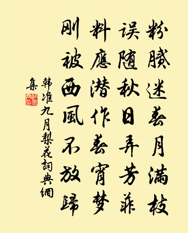 詩詞名句歷史字典書法欣賞書法字典國語詞典說文解字康熙字典古漢語字典標 題 作 者 詩 句 九月梨花作者:韓準 朝代:宋代九月梨花原文粉膩迷春月滿枝,誤隨秋日弄芳菲。料應潛作春宵夢,剛被西風不放歸。詩詞問答問:九月梨花的作者是誰?答:韓準問:九月梨花寫於哪個朝代?答:宋代韓準九月梨花書法欣賞九月梨花書法作品詩詞推薦龍州秀嶺陶弼〔宋代〕路隨雲磴石梯行,限隔華夷天意明。自與大君為外屏,何功諸將作長城。福民可拜三公爵,壽聖能呼萬歲聲。海國戲題盱眙邵明府壁韋鵬翼〔唐代〕豈肯閒尋竹逕行,卻嫌絲管好蛙聲。自從煮鶴燒琴後,背卻青山臥月明。和光亭二首郭印〔宋代〕川原萬草木,總放無量光。要識和同意,乾坤不閟藏。敗荷王鎡〔宋代〕葉無圓影柄無香,收盡蓮歌冷碧塘。一片傷心雲錦地,也曾遮月宿鴛鴦。四賓主主中賓釋正覺〔宋代〕御樓吹角六街明,金馬將軍出禁城。閫外化權良有準,不傷風物致昇平。題採石蛾眉山佚名〔宋代〕一島烽煙斡怒流,烯犀捉月兩悠悠。蛾眉中劃三千丈,不著人間半點愁。獨足台楊修〔宋代〕鳥跡分明在帝台,管弦聲里輒書來。回頭一覺風流夢,猶得朱門傍水開。桃花李中〔唐代〕只應紅杏是知音,灼灼偏宜間竹陰。幾樹半開金谷曉,一溪齊綻武陵深。艷舒百葉時皆重,子熟千年事莫尋。誰步哀蜀人為南蠻俘虜五章。入蠻界不許有悲泣之聲雍陶〔唐代〕雲南路出陷河西,毒草長青瘴色低。漸近蠻城誰敢哭,一時收淚羨猿啼。戲同舍與內競陳宗遠〔宋代〕龍泉函氣清,歐冶吐霞綺。干將墮龜文,莫邪潛漫理。藏鋒金匣夜光芒,銅花玉暈相磨砥。雄雌一落東與西,相從海棠一夜為風吹盡三首姚勉〔宋代〕翠底紅嬌得幾時,不甘飛動雪胭脂。問天借醒書窗眼,為報東風且慢吹。題清音亭徐沖淵〔宋代〕人間絲竹競哇淫,只有清流解洗心。試論此山泉石看,茂林修竹勝山陰。史氏南軒梅堯臣〔宋代〕庭中碧石盎,上結三重山。飛光入酒杯,舞翠生髻鬟。竹林眠黃麞,莎徑欠白鷳。主人無倦情,窗戶不須關。亦好園江梅變紅仲文季直二弟有詩因次韻喻良能〔宋代〕蕭蕭亦好耐寒枝,天與風流一段奇。刻玉不惟工傲雪,施朱端欲妙凝脂。佳人赬頰今才見,公子酡顏頃未知。便好敬和崔尚書大明朝堂雨後望終南山見示之作蘇頲〔唐代〕奕奕輕車至,清晨朝未央。未央在霄極,中路視鹹陽。委曲漢京近,周回秦塞長。日華動涇渭,天翠合岐梁。五丈答吳□和梅百詠劉克莊〔宋代〕□□空疏不擬傳,安知騰播累諸賢。即今同社幾千首,當日孤山止一聯。眼飽誑他忍飢腹,句寒聳我□吟肩。未知頌古三十一首釋如本〔宋代〕日面月面,靈光洞現。大地山河,南州北縣。雖是老婆心切,那知疑殺監院。贈從弟司庫員外絿王維〔唐代〕少年識事淺,強學乾名利。徒聞躍馬年,苦無出人智。即事豈徒言,累官非不試。既寡遂性歡,恐招負時累。清冬九日四首李石〔宋代〕昔人臥聽門前酒,我亦坐看籬下花。不是雨多門自掩,情知歲惡酒難賒。人生幾何行釋文珦〔宋代〕人生能幾何,百年三萬日。一半睡中消,余壽或難必。鐘鼎與軒裳,總是牢籠物。貪夫所甘心,宛轉無由出。富貴名句推薦春朝物候妍,愁婦鏡台前。鄭愔《春怨》 百囀無人能解,因風飛過薔薇。黃庭堅《清平樂·春歸何處》 如切如磋,如琢如磨。佚名《淇奧》 驚鳥去無際,寒蛩鳴我傍。馬戴《楚江懷古三首》 回頭流水小橋東,煙掃畫樓出。雷應春《好事近·梅片作團飛》 念天地之悠悠,獨愴然而涕下。陳子昂《登幽州台歌》 授書不在徒多,但貴精熟王陽明《傳習錄·卷下·右南大吉錄》 明主思短而益善,暗主護短而永愚。吳兢《貞觀政要·卷二·論求諫》 盤飧市遠無兼味,樽酒家貧只舊醅。杜甫《客至》 觸簾風送景陽鍾,鴛被繡花重。顧敻《虞美人·觸簾風送景陽鍾》