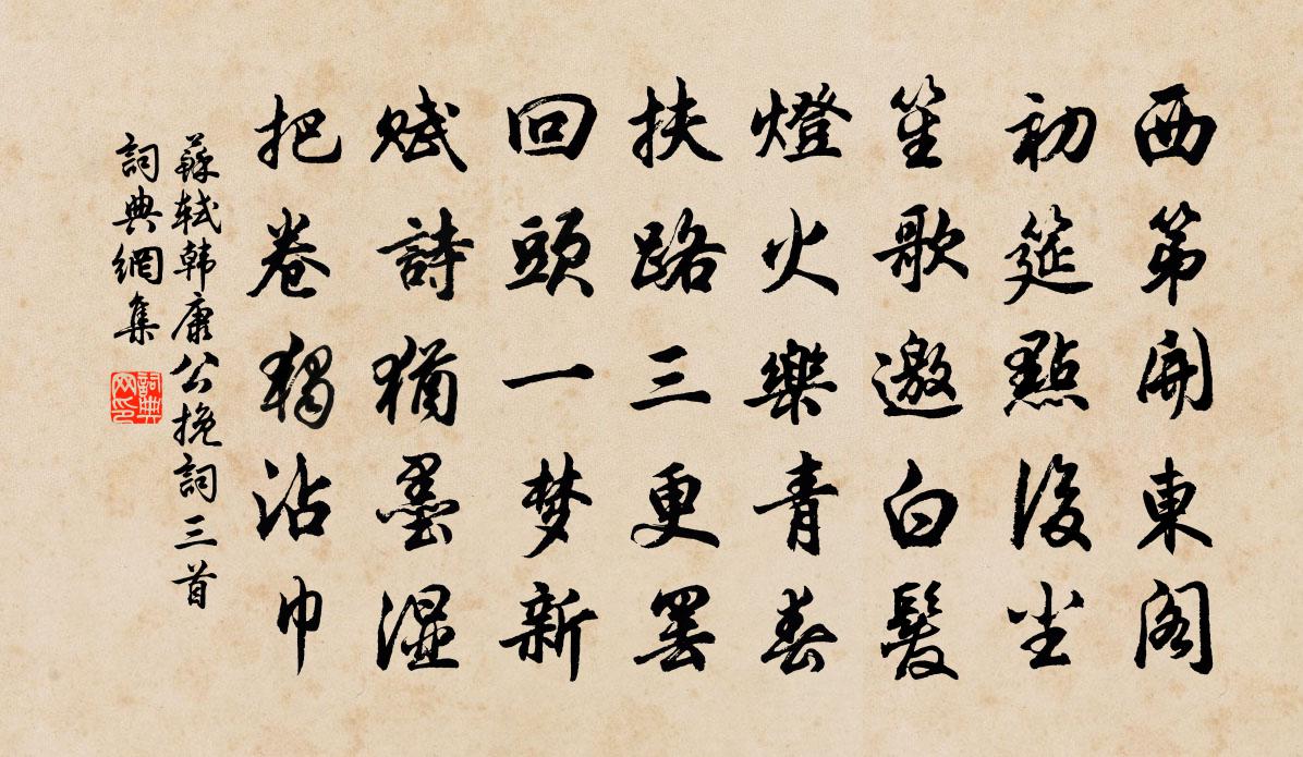 詩詞名句歷史字典書法欣賞書法字典國語詞典說文解字康熙字典古漢語字典標 題 作 者 詩 句 韓康公輓詞三首作者:蘇軾 朝代:宋代韓康公輓詞三首原文西第開東閣,初筵點後塵。笙歌邀白髮,燈火樂青春。扶路三更罷,回頭一夢新。賦詩猶墨濕,把卷獨沾巾。詩詞問答問:韓康公輓詞三首的作者是誰?答:蘇軾問:韓康公輓詞三首寫於哪個朝代?答:宋代問:蘇軾的名句有哪些?答:蘇軾名句大全蘇軾韓康公輓詞三首書法欣賞韓康公輓詞三首書法作品詩詞推薦減字木蘭花王觀〔宋代〕花筵布巧。綠繞紅□花枝鬧。朵朵風流。好向尊前插滿頭。此花妖艷。願得年年長相見。滿勸金鍾。祝壽如花歲歲青玉案元好問〔金代〕熙春台下花無數。紅紫映桃溪路。蝶往蜂來知幾許。翠筠亭外,綠楊堤畔,時聽嬌鶯語。綺筵羅列開尊俎。總是神送程給事知越州鄭穆〔宋代〕菟符優寄寵清賢,邸吏相驚印紱鮮。方面幾稱良太守,名區今作小神仙。夏王古穴幽藏怪,賀監明湖泠浸天。為語江亭夜坐白玉蟾〔宋代〕月冷松寒露滿襟,天容紺碧鶴聲沉。夜深獨把闌乾拍,只有長江識此心。彥雋母挽章二首陳東〔宋代〕人生五福古難全,天賦夫人獨不偏。內行無慚詩婦孝,母儀何啻穆姜賢。庭幃已嘆芳魂獨,宗族空留舊事傳。惟有送李寺丞宰藍田韓維〔宋代〕君誠岩壑徒,出宰亦山縣。尚喜終南峰,蒼翠不去眼。春風吹徵車,千里度灞滻。到日勝事繁,花光老秦甸。寄題吳子似所居二首讀書亭陳文蔚〔宋代〕古人花不可見,花千卷留遺編。要非紙上語,至理實參前。列聖精微心,舍此將何傳。極本會於一,枝葉數萬千。斅顏魯公送挺贇歸翠微寺盧綸〔唐代〕挺贇惠學該儒釋,袖有顏徐真草跡。一齋三請紀行詩,誚我垂鞭弄鳴鏑。寺懸金榜半山隅,石路荒涼松樹枯。虎跡立春帖子太上皇帝閣周必大〔宋代〕青陽布治周三紀,黃屋非心正九年。聖子有為今出震,天公不宰舊乘乾。出汴過淮有作李彌遜〔宋代〕十年猶愧飽侏儒,卻到淮山識舊途。一櫂輕於堂上芥,此身閒似不中鳧。受風帆影隨南北,弄日雲容自有無。不用別外甥楊克一二首張耒〔宋代〕東南秋雨足,澤國水連天。日出數聲雁,風高何處船。寒葅初獲韭,野餉屢烹鮮。吾事無淹速,悠悠得醉眠。午日處州禁競渡湯顯祖〔明代〕獨寫菖蒲竹葉杯,蓬城芳草踏初回。情知不向甌江死,舟楫何勞吊屈來。示日本智光禪人釋智愚〔宋代〕隱隱孤帆絕海來,虛空消殞鐵山摧。大唐國里無知識,已眼當從可處開。逍遙詠宋太宗〔宋代〕乾關萬象審消停,子母相傳日月精。產藥要教千日化,玄門全藉五行清。靈胎脫體方知聖,鉛汞梯媒不是名。金鼎寒夕陸游〔宋代〕夜扣銅壺徹旦吟,了無人會此時心。燈殘焰作孤螢小,火冷灰如積雪深。風急江天無過雁,月明庭戶有疏碪。此身夕雨陸游〔宋代〕獨夜初傳漏,空齋半掩扉。候蟲燈下語,水鳥雨中歸。客舍愁彈劍,京塵怯化衣。故人招隱意,字字莫相違。別汪翔甫吳式賢方回〔宋代〕天寒歲雲暮,策馬欲何之。叩戶元無事,開襟莫更疑。可輕千里別,不話一番詩。今代能吟者,吾曹外有誰。烏夜啼佚名〔宋代〕一彎月掛危樓。似藏鉤。醉里不知黃葉、報新秋。征鴻斷。歸雲亂。遠峰愁。愁見綠楊凝恨、在江頭。沽酒利登〔宋代〕有錢但沽酒,莫買南山田。勾引催租人,驚散青松煙。頌古二十七首釋雲賁〔宋代〕血盆似口劍如牙,竭世樞機未足夸。親到龍潭龍不現,者回失卻眼中花。名句推薦屋漏者民去之,水淺者魚逃之,樹高者鳥宿之,德厚者士趨之劉向《說苑·談叢》 凡德者,以無為集,以無欲成,以不思安,以不用固。韓非及後人《韓非子·解老》 四寸之管無當,必不滿也。授官、予爵、出祿不以功,是無當也。商鞅《商君書·靳令》 謗書盈篋不復辯,脫身來看江南山。謝逸《送董元達》 可惜一溪風月,莫教踏碎瓊瑤。蘇軾《西江月·頃在黃州》 佳人應怪我,別後寡信輕諾。柳永《尾犯·夜雨滴空階》 十有九人堪白眼,百無—用是書生。黃景仁《雜感》 相思本是無憑語,莫向花箋費淚行。晏幾道《鷓鴣天·醉拍春衫惜舊香》 碧虛無雲風不起,山上長松山下水。劉禹錫《八月十五夜桃源玩月》 春風試手先梅蕊,頩姿冷艷明沙水。趙令畤《菩薩蠻·春風試手先梅蕊》