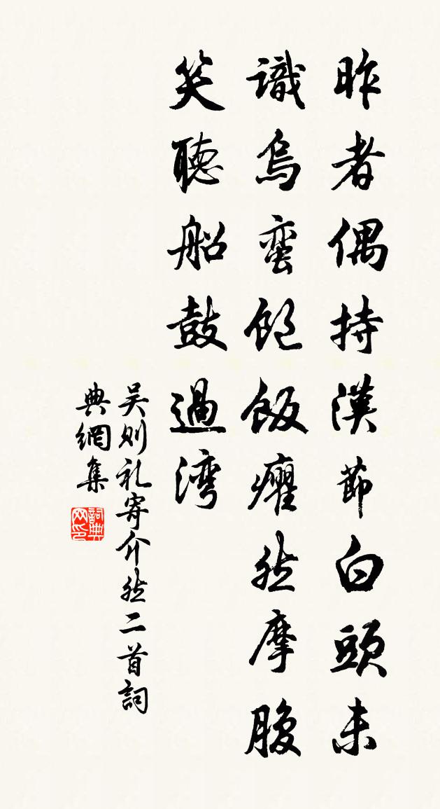 詩詞名句歷史字典書法欣賞書法字典國語詞典說文解字康熙字典古漢語字典標 題 作 者 詩 句 寄介然二首作者:吳則禮 朝代:宋代寄介然二首原文昨者偶持漢節,白頭未識烏蠻。飽飯癯然摩腹,笑聽船鼓過灣。詩詞問答問:寄介然二首的作者是誰?答:吳則禮問:寄介然二首寫於哪個朝代?答:宋代吳則禮寄介然二首書法欣賞寄介然二首書法作品詩詞推薦登沃州山耿湋〔唐代〕沃州初望海,攜手盡時髦。小暑開鵬翼,新蓂長鷺濤。月如芳草遠,身比夕陽高。羊祜傷風景,誰雲異我曹。寄題石都尉林亭魏野〔宋代〕園林都尉宅,景好冠京華,便合名金谷,其如是石家。池塘分御水,樓閣見宮花。有客因來說,令人動嘆嗟。紹興以後蜡祭四十二首佚名〔宋代〕蕩蕩困決,氣清泬寥。彷佛象興,麗於穹霄。蹇其來下,肅然風票。神乎安留,於焉消搖。警世唐寅〔明代〕世事如舟掛短篷,或移西岸或移東。幾回缺月還圓月,數陣南風又北風。歲久人無千日好,春深花有幾時紅。是非擬古於石〔宋代〕東籬有佳菊,埋沒野草傍。草蔓日以滋,菊苗日以荒。生意幾欲息,菊短草何長。深秋嚴霜下,百草不復芳。采采惜花一首蘇籀〔宋代〕豁眼桃紅思聖解,襲人蘭郁比修能。面脂靡曼負塗澤,繪彩化工夸斲冰。茜粲芳穠觸吟境,艷陽風色嗾狂朋。傾壺雜曲歌辭。相府蓮佚名〔唐代〕夜聞鄰婦泣,切切有餘哀。即問緣何事,征人戰未回。顧王遺址易時敏〔宋代〕遠樹芊芊暮靄平,顧王曾此保孤城。雷封已並田同井,煙爨猶疑灶滿營。當代貔貅誰削跡,芳春杜宇自呼名。黍離南歸阻雪孟浩然〔唐代〕我行滯宛許,日夕望京豫。②曠野莽茫茫,鄉山在何處?孤煙村際起,歸雁天邊去。積雪覆平皋,飢鷹捉寒兔。③新遷書齋頗為清曠偶書呈全董二秀才並示倒良司馬光〔宋代〕長夏暑候濁,雲火高巑岏。豈徒肌骨煩,木卷川流乾。新居得南齋,楹檻稍虛寬。森羅對草樹,曉暮清陰寒,汛掃挽孫府君二首劉宰〔宋代〕雁序均同氣,鴒原見此情。數椽忘爾汝,一飽共孤惸。綠綬方娛侍,黃粱已夢驚。無人知倚伏,風樹慘佳城。齊天樂(臨江道中)楊 * 〔宋代〕護霜雲澹蘭皋暮,行人怕臨昏晚。皓月明樓,梧桐雨葉,一片離愁難翦。殊鄉異景,奈頻易寒暄,屢更茵簟。案牘冬日游甘露寺蔡肇〔宋代〕漕河膠舟水流咽,水關著鍵行者歇。大江伏槎臥長劍,萬頃濕銀寒不結。蓬萊諸仙亦避寒,海門冥冥凍欲坼。朔風泊思禪寺呈廖明略其地蓋乾越寺在琵琶洲上晁補之〔宋代〕遲君乾越思禪寺,彌月忘歸住翠嵐。忽見琵琶洲上月,始驚全室在天南。古南苑楊備〔宋代〕張永移家人洞天,綠篁紅藕舊林泉。人間滿百人應少,明帝恩深三百年。慶元二年恭上太皇太后皇太后太上皇帝太上皇佚名〔宋代〕華鶯編玉,文螭液金。頌德摛英,揚徽嗣音。紫幄天開,翠華日臨。几几年年,如周太任。重陽夕內宿晏殊〔宋代〕把菊醒陶酒,揚鞭入漢闈。聚蚊秋未息,獨鳥暮先歸。世有涼暄隔,人無今昨非。悠然倒冠佩,頻夢北山薇。徐秘校攜酒池上同賦韓維〔宋代〕涼風灑疏雨,過我池上林。感此望歲懷,酌酒相與吟。殘花猶動目,飛泉時驚心。徘徊將歸駕,清醉方自今。漢宮春(壽張安國舍人)高伯達〔宋代〕絳闕朝元。倦飛鸞控鶴,來寓人間。天教散舒和氣,好與春還。蓬瀛罷宴,褪仙裳、欲冠貂蟬。應是念、瀟湘勝概頌古二十八首釋道川〔宋代〕台山路,驀直去,趙老見婆無別語。勘破回來知不知,莫信閒人說是非。名句推薦快上西樓,怕天放、浮雲遮月。辛棄疾《滿江紅·中秋寄遠》 鳳林關里水東流,白草黃榆六十秋。張籍《涼州詞三首·其三》 目斷秋霄落雁,醉來時響空弦。辛棄疾《木蘭花慢·滁州送范倅》 枕簟溪堂冷欲秋。斷雲依水晚來收。辛棄疾《鷓鴣天·鵝湖歸病起作》 二月春花厭落梅。仙源歸路碧桃催。渭城絲雨勸離杯。晏幾道《浣溪沙·二月春花厭落梅》 不知近水花先發,疑是經冬雪未銷。張謂《早梅》 丹楓萬葉碧雲邊,黃花千點幽岩下。張掄《踏莎行·秋入雲山》 閒雲潭影日悠悠,物換星移幾度秋。王勃《滕王閣序》 秋空明月懸,光彩露沾濕。孟浩然《秋宵月下有懷》 天地合而萬物生,陰陽接而變化起,性偽合而天下治。荀子《荀子·禮論》