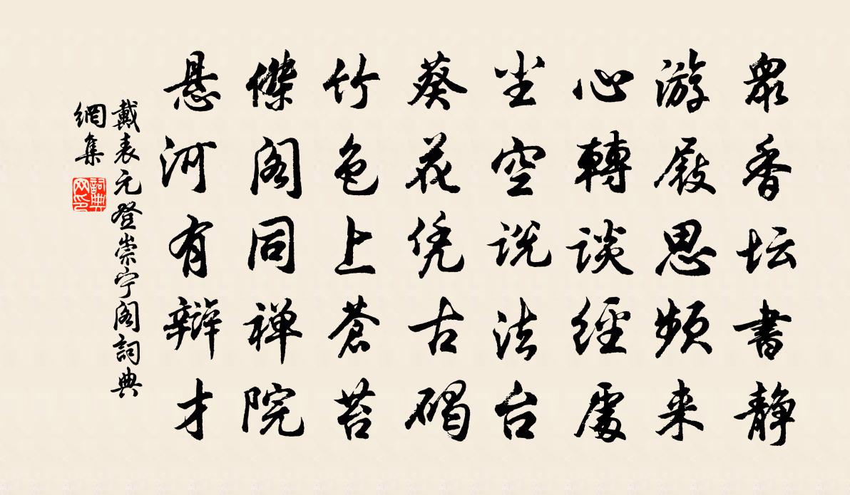 詩詞名句歷史字典書法欣賞書法字典國語詞典說文解字康熙字典古漢語字典標 題 作 者 詩 句 登崇寧閣作者:戴表元 朝代:宋代登崇寧閣原文眾香壇書靜,游屐思頻來。心轉談經處,塵空說法台。葵花憑古碣,竹色上蒼苔。傑閣同禪院,懸河有辯才。詩詞問答問:登崇寧閣的作者是誰?答:戴表元問:登崇寧閣寫於哪個朝代?答:宋代戴表元登崇寧閣書法欣賞登崇寧閣書法作品詩詞推薦別外甥楊克一二首張耒〔宋代〕澤國授衣早,今辰絺紵單。孤城遠目斷,秋水去帆寒。相見不再少,此生何日閒。殷勤換美酒,要對蟹螫盤。沁園春(贈清虛先生)曹勛〔宋代〕五老橫峰,二林雲衲,自古洞天。噴玉龍飛,下三峽水,望香爐暗靄,如起非煙。有個真人,撥雲峰下,宴坐修真陳文懿公輓詞樓鑰〔宋代〕眾口推文伯,何人識吏師。義襟惟古有,心地只天知。至死終無玷,平生本不欺。在公亡可憾,猶恨哲人萎。客中擬游廬山董嗣杲〔宋代〕依違春夢破,悲壯曉雞鳴。旅舍鄰淮士,家書附遞兵。東風吹浦樹,落月下江城。辦取游山具,天池聽水聲。句賀亢〔唐代〕但存方寸地,留與子孫耕。鷓鴣天(壽定庵運管兄)張榘〔宋代〕飽挹台城白鷺秋。又騎黃鵠上江州。恩波浩蕩三千里,多少人家願借留。□壽斝,菊香浮。姓名還喜到宸旒。片□句晏殊〔宋代〕主父仲舒容不得,未知賓閣是何人。齋中列酒數壺皆齊安村醪也今旦亦強飲數杯戲張耒〔宋代〕曾嘗玉皇碧琳腴,不醉長安市上酤。飲濕先生今已矣,啜醨留得與門徒。和夜讀離騷趙希逢〔宋代〕孤忠烈日與秋霜,千古英魂在水央。掩卷和吁悲往事,挑燈痛飲坐寒窗。始終與國當同戚,憤抑沉身亦近狂。狼跋和蘇養直見貽二首曹勛〔宋代〕羅浮真隱下珠宮,一粒丹砂魏武同。豈但修齡還稚齒,因知韻語盡仙風。潛真已信人非遠,拔宅懸知理可窮。分我擬阮公夜中不能寐詩鮑照〔南北朝〕漏分不能臥。酌酒亂繁憂。惠氣憑夜清。素景緣隟流。鳴鶴時一聞。千里絕無儔。佇立為誰久。寂寞空自愁。桂戴復古〔宋代〕金谷園林知幾家,競栽桃李作春華。無人得似天工巧,明月中間種桂花。舟過南莊呼村老與飲示以詩二陸游〔宋代〕玄雲吞落日,大風東北起。隔林鳴兩鳩,當道行眾螘。晴來未三日,雨候乃復爾。我場何時乾,嘉穀在泥涬。豐凶登第遺鄉人李巽〔宋代〕當年蹤跡困泥塵,不意乘時亦化鱗。為報鄉閭親戚道,召集席帽已離身。獄中作華岳〔宋代〕壯士剛腸不受冤,髑髏可斷志難乾。超仇未報薪當臥,漢賊猶存鋏謾彈。情款不從囚口責,炙漿難塞吏腸寬。何當小本蘭亭二種方回〔宋代〕子云可擬易論無,頗似蘭亭細字模。始信聖經非小藝,不羞依樣畫葫蘆。三月二十五日飲方校書園十絕劉克莊〔宋代〕後有良工識苦心,今無善聽孰知音。老來字字趨平易,免被兒童議刻深。送梓州李使君王維〔唐代〕萬壑樹參天,千山響杜鵑。山中一夜雨,樹杪百重泉。漢女輸橦布,巴人訟芋田。文翁翻教授,不敢倚先賢。久欲乞歸未得一日蒙恩放歸不勝欣喜塗中得十吳芾〔宋代〕淡煙斜日媚郊原,中有人家似輞川。地側忽驚車馬過,三三兩兩竹籬邊。秋日雜興敖陶孫〔宋代〕涼颸動空谷,振我庭樹枝。鮮勞忽顰蹙,顏色慘不怡。節序一如此,明當戒裘衣。寒蟲勸機杼,敦迫不貸時。汝意名句推薦綠楊帶雨垂垂重。五色新絲纏角粽。歐陽修《漁家傲·五月榴花妖艷烘》 桃花落後蠶齊浴,竹筍抽時燕便來。朱彝尊《鴛鴦湖棹歌·一百首選二》 微雨眾卉新,一雷驚蟄始。韋應物《觀田家》 念碎劈芳心,縈思千縷,贈將幽素,偷翦重雲。吳文英《風流子·黃鐘商芍藥》 憶君迢迢隔青天,昔日橫波目,今作流淚泉。李白《長相思·其二》 刷羽同搖漾,一舉還故鄉。沈約《詠湖中雁》 酹酒蒼茫,倚歌平遠,亭上玉虹腰冷。吳文英《十二郎·垂虹橋》 懷舊空吟聞笛賦,到鄉翻似爛柯人。劉禹錫《酬樂天揚州初逢席上見贈》 鳳尾森森,龍吟細細。曹雪芹《紅樓夢·第二十六回》 天子之怒,伏屍百萬,流血千里。劉向《戰國策·魏四·秦王使人謂安陵君》
