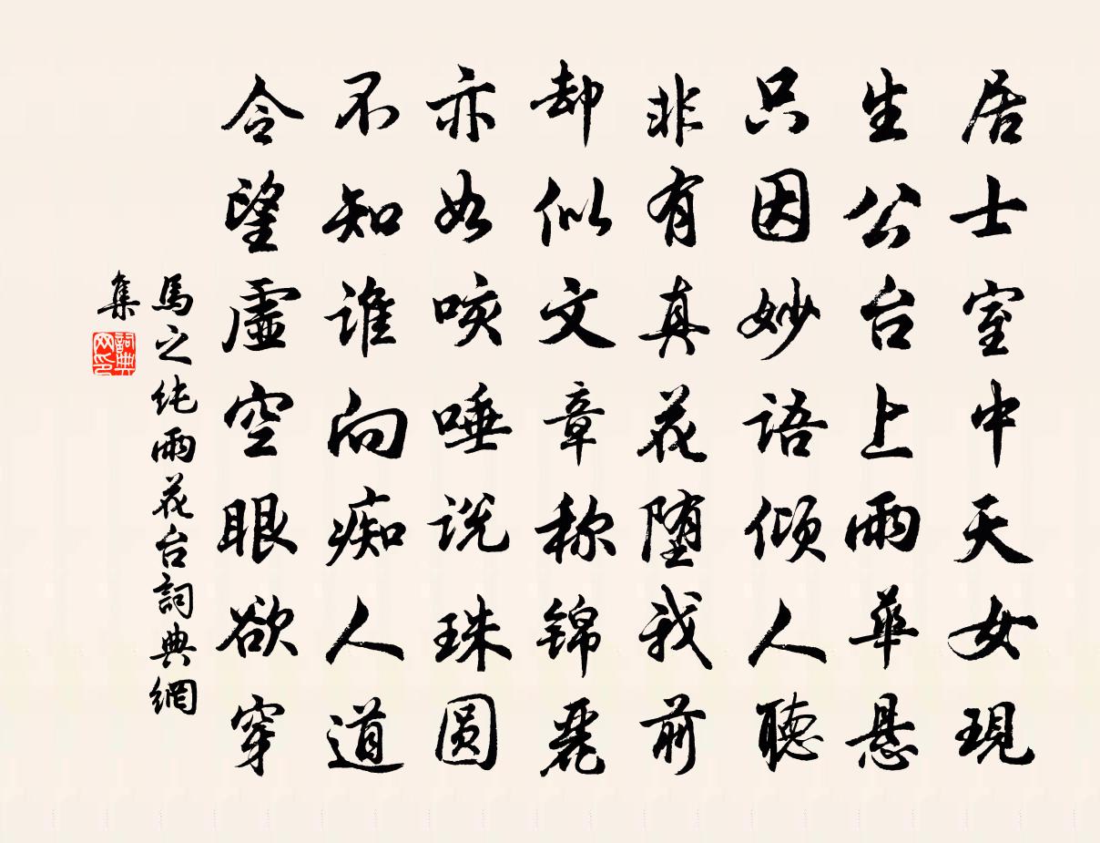 詩詞名句歷史字典書法欣賞書法字典國語詞典說文解字康熙字典古漢語字典標 題 作 者 詩 句 雨花台作者:馬之純 朝代:宋代雨花台原文居士室中天女現,生公台上雨華懸。只因妙語傾人聽,非有真花墮我前。卻似文章稱錦麗,亦如咳唾說珠圓。不知誰向痴人道,令望虛空眼欲穿。詩詞問答問:雨花台的作者是誰?答:馬之純問:雨花台寫於哪個朝代?答:宋代馬之純雨花台書法欣賞雨花台書法作品詩詞推薦守倅元日唱酬次韻章甫〔宋代〕別駕篇章敏,黃堂句法新。宜民多受福,把筆競題春。拖玉丹墀曉,鳴珂紫陌塵。退朝如有作,應亦念茲辰。歸渡洛水皇甫冉〔唐代〕暝色赴春愁,歸人南渡頭。渚煙空翠合,灘月碎光流。澧浦饒芳草,滄浪有釣舟。誰知放歌客,此意正悠悠。寄侍郎王曙偈釋警玄〔宋代〕吾年八十五,修因至於此。問我歸何處,頂相終難睹。題池州貴池亭杜牧〔唐代〕勢比凌歊宋武台,分明百里遠帆開。蜀江雪浪西江滿,強半春寒去卻來。和胡琴窗文天祥〔宋代〕買得青山貴似金,瘦筇上下費沉吟。花開花落相關意,雲去雲來自在心。夜雨一江漁唱小,秋風兩袖客愁深。夾堤偶成 其一王冕〔元代〕青山綠水從人愛,野鶴孤雲與我同。所適不須論醜好,相逢漫爾說英雄。樂游花木蕭蕭雨,梓澤亭台淡淡風。興廢落鴻范成大〔宋代〕落鴻聲里怨關山,淚濕秋衣不肯乾。只道一番新雨過,誰知雙袖倚樓寒。白水縣崔少府十九翁高齋三十韻杜甫〔唐代〕客從南縣來,浩蕩無與適。旅食白日長,況當朱炎赫。高齋坐林杪,信宿游衍闃。清晨陪躋攀,傲睨俯峭壁。崇岡雨中觀廬山岳珂〔宋代〕雨里觀山夐不同,何須九疊看屏風。紫觚壇上排蒼璧,青步障邊鋪翠茸。谷錦未回晴日照,衣綃聊借淡煙籠。只今海棠蘇軾〔宋代〕東風嫋嫋泛崇光,香霧空濛月轉廊。只恐夜深花睡去,故燒高燭照紅妝。真像沈提點求贊釋道濟〔宋代〕遠看不是,近年不像,費盡許多工夫,畫出這般模樣。眉如掃箒,一張大口。不會非言,只會吃酒。看看白頭,常已酉秋留鶴江有感陳允平〔宋代〕賓鴻幾過澱山湖,夜夜西風轉轆轤。苜蓿草衰江館靜,枇杷葉老石泉枯。曲終明月閒歌扇,病去寒灰滿藥爐。客夢惜黃花慢·菊吳文英〔宋代〕粉靨金裳。映繡屏認得,舊日蕭娘。翠微高處,故人帽底,一年最好,偏是重陽。避春祗怕春不遠,望幽徑、偷理漁歌子·西塞山前白鷺飛張志和〔唐代〕西塞山前白鷺飛,桃花流水鱖魚肥。青箬笠,綠蓑衣,斜風細雨不須歸。水調歌頭 送張夢符魏初〔元代〕一代橘軒老,胸次浩無窮。當年比度元李,氣象郁相同。況是文章翰墨,濺濺龍*虎躍,又得復齋公。俯仰想前輩傷盧長史居蕭元之〔宋代〕昔年傳得文標集,每對青燈一起予。偶訪袁人尋古事,舊時居處已民居。重午范成大〔宋代〕熨斗薰籠分夏衣,翁身獨比去年衰。已孤菖淥十分勸,卻要艾黃千壯醫。蜜粽冰團為誰好?丹符彩索聊自欺。小兒上十四吟十首劉克莊〔宋代〕遊戲人間又一年,非儒非佛復非仙。歷官甘出倚相後,序齒叨居絳老先。世難見花常濺淚,時平逢曲亦流涎。無端重午餉菜楚俗也鄧撫乾以詩來謝次韻答之三首項安世〔宋代〕大家朱書亭午時,人家艾人張天師。惟有書生最窮餓,盤中日出菜離離。圩丁詞十解楊萬里〔宋代〕圩上人牽水上航,從頭點檢萬農桑。即非使者秋行部,乃是圩翁曉挼莊。名句推薦從善如登,從惡如崩。左丘明《國語·周語·劉文公與萇弘欲城周》 無冥冥之志者,無昭昭之明;無惛惛之事者,無赫赫之功。荀子《荀子·勸學》 樓上黃昏欲望休,玉梯橫絕月中鉤李商隱《代贈二首》 人間萬事,毫髮常重泰山輕。辛棄疾《水調歌頭·壬子三山被召陳端仁給事飲餞席上作》 人生得意須盡歡,莫使金樽空對月。李白《將進酒》 欲說還休,卻道“天涼好個秋”!辛棄疾《醜奴兒·書博山道中壁》 因人成事,其功不難。魏徵《隋書·列傳·卷七》 位卑未敢忘憂國,事定猶須待闔棺。陸游《病起書懷》 與朋友論學,須委曲謙下,寬以居之。王陽明《傳習錄·卷下·門人陳九川錄》 霖雨泥我塗,流潦浩縱橫。曹植《贈白馬王彪·並序》
