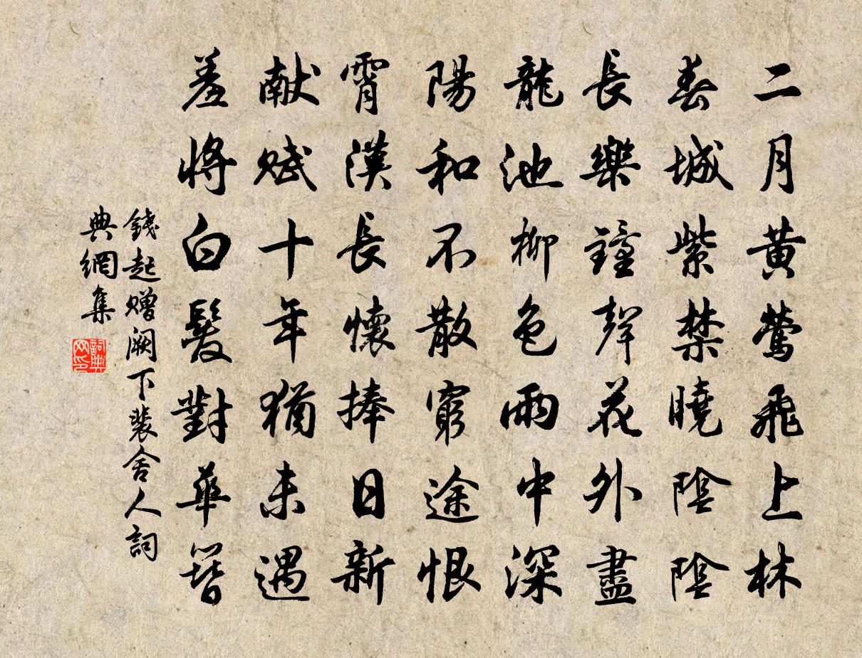 不難理解,此詩的開頭四句,並不是為寫景而寫景,他的目的,是在“景語”中烘托出裴舍人的特殊身份地位。由於裴舍人追隨御輦,侍從宸居,就能看到一般官員看不到的宮苑景色。當皇帝行幸到上林苑時,裴舍人看到上林苑的早鶯;皇帝在紫禁城臨朝時,裴舍人又看見皇城的春陰曉色;裴舍人草詔時,更聽到長樂宮舒緩的鐘聲;而龍池的柳色變化及其在雨中的濃翠,自然也是裴舍人平日所熟知的。四種景物都若隱若現地使人看到裴舍人的影子。