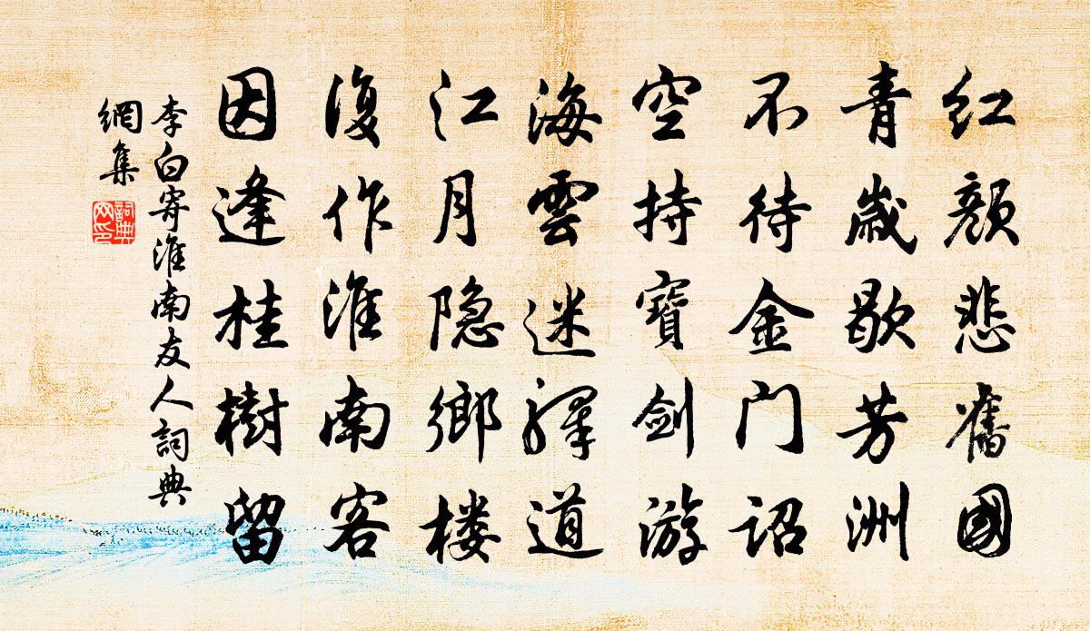 在這首詩中,李白透出了自淮南返回梁宋故國、重新開始書劍飄零的生涯的抑鬱心情。首句“紅顏怨歸國,春歲歇芳洲”,是個倒裝句,說他春天去淮畔芳洲遊憩歸來後,自己才感到一種失落與隱怨。何以如此?“不得金門詔,空持寶劍游”。從這裡我們可以窺見詩人雖嚮往自由自在的山川遊歷,卻並未斷絕仕途之念的矛盾心態:他熱烈地追求自由與超脫,同時又希望重新得到大唐天子的重用。他仿佛對友人說,我又開始雲遊天下了,“仗劍去國,辭親遠遊”。“海雲迷驛道,江月隱鄉樓”即為這次遊蹤的記錄與傳照,運用了對偶修辭手法,整齊美觀,音律和諧。詩的末尾又回到春天作客淮上的樂事上來,一個“忽”字,很傳神地反映了詩人行蹤飄零的羈旅生涯。一個因字,表現詩人本放浪不羈,卻因八公山中生機勃發的滿眼桂樹而難以自已的浪漫情懷。