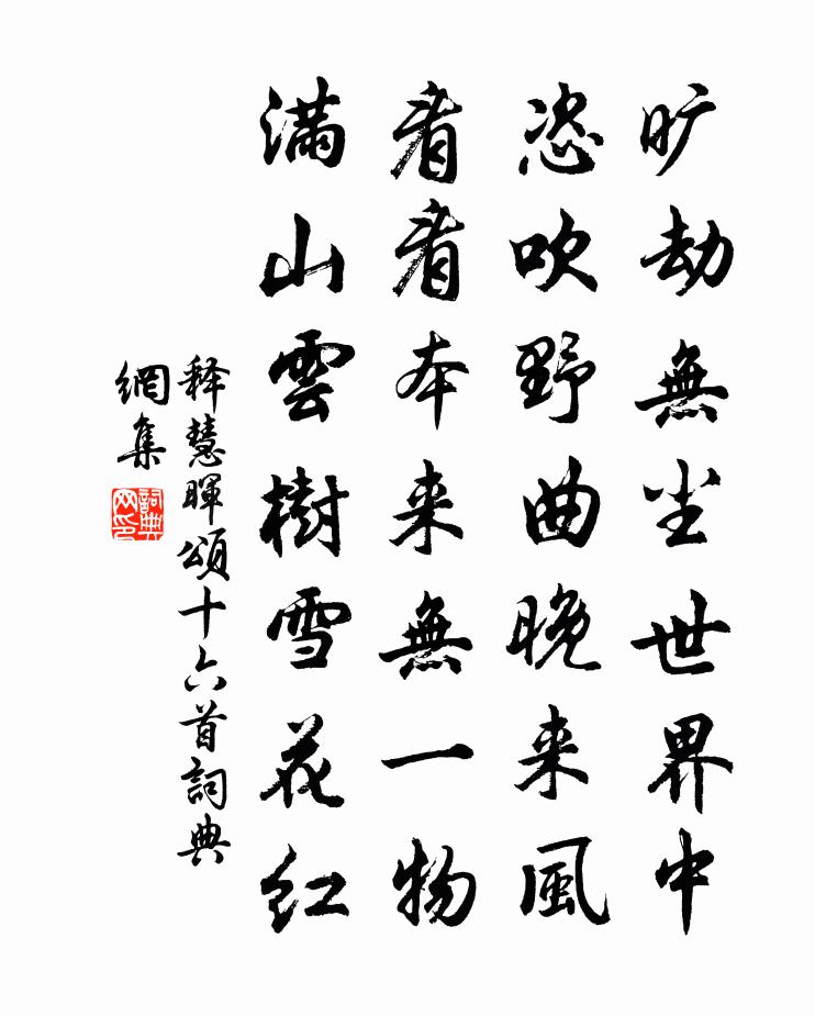 詩詞名句歷史字典書法欣賞書法字典國語詞典說文解字康熙字典古漢語字典標 題 作 者 詩 句 頌十六首作者:釋慧暉 朝代:宋代頌十六首原文曠劫無塵世界中,恣吹野曲晚來風。看看本來無一物,滿山雲樹雪花紅。詩詞問答問:頌十六首的作者是誰?答:釋慧暉問:頌十六首寫於哪個朝代?答:宋代釋慧暉頌十六首書法欣賞頌十六首書法作品詩詞推薦借庵姜特立〔宋代〕天地即吾廬,胡為號借居。趙州無住著,不作更還渠。哀蜀人為南蠻俘虜五章。過大渡河蠻使許之泣望鄉國雍陶〔唐代〕大渡河邊蠻亦愁,漢人將渡盡回頭。此中剩寄思鄉淚,南去應無水北流。張仲通追賦洛中雜題和嘗歷覽者六章其五大字梅堯臣〔宋代〕庭中兩大樹,池上千竿竹。竹有紅淚班,樹無眾鳥宿。昔日白傅歸,愛吟裴令續。間流水西園,翻然入他族。上袁文昌知平江五首劉過〔宋代〕骨秀如仙孕武夷,故教手筆世宗師。隸分唐漢諸家字,句壓陳黃二子詩。茂苑雨晴花發處,洞庭霜重橘黃時。塵埃登六和塔艾性夫〔宋代〕崒峍浮圖插翠微,長連山影浸江湄。地高直見海窮處,天近先知日上時。香繞五雲宮裡夢,墨濃千佛頂頭詩。無風緱山子晉祠以下陪太尉錢相公游嵩山七章其四梅堯臣〔宋代〕車馬雲外來,衣霞半山雨。弭節扣真居,捫蘿笑塵炬。回溪響石叢,靈茹抽岩塢。玉檻刻年華,應無愧前古。挽南平趙化卿陽枋〔宋代〕昔游曾到萬山峰,趙氏樓台紫翠中。六藝近夸三世學,四賢爭顯一家風。不堪顧影憐孤雁,伺喜摩天有阿鴻。好是重過文上人院李涉〔唐代〕南隨越鳥北燕鴻,松月三年別遠公。無限心中不平事,一宵清話又成空。送黃作霖吳芾〔宋代〕有志男兒走四方,憐君羇旅歲時長。數千里外乾微祿,三十年余返幫鄉。老著青衫唯可恨,光生白屋亦非常。時來頌古一百則釋正覺〔宋代〕夢中擁衲參耆舊,列聖森森坐其右。當仁不讓犍穉鳴,說法無畏師子吼。心安如海,膽量如斗。鮫目淚流,蚌腸珠次韻陳子象十月惠牡丹韓元吉〔宋代〕芙蓉掃地菊花陳,國色天香一夜春。愛景自催芳意動,清霜不礙曉妝新。長生便可書仙籍,上瑞端窒首貢珍。詩就芭蕉曾協〔宋代〕炎蒸誰解換清涼,扇扇搖搖上竹窗。準擬小軒添睡美,夢成風雨夜翻江。禪人寫真求贊釋正覺〔宋代〕虛空借得作身,萬象相隨為伴。縱橫人道十成,點檢誰知一半。看看青山崢嶸,白雲零亂。里許牧童歸未歸,鐵牛送禪人上歸日本釋文珦〔宋代〕今日送君旭日東,便成永別恨難窮。海邦萬里波濤隔,不似青山有路通。傷春何應龍〔宋代〕荷葉初浮水上錢,柳花飄盡岸頭綿。不知春色歸何處,欲向空山問杜鵑。句李廌〔宋代〕文林換卻山林興,誰道山人索價高。句劉昌詩〔宋代〕可堪添客恨。泉聲長帶佩聲寒。野徑縈迴路百盤。和劉後村梅花百詠方蒙仲〔宋代〕兒時兩頷已生髭,一飽皇皇亟失時。索性斷它煙火氣,餐英汲潤當朝炊。立春內中帖子詞夫人閣王珪〔唐代〕彩燕迎春入鬢飛,輕寒未放縷金衣。苑中忽報花開早,得從鑾與向晚歸。用舊韻贈瑩上人劉克莊〔宋代〕飛錫應來從鷲嶺,卓茅渾未有蜂窠。輸他靈運先成佛,笑殺僧伽改姓何。一半芋甘堪共飽,六如語妙不須多。珍公名句推薦恐鳳靴,挑菜歸來,萬一灞橋相見。史達祖《東風第一枝·詠春雪》 不覺碧山暮,秋雲暗幾重。李白《聽蜀僧濬彈琴 / 聽蜀僧浚彈琴》 少壯從戎馬上飛,雪山童子未緇衣劉商《贈頭陀師》 牛群食草莫相觸,官家截爾頭上角。李涉《牧童詞》 兩處春光同日盡,居人思客客思家。白居易《望驛台》 江闊雲低、斷雁叫西風。蔣捷《虞美人·聽雨》 綠池落盡紅蕖卻,荷葉猶開最小錢。楊萬里《秋涼晚步》 敗荷零落,衰楊掩映,岸邊兩兩三三,浣沙游女。柳永《夜半樂·凍雲黯淡天氣》 昨夜斗回北,今朝歲起東。孟浩然《田家元日》 山明水淨夜來霜,數樹深紅出淺黃。劉禹錫《秋詞二首》