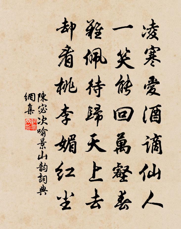詩詞名句歷史字典書法欣賞書法字典國語詞典說文解字康熙字典古漢語字典標 題 作 者 詩 句 次喻景山韻作者:陳宓 朝代:宋代次喻景山韻原文凌寒愛酒謫仙人,一笑能回萬壑春。難佩待歸天上去,卻看桃李媚紅塵。詩詞問答問:次喻景山韻的作者是誰?答:陳宓問:次喻景山韻寫於哪個朝代?答:宋代陳宓次喻景山韻書法欣賞次喻景山韻書法作品詩詞推薦送外甥李渭進士赴舉魏野〔宋代〕棠樹掄材過禮闈,孤寒得解更光輝。進身喜逐賢侯表,裹足愁分老母衣。千里冬殘傷獨去,一家春盡待榮歸。頭方漁浦陸游〔宋代〕桐廬處處是新詩,漁浦江山天下稀。安得移家常住此,隨潮入縣伴潮歸。擬行路難鮑照〔南北朝〕君不見柏梁台。今日丘墟生草萊。君不見阿房宮。寒雲澤雉棲其中。歌妓舞女今誰在。高墳壘壘滿山隅。長袖紛紛送胡彥思葉適〔宋代〕秋旱兼春處處祈,微茫欲雨又還非。汝行恰值此時別,不到為霖不肯歸。雜興六首陸游〔宋代〕老無添虎仍逢病,春欲殘時未減寒。架上漢書渾忘盡,床頭周易卻常看。呈周昭禮二首趙蕃〔宋代〕又向江頭覓去船,故山歸路反茫然。秋鴻社燕各千里,落日殘霞同一川。酒得老兵猶可飲,詩須我輩始堪傳。經行春日即事俞桂〔宋代〕春光滿目是吳頭,水碧琉璃拍岸流。憶著去年桃葉渡,相思無限使人愁。庸醫行尹穡〔宋代〕南街書醫工門如書市,爭傳書和扁生後世。膏盲可為死可起,書屑蓬根盡珍劑。歲月轉久術轉疏,十醫九死一活無蝶戀花(長沙送同官先歸邵武)呂勝己〔宋代〕屈指瓜期猶渺渺。羨子征鞍,去上長安道。到得故園春正好。桃腮杏臉迎門笑。聞道難兄登顯要。雁子云宵,花萼再用韻賀計使高恥堂建台得雨趙汝騰〔宋代〕皇華都騎訪陳人,似灑仙瓢助守臣。亭午建台申大雨,作霖用汝澤先閩。物情是處皆忻吐,吏羽從今一洗新。陝事相和歌辭。賈客詞劉禹錫〔唐代〕賈客無定游,所游惟利並。眩俗雜良苦,乘時知重輕。心計析秋毫,搖鉤侔懸衡。錐刀既無棄,轉化日已盈。邀福自三池一日過靈池十五裡頭宿山險盡矣李流謙〔宋代〕壠頭停轡望龜城,元有夷途似掌平。厭把五更供客夢,猛將一日了山程。樹連新綠千林暗,日轉斜紅半野明。稚子武林書事九首方回〔宋代〕竹林七賢六有子,何獨無聞劉伯倫。夢想先師授書處,城東風雨臥荒墳。清平樂(壽趙民則提刑,時新除,且素不喜飲)辛棄疾〔宋代〕詩書萬卷。合上明光殿。案上文書看未遍。眉里陰功早見。十分竹瘦松堅。看君自是長年。若解尊前痛飲,精神便繞佛閣(黃鐘商與沈野逸東皋天街盧樓追涼小飲)吳文英〔宋代〕夜空似水,橫漢靜立,銀浪聲杳。瑤鏡奩小。素娥乍起、樓心弄孤照。絮雲未巧。梧韻露井,偏借秋早。晴暗多少贈衡岳隱禪師司空曙〔唐代〕擁褐安居南嶽頭,白雲高寺見衡州。石窗湖水搖寒月,楓樹猿聲報夜秋。講席舊逢山鳥至,梵經初向竺僧求。垂垂再和前韻答賦五首魏了翁〔宋代〕甫田之田驕驕莠,大國之郊濯濯山。養且難成摧則折,寧居材與不材間。梅山弟家醉中陳著〔宋代〕僵寒危病分泉台,誰料今猶事酒杯。可是食羊供未足,只因齏瓮喚教回。紫荊老樹死中活,棠棣春花笑處開。兒輩沈楊輔隱軒詩王之道〔宋代〕小隱山林大朝市,夫子命軒良有意。仕途捷徑固無取,泉石膏肓亦猶次。不知朝隱誰得之,我恐曼倩為近似。公卿自訟李復〔宋代〕前善後隨非,失於任私意。短長莫可欺,明者未免蔽。改過心每憚,責人夫何易。芸苗舍己田,無獲亦蹈厲。名句推薦尚想舊情憐婢僕,也曾因夢送錢財。元稹《遣悲懷三首·其二》 絲槐煙柳長亭路,恨取次、分離去。惠洪《青玉案·絲槐煙柳長亭路》 及時當勉勵,歲月不待人。陶淵明《雜詩·人生無根蒂》 千家閉戶無砧杵,七夕何人望鬥牛。李嘉祐《早秋京口旅泊章侍御寄書相問因以贈之時七夕》 停車數行日,勸酒問回期。王建《送人游塞》 只要你見性志誠,念念回首處,即是靈山。吳承恩《西遊記·第二十四回》 泛菊杯深,吹梅角遠,同在京城。劉過《柳梢青·送盧梅坡》 念歸林葉換,愁坐露華生。張九齡《西江夜行》 落梅庭榭香,芳草池塘綠。晏幾道《生查子·落梅庭榭香》 我愛山中夏,空冥花雨下。元鵬《山中四詠》