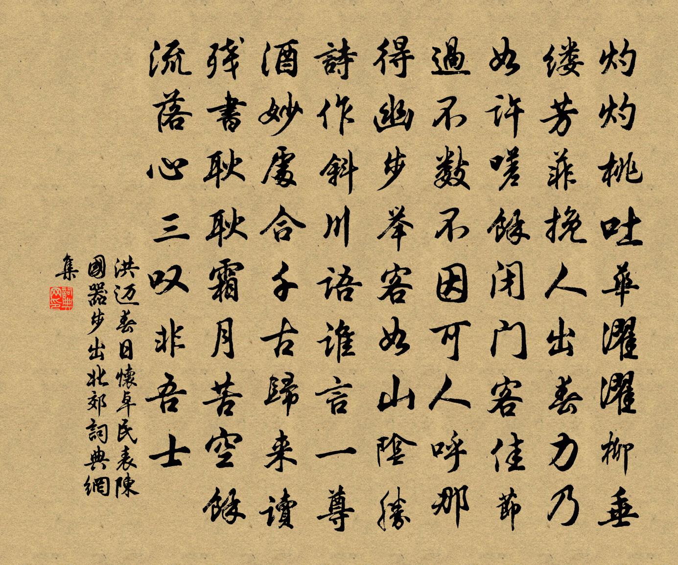 詩詞名句歷史字典書法欣賞書法字典國語詞典說文解字康熙字典古漢語字典標 題 作 者 詩 句 春日懷卓民表陳國器步出北郊作者:洪邁 朝代:宋代原文灼灼桃吐華,濯濯柳垂縷。芳菲挽人出,春力乃如許。嗟余閉門客,佳節過不數。不因可人呼,那得幽步舉。客如山陰勝,詩作斜川語。誰言一尊酒,妙處合千古。歸來讀殘書,耿耿霜月苦。空餘流落心,三嘆非吾士。詩詞問答問:《春日懷卓民表陳國器步出北郊》的作者是誰?答:洪邁問:該詩寫於哪個朝代?答:宋代書法欣賞春日懷卓民表陳國器步出北郊書法作品詩詞推薦送汪聖錫侍郎帥福唐范成大〔宋代〕承明才入又南州,重見旌旗照柁樓。道義平生無捷徑,風波隨處有虛舟。如公未可違文石,稽古何妨欠碧油。我亦遊子蘇泂〔宋代〕遊子那無故,青春亦有歸。小舟沖岸疾,白鳥破煙飛。物理迷終極,人生喜願違。東南雙病眼,隨日下漁磯。慶東原·暖日宜乘轎白樸〔元代〕暖日宜乘轎,春風堪信馬。恰寒食有二百處鞦韆架。對人嬌杏花,撲人飛柳花,迎人笑桃花。來往畫船邊,招颭青東庵陳舜俞〔宋代〕已憐門巷林中出,況復軒窗水畔開。冷淡山光明枕簟,動搖波影上樽罍。坐看天際孤舟失,慣見桑陰五馬來。長恨十月十三日泊舟白沙江口黃庭堅〔宋代〕岸江倚帆檣,已專北風權。飛霜挾月下,百笮直如弦。綠水去清夜,黃蘆搖白煙。篙人持更柝,相語聞並船。平生奉和御製看毛詩詩三章二章十二句一章八句夏竦〔宋代〕周道洽平,聲動文成。周王棄善,俗移風變。哀樂異心,治亂殊音。心發言從,影響攸同。政行音類,塤篪靡異。奉和門下相公送西川相公兼領相印出鎮全蜀詩十八韻杜牧〔唐代〕盛業冠伊唐,台階翊戴光。無私天雨露,有截舜衣裳。蜀輟新衡鏡,池留舊鳳凰。同心真石友,寫恨蔑河梁。 * 念奴嬌(和張文伯重陽前雨)王之道〔宋代〕黃花照眼,對西風庭檻,為渠凝佇。準擬登高酬一醉,底事晚來微雨。蟋蟀聲中,芭蕉葉上,怎得爭如許。龍山何【仙呂】一半兒 題情關漢卿〔元代〕雲鬟霧鬢勝堆鴉,淺露金蓮籟絳紗。不比等閒牆外花。罵你個俏冤家,一半兒難當一半兒耍。演雅十章張至龍〔宋代〕鵲鳴人共憐,烏鳴人共嫉。只因聲妍媸,何心報凶吉。禪人並化主寫真求贊釋正覺〔宋代〕八字眉低,四方口闊。發色松雪寒,日光岸電爍。橐簽之空,樞機之活。其間勿你安排,里許是誰造作。影草不彰春閨陳允平〔宋代〕寂寞梨花院落閒,遠山愁入兩眉彎。黃金絡索珊瑚墜,獨立春風教白鷳。西江月毛滂〔宋代〕雨後袷衣初冷,霜前細菊渾斑。觚稜清月繡團環。萬里長安秋晚。槽下內家玉滴,盤中江國金丸。春容著面作微殷雨夜王銍〔宋代〕去國襟懷離別情,夜眠雨驛嘆孤征。轉頭三十年前恨,猶聽當時枕上聲。偈公六十五首釋鹹傑〔宋代〕天上月圓,人間月半。槌鼓升堂,理舊公案。車不橫推,理無曲斷。題白帝廟詩並序元勛〔宋代〕楚山中到三峽開,長江浩浩從西來。奫淪巨浸吞萬派,淫預傑立高崔嵬。鯨波回薄山角,征鼙摻疊鳴春雷。蹴石岩次韻定慧欽長老見寄八首蘇軾〔宋代〕誰言窮巷士,乃竊造化權。所見皆我有,安居受其全。戲作一篇書,千古發爭端。儒墨起相殺,予初本無言。放鷓鴣陳宓〔宋代〕有生惟萬類,好惡與人參。以彼刳腸苦,為吾悅口甘。蔬餐人所尚,肉食我誠慚。放汝飛翔去,騰雲更宿嵐。湖州歌九十八首 其三十七汪元量〔宋代〕宮人清夜按瑤琴,不識明妃出塞心。十八拍中無限恨,轉弦又奏廣陵音。送客偶作溫庭筠〔唐代〕石路荒涼接野蒿,西風吹馬利如刀。小橋連驛楊柳晚,廢寺入門禾黍高。雞犬夕陽喧縣市,鳧鷖秋水曝城壕。故山名句推薦隱約遙峰,和淚謝娘眉嫵。史達祖《綺羅香·詠春雨》 奢侈者鮮有不敗李大師、李延壽《南史·列傳·卷四十五》 溪上桃花無數,花上有黃鸝。黃庭堅《水調歌頭·遊覽》 雨荒深院菊,霜倒半池蓮。杜甫《宿贊公房》 賢不肖不雜則英傑至,是非不亂則國家治荀子《荀子·王制》 蓋世的功勞,當不得一個矜字;彌天的罪過,當不得一個悔字。洪應明《菜根譚·概論》 人生如夢,一尊還酹江月蘇軾《念奴嬌·赤壁懷古》 向河梁、回頭萬里,故人長絕。辛棄疾《賀新郎·別茂嘉十二弟》 漱冰濯雪,眇視萬里一毫端。張孝祥《水調歌頭·金山觀月》 杏花村館酒旗風。水溶溶。揚殘紅。謝逸《江神子·杏花村館酒旗風》