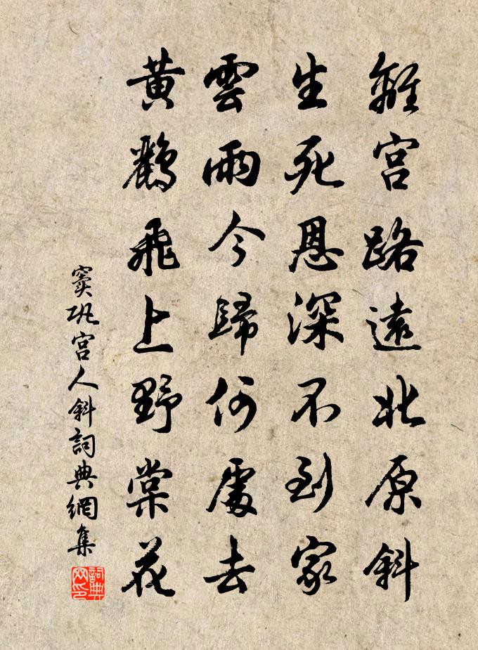 詩詞名句歷史字典書法欣賞書法字典國語詞典說文解字康熙字典古漢語字典標 題 作 者 詩 句 宮人斜作者:竇鞏 朝代:唐代宮人斜原文離宮路遠北原斜,生死恩深不到家。雲雨今歸何處去,黃鸝飛上野棠花。詩詞問答問:宮人斜的作者是誰?答:竇鞏問:宮人斜寫於哪個朝代?答:唐代問:宮人斜是什麼體裁?答:七絕竇鞏宮人斜書法欣賞宮人斜書法作品注釋全唐詩:卷271_130詩詞推薦閱史六首陳造〔宋代〕帝惜人才幾手培,誅鉏盜權媒。更憐孫息追仇誤,忍死龍荒首不回。吟詩自笑用前韻陳造〔宋代〕文字光騰萬丈長,錦官老杜豫章黃。投荒忍死經人鮓,討飯充腸上岳陽。閒賦許月卿〔宋代〕老大天諳練,殷勤月往還。岩巒有奇操,泉石亦清淡。隔浦飛秋葉,開窗看夕山。天心端正月,潭水夜深參。放言十首黃庭堅〔宋代〕蘭楫桂為舟,大江可遠遊。堅車無良馬,出門敗吾輈。一身交萬物,用我未易周。安得柳下惠,窮年與之游。贈休齋沈老丈葛紹體〔宋代〕澉浦東南海面橫,慣看潮落又潮生。嫌渠萬里風波險,心地一生平處行。常山道中陳文蔚〔宋代〕路勢弓腰轉,湖光鑒面開。稻田春事給,村碓晚舂催。問宿尚十里,與誰同一杯。自憐今日首,頻作望鄉回。秋夜洪咨夔〔宋代〕一日一番雨,三更三昧涼。桐邊青弄影,荷底靜留香。俗物刺人眼,世情冰我腸。關山何處笛,落月照胡床。遺任子淵省元六首員興宗〔宋代〕我有二三子,文字粲彪炳。一說為波臣,或傳近華省。豈徒異榮寂,又墮生滅境。懸知群物攝,大類任毛穎。不如寄契盈上人許渾〔唐代〕何處是西林,疏鍾復遠砧。雁來秋水闊,鴉盡夕陽沉。婚嫁乖前志,功名異夙心。湯師不可問,江上碧雲深。村居書事二首陸游〔宋代〕四十餘年食太倉,賜骸恩許返耕桑。長絲出鬴蒪羹美,白雪翻匙稻飯香。酒戶知貧焚舊券,醫翁憐病獻新方。春殘禪人並化主寫真求贊釋正覺〔宋代〕兀兀心傳,了了忘緣。葉零白露,雲散青天。玉轂兔推而洗開夜色,銀籠鶴出而飛度寒煙。借功明位,借伴入廛。南溪會集二首傅察〔宋代〕傳聞公退集群英,共惜殘春到野亭。高柳半天成翠幄,遙峰插地作長屏。應憐曠寂囂塵絕,更覺蕭疏物象泠。顧我游西湖用中字韻呈直院高舍人沈繼祖〔宋代〕制兼內外文章伯,遠過當年高侍中。運筆不停池水黑,舉觴未厭酒珠紅。泛舟但仰膺門峻,登峴夫何湛輩同。儻以漁家傲牟巘〔宋代〕病枕逢逢驚曉鼓。那堪送客江頭路。莫唱驪駒催客去。風又雨。花飛一片愁千縷。折柳悽然無勝語。加餐更把篝衣和宋之問寒食題黃梅臨江驛崔融〔唐代〕春分自淮北,寒食渡江南。忽見潯陽水,疑是宋家潭。明主閽難叫,孤臣逐未堪。遙思故園陌,桃李正酣酣。讀道藏蘇軾〔宋代〕嗟予亦何幸,偶此琳宮居。宮中復何有,戢戢千函書。盛以丹錦囊,冒以青霞裾。王喬掌關鑰,蚩尤守其廬。乘閒離臨安舟中有懷山藪朱文之子聊作五絕以寄史堯弼〔宋代〕仙舟輕漾首仍西,我獨南征未得歸。相望兩鷗空浩蕩,何如雙鳥共鳴飛。曹氏寒碧即事葛紹體〔宋代〕屋頭楊柳綠參差,小竹疎花此更宜。簾漾水紋閒晝日,早秋風物似春時。生查子(稽山對雪有感)吳文英〔宋代〕暮雲千萬重,寒夢家鄉遠。愁見越溪娘,鏡里梅花面。醉情啼枕冰,往事分釵燕。三月灞陵橋,心翦東風亂。龍州送人赴舉李洞〔唐代〕獻策赴招攜,行宮積翠西。挈囊秋卷重,轉棧晚峰齊。踏月趨金闕,拂雲看御題。飛鳴豈回顧,獨鶴困江泥。名句推薦榆柳蔭後檐,桃李羅堂前。陶淵明《歸園田居·其一》 賞罰如加於身,賦斂如取己物。此愛民之道也。姜子牙《六韜·文韜·國務》 念碎劈芳心,縈思千縷,贈將幽素,偷翦重雲。吳文英《風流子·黃鐘商芍藥》 積薄而為厚,聚少而為多劉向《戰國策·秦四·或為六國說秦王》 人生如寄,何事辛苦怨斜暉。朱熹《水調歌頭·隱括杜牧之齊山詩》 總是向人深處,當時枉道無情陸游《朝中措·代譚德稱作》 休言萬事轉頭空,未轉頭時皆夢。蘇軾《西江月·平山堂》 紫萸一枝傳賜,夢誰到、漢家陵。姚雲文《紫萸香慢·近重陽》 高岸為谷,深谷為陵。佚名《十月之交》 好面譽人者,亦好背而毀之。莊子《莊子·雜篇·盜跖》