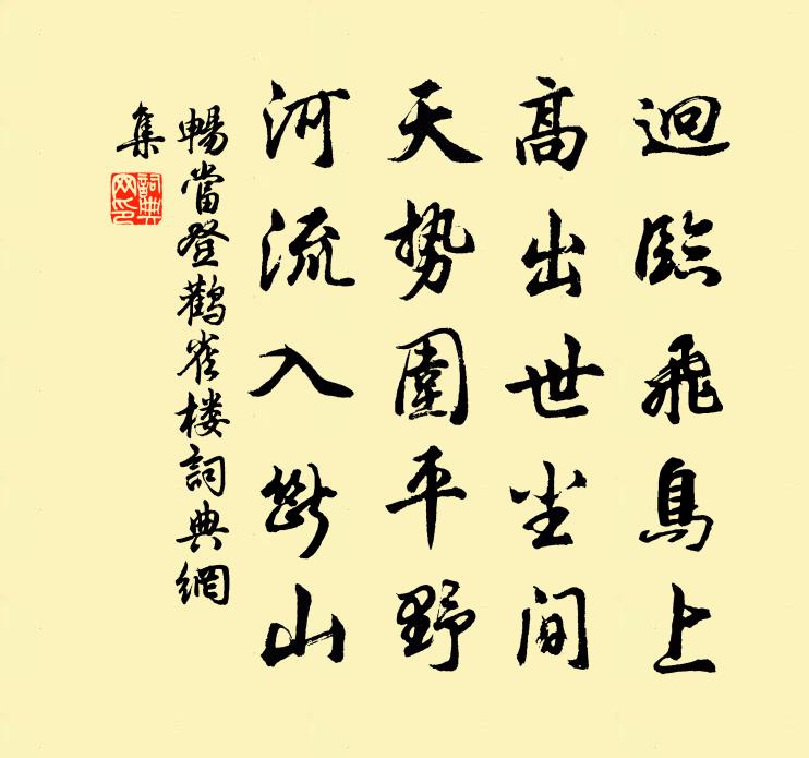 後一聯以天垂四野、黃河奔向遠方山谷的壯闊景象,映襯出鸛雀樓的雄偉氣勢。