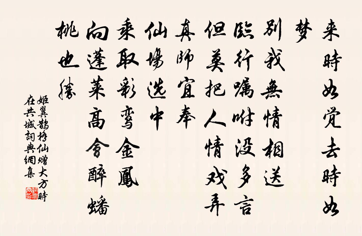 詩詞名句歷史字典書法欣賞書法字典國語詞典說文解字康熙字典古漢語字典標 題 作 者 詩 句 鵲橋仙 贈大方,時在共城作者:姬翼 朝代:元代鵲橋仙 贈大方,時在共城原文來時如覺,去時如夢。別我無情相送。臨行囑咐沒多言,但莫把、人情戲弄。真師宜奉。仙場選中。乘取彩鸞金鳳。向蓬萊高會醉蟠桃,也勝詩詞問答問:鵲橋仙 贈大方,時在共城的作者是誰?答:姬翼問:鵲橋仙 贈大方,時在共城寫於哪個朝代?答:元代問:鵲橋仙 贈大方,時在共城是什麼體裁?答:詞姬翼鵲橋仙 贈大方,時在共城書法欣賞鵲橋仙 贈大方,時在共城書法作品詩詞推薦槿花劉筠〔宋代〕紫霧函燈檠,彤霞逼綺寮。吳宮何薄命,楚夢不終朝。半被曾羞問,鄰牆卻悔招。莫移風雨怨,更囑鵲為橋。劉貢父見余歌詞數首,以詩見戲,聊次其韻蘇軾〔宋代〕十載飄然未可期,那堪重作看花詩。門前惡語誰傳去,醉後狂歌自不知。刺舌君今猶未戒,灸眉吾亦更何辭。相從水調歌頭魏了翁〔宋代〕促織誰遣汝,唧唧不能休。攬衣起觀,四顧河漢淡如油。露下南山薈蔚,風抹西湖菱芰,客感浩悠悠。尚此推不去卜運算元(赴春陵和向伯元送行詞)趙師俠〔宋代〕雲斂料寒輕,雨漲春波渺。旅枕無堪夢易驚,啼鴂聲催曉。尚憶故園花,紅紫為容好。世路崎嶇長短亭,來往何時服仙靈脾酒張耒〔宋代〕冷氣蓋侵吾髀,趨拜劇苦艱。仁哉神農氏,遺藥驅恫瘝。持錢取之市,易得如茆芫。繁枝與芳葉,盡取無可刪。貯謹和老人初冬寓筆十絕洪咨夔〔宋代〕避風台上深情寵,偃月堂中盡意謀。爭奈天公無面目,滿林黃葉一番秋。掃花游/掃地游張半湖〔宋代〕柳絲曳綠,正豆雨初晴,水天朱夏。石榴綻也。看猩紅萬點,倚亭敧榭。鎖闥深中,料想酒闌歌罷。日將下。是那送僧歸護國寺李諮〔宋代〕輦寺住經年,歸心起浩然。傳衣因世出,揮塵自彌天。海客分朝供,江燈照夜禪。赤城重到日,八桂老岩煙。雜詠五首王安石〔宋代〕白頭重到太寧宮,玉佩瓊琚在眼中。歌舞可憐人暗換,花開花落幾春風。和閻帥侍郎見寄沈繼祖〔宋代〕全荊百萬兵屯雲,甲光耀日爭晶熒。中有詩書禮樂師,聲色不動今孔明。幕府晝閒多嘯詠,風流文采被諸生。嗟予祝英台近史達祖〔宋代〕落花深,芳草暗,春到斷腸處。金勒驕風,欲過大堤去。翠樓葛領西邊,恰如曾約,畫闌映、一枝瓊樹。正凝佇。唐律十首方岳〔宋代〕松露滴深幽,山寒草逕秋。蔓藤行伏兔,野竹上牽牛。日月雙車轂,乾坤一傳郵。功名成底事,何苦覓封侯。賞春姚合〔唐代〕閒人只是愛春光,迎得春來喜欲狂。買酒怕遲教走馬,看花嫌遠自移床。嬌鶯語足方離樹,戲蝶飛高始過牆。顛倒次韻夾穀子括吳山晚眺方回〔宋代〕詩眼書胸碧宙寬,暮天搖落縱遐觀。霜明楓葉紅於染,春點梅梢玉不寒。北望遙迎書雁至,南烹屢饜膾魚殘。一規使臣周允寫平園老叟真於松竹龜鶴間戲贊周必大〔宋代〕松可以傲霜雪,竹可以延風月。龜巢葉而養氣,鶴鳴皋而戢翼。置閒身於四物,聊竊名於五一。又絕句二首劉克莊〔宋代〕東閣郎君己貳卿,斡回嚴冷作和平,專人昔暴於家靼,太傅今賢似父兄。踏莎行(贈傀儡人劉師父)劉仁父〔宋代〕不假牽絲,何勞刻木。天然容貌施妝束。把頭全仗姓劉人,就中學寫秦城築。伎倆優長,恢諧軟熟。當場喝采醒群茶山下作杜牧〔唐代〕春風最窈窕,日曉柳村西。嬌雲光占岫,健水鳴分溪。燎岩野花遠,戛瑟幽鳥啼。把酒坐芳草,亦有佳人攜。送馬莊甫攝幕鄱陽用趙文鼎韻韓元吉〔宋代〕杖策沖寒不作難,弓刀結束笑談間。便從幕府清民訟,已佐戎車靖蜑蠻。負雪幸無千里路,江湖才隔數重山。荊南簡葉丞李處權〔宋代〕傾蓋鄱陽彥,孤芳且寄林。一官方似水,五字可兼金。與世不求合,開筵猶見尋。何當鑄農器,歸望故人岑。名句推薦未老莫還鄉,還鄉須斷腸。韋莊《菩薩蠻·人人盡說江南好》 世上無難事,只怕不專心。佚名《增廣賢文·下集》 長相思,摧心肝。李白《長相思三首》 明月皎皎照我床,星漢西流夜未央。曹丕《燕歌行二首·其一》 外舉不避仇,內舉不避子。韓非及後人《韓非子·外儲說左下》 無由持一碗,寄與愛茶人。白居易《山泉煎茶有懷》 執一者至貴也,至貴者無敵。呂不韋《呂氏春秋·覽·離俗覽》 為害常因不察,致禍歸於不忍。來俊臣《羅織經·閱人卷第一》 君不見,高堂明鏡悲白髮,朝如青絲暮成雪。李白《將進酒》 為善則流芳百世,為惡則遺臭萬年。程登吉《幼學瓊林·卷三·人事》