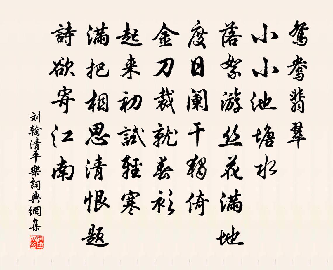 詩詞名句歷史字典書法欣賞書法字典國語詞典說文解字康熙字典古漢語字典標 題 作 者 詩 句 清平樂作者:劉翰 朝代:宋代清平樂原文鴛鴦翡翠。小小池塘水。落絮遊絲花滿地。度日闌乾獨倚。金刀裁就春衫。起來初試輕寒。滿把相思清恨,題詩欲寄江南。詩詞問答問:清平樂的作者是誰?答:劉翰問:清平樂寫於哪個朝代?答:宋代問:清平樂是什麼體裁?答:詞劉翰清平樂書法欣賞清平樂書法作品詩詞推薦好事近(十二之四)陸游〔宋代〕歲晚喜東歸,掃盡市朝陳跡。揀得亂山環處,釣一潭澄碧。賣魚沽酒醉還醒,心事付橫笛。家在萬重雲外,有沙鷗河西春暮憶秦中岑參〔唐代〕渭北春已老,河西人未歸。邊城細草出,客館梨花飛。別後鄉夢數,昨來家信稀。涼州三月半,猶未脫寒衣。荷花四絕風吳龍翰〔宋代〕颯颯涼生水國秋,可憐無計解花愁。飄然一葉隨流水,付與真人駕作舟。壽劉丞洪咨夔〔宋代〕岳之大兮公器宇,岳之秀兮公精神。平生節義磨天地,冰雪丰姿了無翳。詞鋒凜凜人膽寒,少年斫卻月中桂。人指滿庭芳 鳴鶴餘音卷之三馬鈺〔元代〕年小靈童,出家學道,師言側耳須聽。清晨早起,掃地莫揚塵。梳洗身邊潔淨,然後刷釜拈盆。廚房內,油鹽米麵聞秀實歸自臨安有新作戲以小詩寄之四首王洋〔宋代〕宮妝十樣向眉頭,傳道人間不爭愁。說與眉端向人意,元和才子舊風流。遇閏乾隆〔清代〕遇閏深山秋益深,每因趁暖一幽尋。松盤嶺復蒼中翠,葉落波心靜里沉。鹿度岩邊看活畫,禽鳴林際聽仙音。養生洪長老請贊釋師範〔宋代〕西有岷峨,南有雪峰。靈龜未爆,爻象重重。拈卻玄沙白袋,自然千里同風。詩經·羔裘佚名〔先秦〕羔裘豹祛,自我人居居。豈無他人?維子之故。羔裘豹褎,自我人究究。豈無他人?維子之好。嚴一飛惠餘一唯圖書贊其上甚佳石更名忠恕圖李石〔宋代〕善水沃沸焦,善藥調瞑眩。吾豈斯人徒,屏開慈母面。丹青解人意,二字出素練。孝哉耘瓜子,傷根豈所願。升堂晚出昇州門王同祖〔宋代〕晚驅贏馬出東城,過盡三崗路卻平。村店夜深人語靜,隔橋風遞暗潮聲。祁門道中即事曹彥約〔宋代〕為愛幽鄉度遠村,支頤佇立愛山礬。栗留尚惜輕求友,反舌紛紛亦巧言。山行過僧庵不入陸游〔宋代〕垣屋參差竹塢深,舊題名處嬾重尋。茶爐煙起知高興,棋子聲疏識苦心。淡日暉暉孤市散,殘雲漠漠半川陰。長吟感興五首歐陽修〔宋代〕唧唧復唧唧,夜嘆曉未息。蟲聲急愈尖,病耳聞若刺。壯士易為老,良時難再得。日月相隨東,天行自西北。三者送元恕強至〔宋代〕我本生窮閻,才命兩乖塞。再試得一第,失足落銓格。去年赴選集,摩肩雜隸役。吏口駢名呼,摧沮氣填臆。僦居靜心堂史堯弼〔宋代〕曲士懷軒裳,銖寸較得失。紛紜戰寵辱,矛盾相撞抶。大方惟達人,天游寄虛室。卷舒儻由己,出處要無必。時來題西白山齊雲閣釋仲皎〔宋代〕山雲吹斷路頭開,此處疑穿月脅來。怪底行人看碧落,笑談容易作風雷。奉和新卜城南郊居得與衛右丞鄰舍,因賦詩寄贈權德輿〔唐代〕上宰坐論道,郊居仍里仁。六符既昭晰,萬象隨陶鈞。旭旦下玉墀,鳴騶拂車茵。軒窗退殘暑,風物迎蕭辰。山澤趙子昂陳仲美合作水鳧小景仇遠〔宋代〕謝砌諸郎入寄奴,機雲忘祖亦忘吳。一門一品如今有,三世三忠自古無。次韻劉生秋夜郊行陳著〔宋代〕護索郊行秋夜秒,無心萬籟自悲鳴。月林散葉風前下,村舍孤鐙夜半明。暗裡家山應在望,醉中砧杵不關情。歸來名句推薦黃華自與西風約,白髮先從遠客生。元好問《秋懷》 令之有漸,軌之有度,寵之有節房玄齡《晉書·列傳·第六十二章》 蟬噪林逾靜,鳥鳴山更幽。王籍《入若耶溪》 風送梅花過小橋,飄飄。趙顯宏《晝夜樂·冬》 曉風不散愁千點,宿雨還添淚一痕。曹雪芹《詠白海棠》 空山新雨後,天氣晚來秋。王維《山居秋暝》 如來不應以具足諸相見。鳩摩羅什譯《金剛經·離色離相》 換我心,為你心,始知相憶深。顧夐《訴衷情·永夜拋人何處去》 內官初賜清明火,上相閒分白打錢。韋莊《長安清明》 田夫荷鋤至,相見語依依。王維《渭川田家》