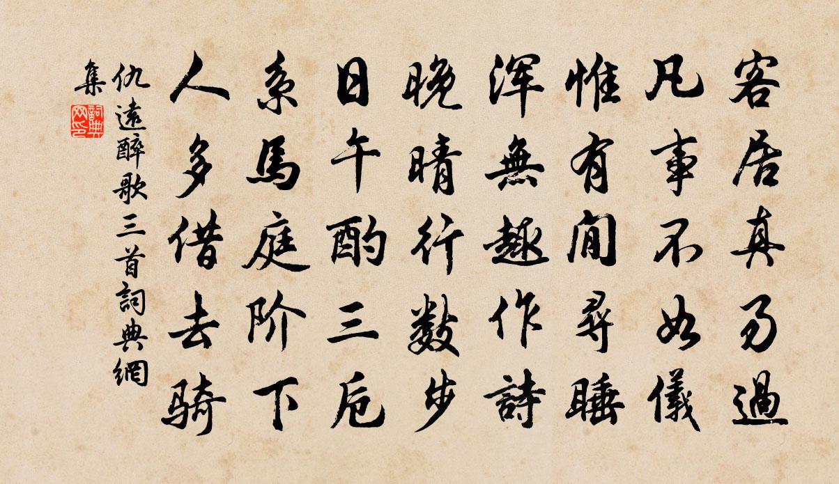 詩詞名句歷史字典書法欣賞書法字典國語詞典說文解字康熙字典古漢語字典標 題 作 者 詩 句 醉歌三首作者:仇遠 朝代:宋代醉歌三首原文客居真易過,凡事不如儀。惟有閒尋睡,渾無趣作詩。晚晴行數步,日午酌三卮。系馬庭階下,人多借去騎。詩詞問答問:醉歌三首的作者是誰?答:仇遠問:醉歌三首寫於哪個朝代?答:宋代仇遠醉歌三首書法欣賞醉歌三首書法作品詩詞推薦謫官南康軍徐誼〔宋代〕花飛片片上衣襟,拾得飛花寘柳陰。莫遣便隨流水去,東君應有惜花心。夏至過東市二絕洪咨夔〔宋代〕插遍秧疇雨恰晴,牧兒頂踵是昇平。禿穿犢鼻迎風去,橫坐牛腰趁草行。尋春溪上宋祁〔宋代〕溪上尋春春已來,小桃初似剪刀裁。今朝判與諸人醉,暫見芳菲眼亦開。暮秋閒望魏野〔宋代〕水閣閒登望,郊原欲刈禾。壞簷巢燕少,積雨病蟬多。砧隔寒溪搗,鍾隨晚吹過。扁舟何日去,江上負煙簑。贈鍾尊師游茅山李中〔唐代〕筇杖擔琴背俗塵,路尋茅嶺有誰群。仙翁物外應相遇,靈藥壺中必許分。香入肌膚花洞酒,冷侵魂夢石床雲。伊予思慮吟邵雍〔宋代〕思慮未起,鬼神莫知。不由乎我,更由乎誰。玉山觀李北之〔宋代〕巒岡經亘翠環中,中有山形如覆鏞。晉仙王郭曾登眺,名形婺女金華同。懸崖積鐵數百尺,輪囷老木參天碧。時有和之美舟行雜詩八首都門路司馬光〔宋代〕紅塵書夜飛,車馬古今跡。獨憐道傍柳,慘澹少顏色。次韻德孺感興二首黃庭堅〔宋代〕眼前嘗廢忘,事往更追尋。愛酒陶元亮,著書王仲任。寒蒲雖有節,枯木已無心。客至還須飲,逢歡起自斟。秋蘭三絕史彌寧〔宋代〕葉葉低垂翠帶長,花清乾瘦吐微香。西風劣相添寒色,簇立晴蜓凍欲僵。實相書院趙蕃〔宋代〕已矣騎鯨去不回,悵然猶詠早歸來。空餘舊日讀書地,水繞山圍似釣台。醴陵道中趙汝鐩〔宋代〕入得湖南界,皆嫌堠子長。煙岩松葉暗,風陌稻花香。橋斷人迂路,車鳴水卷塘。宿程雖不遠,木杪已斜陽。動靜雙照釋智愚〔宋代〕舉息冥方所,徒稱宋地僧。百年應自擲,一飯若為憑。風暖斬山鵲,煙消露石棱。分甘雲水共,終日任騰騰。軾近以月石硯屏獻子功中書公復以涵星硯獻純蘇軾〔宋代〕紫潭出玄雲,翳我潭中星。獨有潭上月,倒掛紫翠屏。我老不看書,默坐養此昏花睛。時時一開眼,見此雲月眼自春興七首白玉蟾〔宋代〕望中白鳥入空無,一帶青山似畫圖。宿雨初醒雲半斂,垂楊微困水平鋪。庚子八月八日再游東山寺韓縝〔宋代〕蜀師當日戍黃金,此地由來險阻深。漾水東流自紆直,泰山北望正嶔崯。涼風肅物初秋意,膏澤愆期旦書陰。同是飲南禪梅下戲題黃庭堅〔宋代〕新春江上使星回,不為離人寄早梅。愛惜幽香意如此,一樽豈是等閒來。紹興別廟樂歌五首真宗〔宋代〕霄漢月墮,郊原露晞。徽音如在,延儜來歸。有酒既清,累觴載祗。神具醉止,燕稈怡怡。思古堂傅宗教〔宋代〕何人鑿山腹,高堂跨崔嵬。悠悠百年事,滾滾隨塵埃。棄置君莫問,且復共此杯。背面美人圖高啟〔明代〕欲呼回首不知名,背立東風幾許情。莫道畫師元不見,傾城雖見畫難成。名句推薦清愁詩酒少,寒食雨風多。張鎡《寒食》 馬上相逢無紙筆,憑君傳語報平安。岑參《逢入京使》 青海長雲暗雪山,孤城遙望玉門關。王昌齡《從軍行七首·其四》 朔風吹散三更雪,倩魂猶戀桃花月。納蘭性德《菩薩蠻·朔風吹散三更雪》 生而富者驕,生而貴者傲。范曄《後漢書·列傳·崔駰列傳》 荷葉生時春恨生,荷葉枯時秋恨成。李商隱《暮秋獨游曲江》 松花釀酒,春水煎茶。張可久《人月圓·山中書事》 繡袂捧琴兮,登君子堂。貫休《善哉行·傷古曲無知音》 國將興,必貴師而重傅荀子《荀子·大略》 清愁滿眼共誰論。卻應台下草,不解憶王孫。李之儀《臨江仙·登凌歊台感懷》