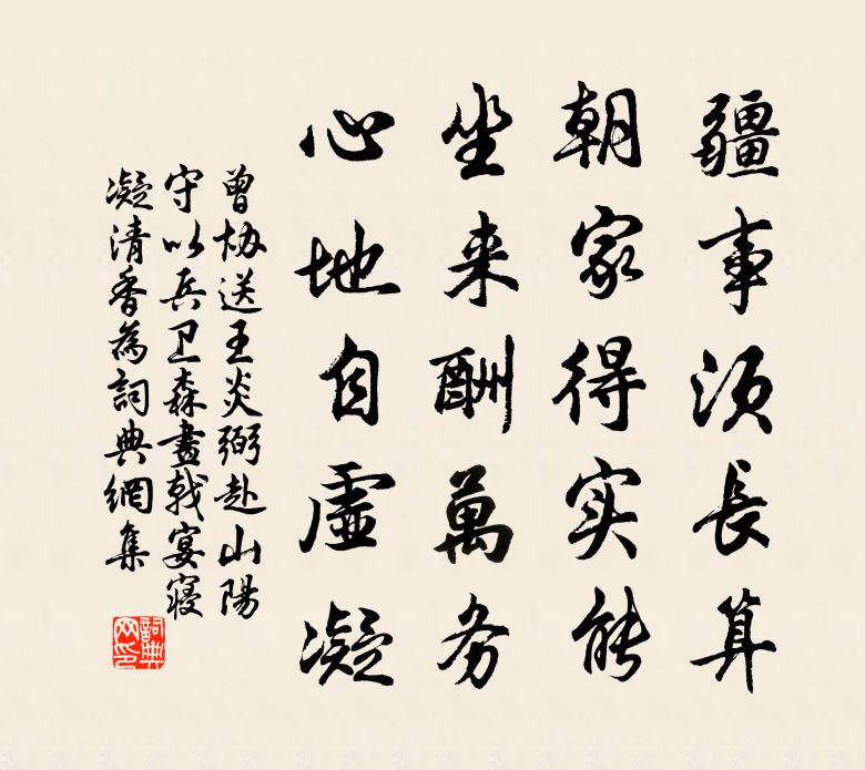 詩詞名句歷史字典書法欣賞書法字典國語詞典說文解字康熙字典古漢語字典標 題 作 者 詩 句 送王炎弼赴山陽守以兵衛森畫戟宴寢凝清香為作者:曾協 朝代:宋代原文疆事須長算,朝家得實能。坐來酬萬務,心地自虛凝。詩詞問答問:《送王炎弼赴山陽守以兵衛森畫戟宴寢凝清香為》的作者是誰?答:曾協問:該詩寫於哪個朝代?答:宋代書法欣賞送王炎弼赴山陽守以兵衛森畫戟宴寢凝清香為書法作品詩文賞析【原題】:送王炎弼赴山陽守以兵衛森畫戟宴寢凝清香為韻十首詩詞推薦和王潛齋韻送聞人松庵二首李曾伯〔宋代〕子之為術我為官,以易占之火在山。同在雙湖湖上住,大家攜手故鄉還。念奴嬌(用東坡赤壁韻)辛棄疾〔宋代〕倘來軒冕,問還是、今古人間何物。舊日重城愁萬里,風月而今堅壁。藥籠功名,酒壚身世,可惜蒙頭雪。浩歌一句盤隱末子〔宋代〕桃林我憶放牛日,茯圃誰思逸馬時。挽方粹岩仲二首劉克莊〔宋代〕上世師朱氏,慈闈祖艾軒。惓惓篡遺緒,歷歷識前言。柳記多先友,遷書賴外孫。悲哉此奇士,寂寞向寒源。護國寺秋吟八首白玉蟾〔宋代〕香篆孤煙裊,燈龕寸火微。夢和明月冷,心與白雲飛。若耶溪錢公輔〔宋代〕若耶溪出若耶山,浪影溶溶入醉顏。仙客曾因一箭贈,樵風長到五雲關。數峰蘸碧輕清外,雙舸浮春上下閒。料得高淳道中范成大〔宋代〕路入高淳麥更深,草泥沾潤馬駸駸。雨歸隴首雲凝黛,日漏山腰石滲金。老柳不春花自蔓,古祠無壁樹空陰。一簞公無渡河釋文珦〔宋代〕河源來自昆倉西,滔天沃日無津涯,櫂夫漁子不敢窺。公欲徑渡公誠痴,痴公溺死如何為。竟委骨肉於蛟螭,徒使立秋後蘇轍〔宋代〕伏中苦熱焦皮骨,秋後清風渥肺肝。天地不仁誰念爾,身心無著偶能安。詩書久為消磨日,毛褐還須準擬寒。謾許上巳日阻雨和王沖之韻王之道〔宋代〕袚除聊復對江亭,樽酒相從一笑傾。那得引時仍此樂,況逢難弟與難兄。潺潺暮雨檐間溜,滑滑春泥柳外聲。好在雜詠八首王安石〔宋代〕萬物餘一體,九州餘一家。秋毫不為小,徼外不為遐。不識壽與夭,不知貧與賒。忘心乃得道,道不去紛華。近跡信都公家白兔王安石〔宋代〕水精為宮玉為田,姮娥縞衣洗朱鉛。宮中老兔非日浴,天使潔白宜嬋娟。揚須弭足桂樹間,桂花如霜亂後前。赤鴉寄酬朱大後亭夜坐留別李回〔唐代〕十夜郡城宿,苦吟身未閒。那堪西郭別,雪路問青山。聞鶯陸九淵〔宋代〕百喙吟春不暫停,長疑春意未丁寧。數聲綠樹黃鸝曉,如笑從前著意聽。龍門看花竇庠〔唐代〕無葉無枝不見空,連天撲地徑才通。山鶯驚起酒醒處,火焰燒人雪噴風。宮詞宋白〔宋代〕微雨點月漢宮秋,水殿疏螢黑處流。鳳管不調慵進曲,卻排銀燭夜藏鉤。夫人黃氏輓詩許應龍〔宋代〕樞庭勇退古無前,內助端由婦德賢。燠館涼台供燕樂,袞衣褕翟慶聯翩。雖雲生死皆同歲,猶恨徜徉未百年。遙想緣識宋太宗〔宋代〕善惡由人作,修心勿亂為。邪求無實事,如影定相隨。妄想終成偽,行貪未可知。天生分異等,道德立尊卑。日月簡劉致中兄弟李處權〔宋代〕祖筆摩空有賦聲,長楊羽獵舊齊名。頗推門第多人物,故作樓居遠世情。我輩一生悲短褐,君家五字倚長城。武陵向察推檄至會昌賦所懷呈似二首曾豐〔宋代〕文簡家風淡,薌林句法清。今能傳幾世,君復擁全名。猶及識前輩,未嘗輕後。崆峒風月里,許我共詩盟。名句推薦茶鼎熟,酒卮揚,醉來詩興狂。張大烈《阮郎歸·立夏》 雨色秋來寒,風嚴清江爽。李白《酬裴侍御對雨感時見贈》 遙想公瑾當年,小喬初嫁了,雄姿英發。蘇軾《念奴嬌·赤壁懷古》 忍淚不能歌,試托哀弦語晏幾道《生查子·墜雨已辭雲》 君子泰而不驕,小人驕而不泰。孔子弟子《論語·子路篇》 霰雪紛其無垠兮,雲霏霏而承宇。屈原《九章》 五更鼓角聲悲壯,三峽星河影動搖。杜甫《閣夜》 君子之澤五世而斬孟子《孟子·離婁章句下·第二十二節》 登舟望秋月,空憶謝將軍。李白《夜泊牛渚懷古》 芳菊開林耀,青松冠岩列。陶淵明《和郭主簿·其二》