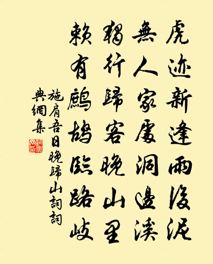 詩詞名句歷史字典書法欣賞書法字典國語詞典說文解字康熙字典古漢語字典標 題 作 者 詩 句 日晚歸山詞作者:施肩吾 朝代:唐代日晚歸山詞原文虎跡新逢雨後泥,無人家處洞邊溪。獨行歸客晚山里,賴有鷓鴣臨路岐。詩詞問答問:日晚歸山詞的作者是誰?答:施肩吾問:日晚歸山詞寫於哪個朝代?答:唐代問:日晚歸山詞是什麼體裁?答:七絕施肩吾日晚歸山詞書法欣賞日晚歸山詞書法作品注釋全唐詩:卷494-133詩詞推薦賀洪景茂葉舍試平奏仍勉為南宮之行王邁〔宋代〕喜篋天庠正妙齡,同時行輩半先登。如今纏喜紅心中。當日幾成變腳升。冀北群空看走馬,溟南路闊快摶鵬。歸來寄孫路秀才姚合〔唐代〕幽居鄰里少,江際復山阿。潮去蟬聲出,天晴鶴語多。老人能步蹇,才子奈貧何。曾見春官語,年來虛甲科。句張耒〔宋代〕惜日陶公宅,今為釋子居。自嘲陸游〔宋代〕受福元無一羽輕,豈如造物假餘生。抱痾不死躋高壽,遇亂能全見太平。投渚斷鴻常自閔,營巢倦鵲固難成。乘除次韻知縣兄蘇泂〔宋代〕秋聲物物類歌豳,旋轉天機屬大鈞。一雨薦涼全卻暑,兩湖添綠不生塵。黃花又近重陽酒,白髮長思五柳人。急喚和龍溪陳宰璉景賜石馬橋韻橋乃其父崇清作倡王邁〔宋代〕幾年公案一朝成,我睹爭先眼倍明,勢明似呈新月樣,灘腰不作怒濤聲。鰲頭地踞三千尺,鵬路天開九萬程。荷橐汴上送客(一作汴上同楊升秀才送客歸)張祜〔唐代〕河流西下雁南飛,楚客相逢淚濕衣。張翰思歸何太切,扁舟不住又東歸。臨川投贈黃彥平〔宋代〕翰林帶華蓋,天策視瀛洲。哀痛扶興運,從容贊廟謀。終篇常稱愜,兩君卻淹留。更試平原勻,方看相且侯。贈太子太傅王尚書輓詞二首梅堯臣〔宋代〕平生性忠厚,所守必尊君。面實賢愚混,心惟白黑分。事光中執法,書集右將軍。天意苦埋沒,北邙松柏墳。詩品二十四則。自然司空圖〔唐代〕俯拾即是,不取諸鄰。俱道適往,著手成春。如逢花開,如瞻歲新。真予不奪,強得易貧。幽人空山,過水采蘋。正夫草卷已就余例亦奏牘今得絕筆鄭獬〔宋代〕琳琅之寶出荊山,合作珪璋與佩環。楚澤白茅最微陋,何緣亦在貢書間。自局中歸馬上口占陸游〔宋代〕幼輿只合著山岩,誤被恩光不蓋慚。人怪衰翁煩尺一,心知造物賦朝三。飛騰豈少摩雲鶻,蹙縮方同作繭蠶。安得和十五侄見寄吳芾〔宋代〕草廬高臥幾經春,被褐深藏席上珍。已自閉門甘澹泊,不妨琢句自清新。我慚我去同流俗,日念歸來作野人。此後點絳唇(題雪中梅)仲殊〔宋代〕春遇瑤池,長空飛下殘英片。素光圍練。寒透笙歌院。莫把壽陽,妝信傳書箭。掩香面。漢宮尋遍。月里還相見。巴東有感寇準〔宋代〕長歲天涯悲斷梗,逢君無處不傷情。那堪日落紅樓伴,更聽蕭蕭杜宇聲。芙蕖王安石〔宋代〕芙蕖耐夏復宜秋,一種今年便滿溝。南盪東陂無此物,但隨深淺見游鯈。梅花引向子諲〔宋代〕花如頰。梅如葉。小時笑弄階前月。最盈盈。最惺惺。閒愁未識、無計定深情。十年空省春風面。花落花開不相見折楊柳歌許虬〔清代〕居遼四十年,生兒十歲許。偶聽故鄉音,問爺此何語。送范比部持節廣東蘇籀〔宋代〕羊城使者神仙中,苒苒叱馭凌雲蹤。繡袂吾徒強摻執,解手一舉南飛鴻。君侯烜赫標肉譜,文正烈祖忠宣父。典刑靈隱石鼓夷和尚贊釋智遇〔宋代〕面目嚴冷,狠氣如雲。攛掇翁木大,顛倒上樹。品藻果罵天,見地不親。咬牙齧齒,走石飛塵,鷲峰別有劫壺春。名句推薦窗白一聲雞,枕函聞馬嘶。顧貞觀《菩薩蠻·山城夜半催金柝》 木屑竹頭,皆為有用之物;牛溲馬渤,可備藥石之資。程登吉《幼學瓊林·卷三·人事》 忽大風起,塵氣莽莽然,城市依稀而已。蒲松齡《山市》 萬物靜觀皆自得,四時佳興與人同。程顥《秋日》 別日南鴻才北去,今朝北雁又南飛。魚玄機《閨怨》 天涯靜處無征戰,兵氣銷為日月光。常建《塞下曲四首·其一》 還君明珠雙淚垂,恨不相逢未嫁時。張籍《節婦吟·寄東平李司空師道》 狐埋之而狐搰之,是以無成功。左丘明《國語·吳語·越王勾踐命諸稽郢行成於吳》 幽音變調忽飄灑,長風吹林雨墮瓦李頎《聽董大彈胡笳聲兼寄語弄房給事》 利出者實及,怨往者害來。列子及其弟子《列子·說符》