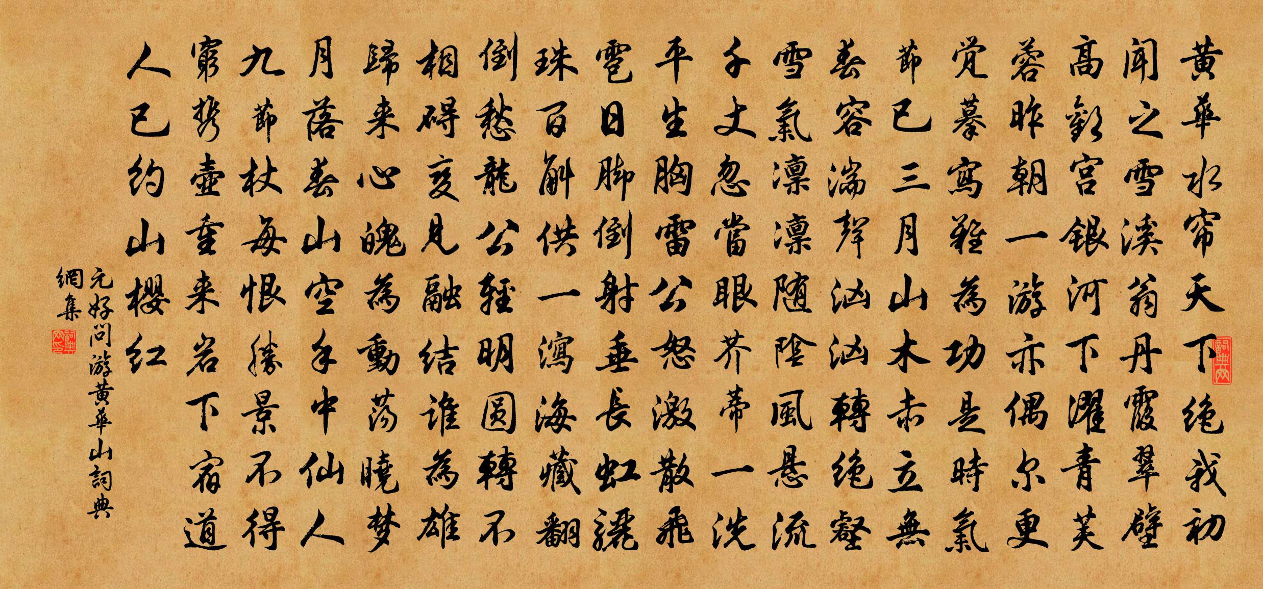 摹(mó)寫:照著樣子寫字或繪畫,此指照著景物寫詩,亦即寫詩描寫、黃華爆布。