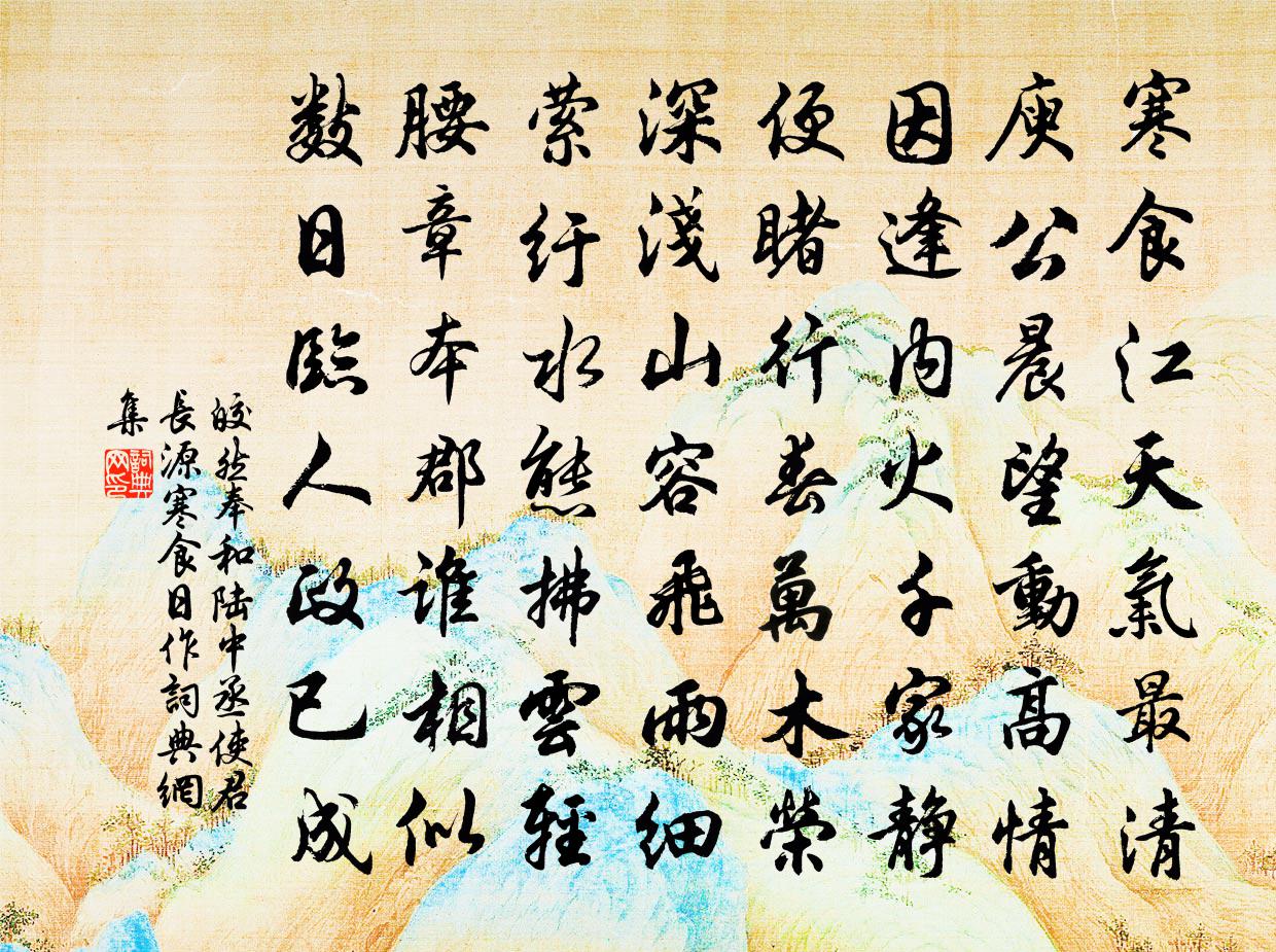 詩詞名句歷史字典書法欣賞書法字典國語詞典說文解字康熙字典古漢語字典標 題 作 者 詩 句 奉和陸中丞使君長源寒食日作作者:皎然 朝代:唐代原文寒食江天氣最清,庾公晨望動高情。因逢內火千家靜,便睹行春萬木榮。深淺山容飛雨細,縈紆水態拂雲輕。腰章本郡誰相似,數日臨人政已成。詩詞問答問:《奉和陸中丞使君長源寒食日作》的作者是誰?答:皎然問:該詩寫於哪個朝代?答:唐代問:該詩是什麼體裁?答:七律書法欣賞奉和陸中丞使君長源寒食日作書法作品注釋全唐詩:卷816-37詩詞推薦次韻何茂恭永新見寄之什喻良能〔宋代〕起家從吏役,寧為貪無魚。遊樂廢山澤,懷歸畏簡書。文章簿領外,風采折腰餘。臥轍從茲始,為謀未覺疏。舟過安仁五首楊萬里〔宋代〕渭川千頃在詩胸,不管屠羊肆里空。蹈破菜園妨底事,莫教蹈到竹園中。愛竹歌鄭思肖〔宋代〕此君氣節極偉特,令人愛之捨不得。遍造山水有竹處,不問主人識不識。朝朝暮暮看不足,感得碧光透雙目。一旦和子華兄喜雨韓維〔宋代〕膏潤涵濡萬物中,欣然生意滿和風。{左扌右嵌}飄先動吟毫紫,急灑疑催舞袂紅。病手便甘千日醉,疲農又得一金蓮出玉花 贈范明叔棕扇馬鈺〔元代〕*絲為扇。堪與閒人常作善。驚唬蚊蠅。款款輕搖免殺生。添成幽雅。相助逍遙塵不惹。拂盡攀緣。意淨心清性月朝中措曾覿〔宋代〕休論社燕與秋鴻。時節太匆匆。海上一番微雨,朱門濃綠陰中。主人情厚,金杯滿泛,且共從容。莫問鶯花俱老,秋霽(西湖十詠·平湖秋月)陳允平〔宋代〕千頃玻璃,遠送目斜陽,漸下林闐。題葉人歸,采菱舟散,望中水天一色。碾空桂魄。玉繩低轉雲無跡。有素鷗,沁園春(無為燈夕上陸史君)楊元亨〔宋代〕一棹橫江,問訊盟鷗,太守謂誰。道皇華使者,光風灑落。元宵三五,樂與民俱。寶榼金韉,玉梅釵燕,鬥鴨闌乾和季弟韻二十首劉克莊〔宋代〕何處有禾三百廛,芋區止在舍西邊。室如蒙叟生虛白,詩賽唐人選極玄。耐久不如常友石,固窮未肯便兄錢。春晴總題葛紹體〔宋代〕塘曲椒和桑共老,山頭松與麥齊青。人家歲計村南北,似識豳風舊典刑。自詰陸游〔宋代〕修行力量淺,觸事常寡悰。端居本年事,奈此百憂攻。今晨默自語:世豈不汝容?漱濯臨清流,嘯歌蔭長松。緩步西江月(為內子壽)呂勝己〔宋代〕日日齊眉舉案,年年勸酒持觥。今年著意壽卿卿。幼稚綿綿可慶。官冷未嘗貧賤,家肥勝似功名。所為方便合人情送周山人李覯〔宋代〕鬼事無形尚可疑,人倫有驗從皆知。武夷山路幾百里,歸去西風落葉時。讀王摩詰詩愛其散發晚未簪道書行尚把之句因陸游〔宋代〕稚川師鄭君,才及一卷書。書大僅如箸,度世蓋有餘。想其所論說,妙極軒昊初。內篇今雖存,亦復飽蠹魚。我欲送小師遊方釋法薰〔宋代〕莫辭腳力造諸方,佛法無多要久長。歷盡崎嶇到平地,歸來掀倒破禪床。留春吳洞明〔宋代〕柴門深閉莫嫌猜,為怕春歸不敢開。幾樹好花風{左扌右棄}去,一池新水雨添來。冥搜秀色增詩料,款挹晴光入百舌鄭愔〔唐代〕百舌鳴高樹,弄音無常則。借問聲何煩,末俗不尚默。第一百零七卷種花朱慶餘〔唐代〕憶昔兩京官道上,可憐桃李晝陰垂。不知誰作巡花使,空記玄宗遣種時。凱歌十首呈賈樞使劉克莊〔宋代〕活俘萬戶虜無酋,拔寨宵奔黑祲收。不用偏師追出塞,殺胡林只在揚州。江上聞笛釋智圓〔宋代〕夜久聞橫笛,寥寥景更賒。天容垂極岸,月色冷平沙。靜引鄉心遠,閒驚旅鬢華。哀音殊未已,可處落梅花。名句推薦夫有尤物,足以移人左丘明《左傳·昭公·昭公二十八年》 春風疑不到天涯,二月山城未見花。歐陽修《戲答元珍》 北客翩然,壯心偏感,年華將暮。朱敦儒《水龍吟·放船千里凌波去》 寧為雞口,無為牛後。劉向《戰國策·韓一·蘇秦為楚合從說韓王》 忽聞歌古調,歸思欲沾巾。杜審言《和晉陵陸丞早春遊望》 文章是山水化境,富貴乃煙雲幻形。王永彬《圍爐夜話·第一二二則》 惆悵東欄一株雪,人生看得幾清明。蘇軾《東欄梨花》 將軍發白馬,旌節度黃河。李白《發白馬》 人生在勤,不索何獲。范曄《後漢書·列傳·張衡列傳》 會當凌絕頂,一覽眾山小。杜甫《望岳》