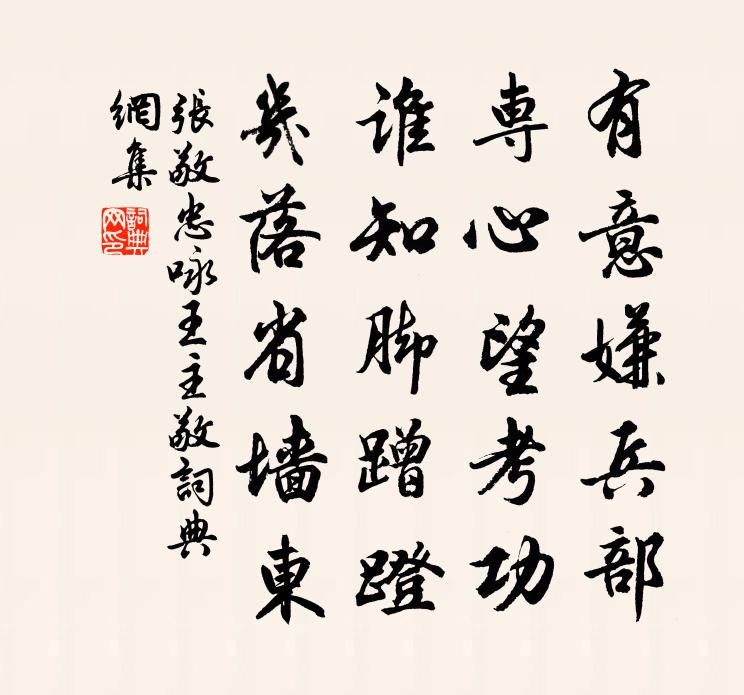 詩詞名句歷史字典書法欣賞書法字典國語詞典說文解字康熙字典古漢語字典標 題 作 者 詩 句 詠王主敬作者:張敬忠 朝代:唐代詠王主敬原文有意嫌兵部,專心望考功。誰知腳蹭蹬,幾落省牆東。詩詞問答問:詠王主敬的作者是誰?答:張敬忠問:詠王主敬寫於哪個朝代?答:唐代問:詠王主敬是什麼體裁?答:五絕張敬忠詠王主敬書法欣賞詠王主敬書法作品注釋全唐詩:卷75_11詩詞推薦送楊瑗尉南海岑參〔唐代〕不擇南州尉,高堂有老親。樓台重蜃氣,邑里雜鮫人。海暗三山雨,花明五嶺春。此鄉多寶玉,慎莫厭清貧。偈頌一百二十三首釋祖欽〔宋代〕弄晴微雨顯春風,柳自青青花自紅。寄語遊人急回首,歌樓不在畫橋東。祝英台近(同妓游帥司東園)劉過〔宋代〕窄輕衫,聯寶轡,花里控金勒。有底風光,都在畫闌側。日遲春暖融融,杏紅深處,為花醉,一鞭春色。對嬌質。挽張材卿知郡陳傅良〔宋代〕貂蟬不逮老端明,世濟誰如好弟兄。能著青衫諧計吏,卻將白髮去邊城。夜魂俄斷凝香寢,秋淚仍兼曳履聲。萬石江上寄隱者武元衡〔唐代〕歸舟不計程,江月屢虧盈。靄靄滄波路,悠悠離別情。蒹葭連水國,鼙鼓近梁城。卻憶沿江叟,汀洲春草生。禪人並化主寫真求贊釋正覺〔宋代〕形聲幻為,聞見智隨。自然出礙,平等何疑。瑩明而絕累,圓應而無疵。而今問你,且道是誰。頭陀贊黃庭堅〔宋代〕梵語頭陀,華言抖擻。淨一真心,振三毒垢。如來親試,迦葉稱首。聖教推崇,哲人遵守。衣三食四,住處五名。中秋夕始平公命與考校諸君賦詩司馬光〔宋代〕月華秋色兩鮮新,萬里澄空不受塵。兔濯素毛騰浩露,桂飄香實下飛輪。光侵酒面寒無力,清入詩豪健有神。座客硬梅李龍高〔宋代〕風棱玉面耿無塵,鐵脊今成老大身。莫怪一身多崛強,渠儂元是石心人。南浦程垓〔宋代〕金鴨懶薰香,向晚來春酲,一枕無緒。濃綠漲瑤窗,東風外、吹盡亂紅飛絮。無言佇立,斷腸惟有流鶯語。碧雲欲挽克齋陳先生四首徐元傑〔宋代〕薰炙儒先早,朱門授受親。去尋顏巷樂,歸詠點雩春。道妙窮精一,心傳有省循。樂天知命者,憂道不憂貧。滿江紅趙希蓬〔宋代〕勁節剛姿,誰與比、歲寒松柏。幾度欲、排雲呈腹,叩頭流血。杜老愛君□謾苦,賈生流涕衣空濕。為國家、子細頌古一百則釋正覺〔宋代〕搖頭擺尾赤梢鱗,徹底無依解轉身。截斷舌頭饒有術,拽回鼻孔妙通神。夜明簾外兮風月如晝,枯木岩前兮花卉長城南雜詠二十首濯清亭張栻〔宋代〕芙蓉豈不好,濯濯清漣漪。采之不盈把,怊悵暮忘飢。病思陸游〔宋代〕西山雪外巢松客,南嶽岩前洗缽僧。平日寄懷常在此,秋風剩欲辦行縢。菩薩蠻(用周美成韻)盧炳〔宋代〕而今怕聽相思曲。多情蹙損眉峰綠。惜別上扁舟。望窮江際樓。蠻箋封了發。為憶人如雪。離恨寫教看。休令盟約真游覓唐輿題詩不見有懷其人八首趙蕃〔宋代〕去矣不為難,山長水又寬。未曾搖短棹,已自失危欄。厚意煩三友,相要下急灘。雖然賒執手,顧免別辭酸。句曹希蘊〔宋代〕記得小軒岑寂夜,月移疏影上東牆。檄至德慶舟中晚眺曾豐〔宋代〕雨過山毛淨,潮生水面平。群鴉團晚色,一鵲發秋聲。所至好為客,其容寬作程。吾痴愁不了,愁亦太痴生。水調歌頭佚名〔宋代〕帆落松陵浦,枯柳纜瓊艘。杖策無人獨步,浪厭百花橋。我掛風裳水佩,一笑波寒月白,餘韻觸驚濤。絕景有誰賞名句推薦秋聲萬戶竹,寒色五陵松。李頎《望秦川》 公天下之身,公天下之物,其唯至人矣!列子及其弟子《列子·楊朱》 柔條紛冉冉,葉落何翩翩。曹植《美女篇》 伯牙鼓琴,志在高山佚名《伯牙鼓琴/伯牙絕弦》 燕子不歸春事晚,一汀煙雨杏花寒。戴叔倫《蘇溪亭》 木落山空天遠大,送飛鴻、北去傷懷久。戴復古《賀新郎·寄豐真州》 百年成之不足,一旦壞之有餘。佚名《增廣賢文·上集》 湖南為客動經春,燕子銜泥兩度新。杜甫《燕子來舟中作》 折戟沉沙鐵未銷,自將磨洗認前朝。杜牧《赤壁》 秋風吹地百草乾,華容碧影生晚寒。李賀《開愁歌》