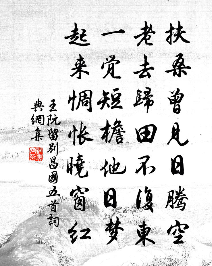詩詞名句歷史字典書法欣賞書法字典國語詞典說文解字康熙字典古漢語字典標 題 作 者 詩 句 留別昌國五首作者:王阮 朝代:宋代留別昌國五首原文扶桑曾見日騰空,老去歸田不復東。一覺短檐他日夢,起來惆悵曉窗紅。詩詞問答問:留別昌國五首的作者是誰?答:王阮問:留別昌國五首寫於哪個朝代?答:宋代王阮留別昌國五首書法欣賞留別昌國五首書法作品詩詞推薦送李緗盧綸〔唐代〕舊國仍連五將營,儒衣何處謁公卿。波翻遠水蒹葭動,路入寒村機杼鳴。嵇康書論多歸興,謝氏家風有學名。為問次韻景仁雪霽王安石〔宋代〕新聲生屋溜,殘點著垣衣。委翳無多在,飄雲不更飛。坳中余宿潤,暖處自朝暉。稍見青青色,還從柳上歸。皋橋岩中道院與梁中砥商嚴翁會飲陳深〔宋代〕夙有岩中約,今晨得得來。幽窗六人坐,清思一時開。雪下宜看竹,天寒未見梅。人生良會少,莫惜共持杯。偈頌七十六首釋子益〔宋代〕天寒地冷,晝短夜長。死灰撥盡,沒可商量。昨夜三更月到窗。益壽美金花侯善淵〔元代〕玄瑛精粹。寶潔靈華風秀瑞。混內相凝。星郁祥光滿室明。純陽仙質。貌麗清華乘鳳翼。栗御霞輕。升入雲深玩玉即事二首晁說之〔宋代〕藥苗晚種已青青,應念尪羸與養形。肯為嵇生徒著論,便同玄晏剩翻經。禪人寫師真請贊釋慧遠〔宋代〕斷滅佛種,破除家計。不是別人,楊岐五世。禪道耳邊風,佛法眼中翳。問渠將底為人,尚有隨身赤契。五言送李侍御聯句顏真卿〔唐代〕吾友駐行輪,遲遲惜上春。 ——顏真卿東西出餞路,惆悵獨歸人。 ——皎然歡會期他日。驅馳恨此身。 ——奉和九日幸臨渭亭登高應制得亭字楊廉〔唐代〕遠目瞰秦坰,重陽坐灞亭。既開 * 酒,還降紫微星。簫鼓諳仙曲,山河入畫屏。幸茲陪宴喜,無以效丹青。偈頌三十六首釋如珙〔宋代〕夜來地動葭灰起,百草頭邊一寸春。抖摟精神急薦取,生老病死不饒人。早春晁說之〔宋代〕日日江頭騁望頻,東風去歲舊相親。庾郎於作披香賦,未有花開未是春。紅梅牛士良〔宋代〕隴頭人未來,江南春幾許。惆悵玉笛聲,吹落胭脂雨。再次韻十首陳造〔宋代〕靖節瓶無粟,思歸更命車。慵垂督郵帶,況袖子公書。老我須閒適,塵緣得破除。還應與鷗鷺,分占碧溪漁。晦日重宴高氏林亭(見《歲時雜詠》)陳子昂〔唐代〕公子好追隨,愛客不知疲。象筵開玉饌,翠羽飾金卮。此時高宴所,詎減習家池。循涯倦短翮,何處儷長離。僧師源畫觀音贊陸游〔宋代〕三世如來同一鬨,大雨料作補陀夢。佛子無財可修供,尺紙寸毫俱妙用。寳纓天冠儼四眾,長年造極筆愈縱。唯師久過重陽菊英粲然即事十首方回〔宋代〕江南菊花差晚開,把酒前蘭復後梅。天公何嘗負此老,天下腐儒臣方回。送顧非熊下第歸朱慶餘〔唐代〕但取詩名遠,寧論下第頻。惜為今日別,共受幾年貧。聽雨宿吳寺,過江逢越人。知從本府薦,秋晚又辭親。胡氏逢慶堂詩用秉成兄韻周必大〔宋代〕柿紅萱花映階濃,泥紫芝函帶璽封。善積古稱家有慶,身強今看子其逢。壽觴莫惜斟三雅,祿養猶期饌萬鍾。樂與以詩句詠梅林中笑破冰霜面方蒙仲〔宋代〕澹寂自天姿,逢人借顏色。一笑比河清,希仁太孤特。挽程推官二首陳淳〔宋代〕壯歲聲場屋,高年僅小行。鄫江夷暴跡,湟水雪冤情。節志冰壺潔,襟期玉井清。竟登皇石趣,勇去謝榮名。名句推薦糟糠不飽者不務粱肉,短褐不完者不待文繡。韓非及後人《韓非子·五蠹》 禍不好,不能為禍。左丘明《國語·周語·太子晉諫靈王壅谷水》 泥上偶然留指爪,鴻飛那復計東西。蘇軾《和子由澠池懷舊》 草樹知春不久歸,百般紅紫斗芳菲。韓愈《晚春》 沅水通波接武岡,送君不覺有離傷。王昌齡《送柴侍御》 正身直行,眾邪自息。劉安及其門客《淮南子·繆稱訓》 獨有宦遊人,偏驚物候新。杜審言《和晉陵陸丞早春遊望》 故人溪上,掛愁無奈,煙梢月樹。史達祖《留春令·詠梅花》 昔歲逢太平,山林二十年。元結《賊退示官吏》 少小離家老大回,鄉音無改鬢毛衰。賀知章《回鄉偶書二首·其一》