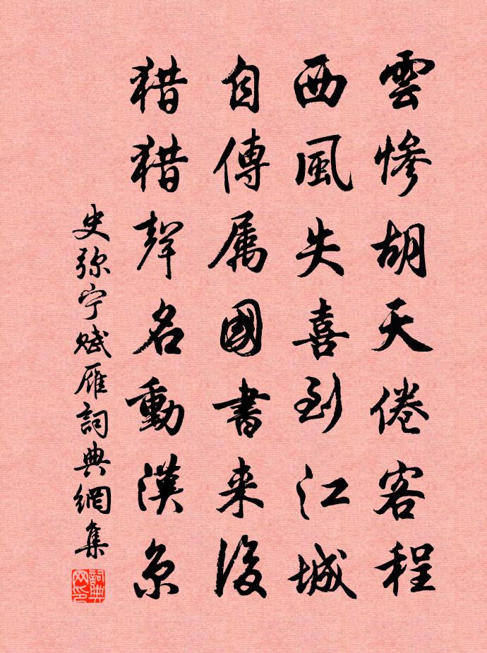 詩詞名句歷史字典書法欣賞書法字典國語詞典說文解字康熙字典古漢語字典標 題 作 者 詩 句 賦雁作者:史彌寧 朝代:宋代賦雁原文雲慘胡天倦客程,西風失喜到江城。自傳屬國書來後,獵獵聲名動漢京。詩詞問答問:賦雁的作者是誰?答:史彌寧問:賦雁寫於哪個朝代?答:宋代史彌寧賦雁書法欣賞賦雁書法作品詩詞推薦挽陳師復寺丞二首劉克莊〔宋代〕歲晚滄洲築草堂,卻將逢掖換軒裳。市朝共嘆鳳高翥,世俗或疑麟不祥。童子舉扶猶忼慨,門人要絰各淒涼。衰殘頌古一百二十一首釋宗杲〔宋代〕使得十二時辰,呼來卻教且去。倚官挾勢欺人,茫茫無本可據。步蟾宮呂岩〔唐代〕坎離乾兌逢子午,須認取,自家根祖。地雷震動山頭雨,要洗濯黃牙土。捉得金精牢閉錮,煉甲庚,要生龍虎。待命子 其四陶淵明〔魏晉〕渾渾長源,蔚蔚洪柯。群川載導,眾條載羅。時有語默,運因隆寙。在我中晉,業融長沙。重葉梅辛棄疾〔宋代〕主人情意深,不管江妃怨。折我最繁枝,不許冰壺薦。自安仁至豫章途中雜興十九首趙蕃〔宋代〕漠漠平蕪遠際天,青山若個暗霾煙。行人更說橋新斷,試遣招呼與借船。余假守是邦所幸今夏雨澤適中高下鹹宜客有謂虞儔〔宋代〕騷人墨客可無詩,正值秋郊刈穫時。此日三登殊可樂,向來半菽亦堪悲。家家芋栗兒童喜,處處雞豚父老期。負郭過盧秦卿舊居司空曙〔唐代〕五柳茅茨楚國賢,桔槔蔬圃水涓涓。黃花寒後難逢蝶。紅葉晴來忽有蟬。韓康助采君臣藥,支遁同看內外篇。為問春晚即事趙師秀〔宋代〕一身來作吏,白日算徒勞。塵土侵衣重,年光如鬢牢。春深禽語改,溪落岸沙高。柳下垂釣者,吾今愧爾曹。陪淮南轉運魏兵部游穎州女郎台寺梅堯臣〔宋代〕舊傳媯氏女,將適楚人時。築館自臨水,故台空此基。因為楚宮媵,來與使車期。樓上望湖上,煙林晚蔽虧。烏夜啼佚名〔宋代〕水漫汀洲新綠,雲開崦嶂微青。殘紅不見成陰後,鶗鴂寂無聲。笑傲坡詩一夢,風流杜牧三生。西湖依舊人中意,和韋開州盛山十二首盤石磴張籍〔唐代〕壘石盤空遠,層層勢不危。不知行幾匝,得到上頭時。河傳孫光憲〔唐代〕太平天子,等閒遊戲,疏河千里。柳如絲,偎倚。綠波春水,長淮風不起。如花殿腳三千女,爭雲雨,何處留人住寄石泉雲間明府叔陳必復〔宋代〕容易成離索,臨分重忍言。夜船楊柳岸,曉枕荻花村。山雨斷雲肢,溪風生浪痕。懸知自公退,懷抱欠同論。偈十六首釋行瑛〔宋代〕上不見天,下不見地。把定咽喉,何處出氣。江南江北,絕毫絕釐。東土西天,成團成塊。釋迦彌勒,尚自瞞盱。送李郛葉適〔宋代〕蓋代才難看獨手,眾參聞見其來久。流風莫盛元佑時,崛起誰當紹興後。嗟君探討窮一生,心通文字難力爭。雀啄春情寄子安魚玄機〔唐代〕山路欹斜石磴危,不愁行苦苦相思。冰銷遠澗憐清韻,雪遠寒峰想玉姿。莫聽凡歌春病酒,休招閒客夜貪棋。如松【越調】憑闌人 題情_翰墨空題鸞吳西逸〔元代〕翰墨空題鸞鳳箋,雲水虛勞魚雁傳。些情鐵石堅,鐵石知幾年? 棲燕樓台詩思迷,睡鴨池塘春漏遲。滿身花影夏日宋伯仁〔宋代〕泓泓圓碧漾新荷,獵獵斜風顫綠莎。農事正忙三月後,野田齊唱插秧歌。水龍吟辛棄疾〔宋代〕斷崖千丈孤松,掛冠更在松高處。平生袖手,故應休矣,功名良苦。笑指兒曹,人間醉夢,莫嗔驚汝。問黃金餘幾名句推薦前不見古人,後不見來者。陳子昂《登幽州台歌》 俯視洛陽川,茫茫走胡兵。李白《古風·其十九》 知君獨坐青軒下,此時結念同所懷。李白《早秋單父南樓酬竇公衡》 平生端有活國計,百不一試薶九京。黃庭堅《送范德孺知慶州》 不可同日而語畢沅《續資治通鑑·宋紀·宋紀七十三》 犯刑若履虎,不畏落爪牙。李白《秦女休行》 君莫舞,君不見、玉環飛燕皆塵土!辛棄疾《摸魚兒·更能消幾番風雨》 天然一段風騷,全在眉梢;平生萬種情思,悉堆眼角。曹雪芹《紅樓夢·第三回》 玉手佳人,笑把琵琶理。顧德輝《蝶戀花·春江暖漲桃花水》 春夢隨雲散,飛花逐水流,寄言眾兒女,何必覓閒愁。曹雪芹《紅樓夢·第五回》