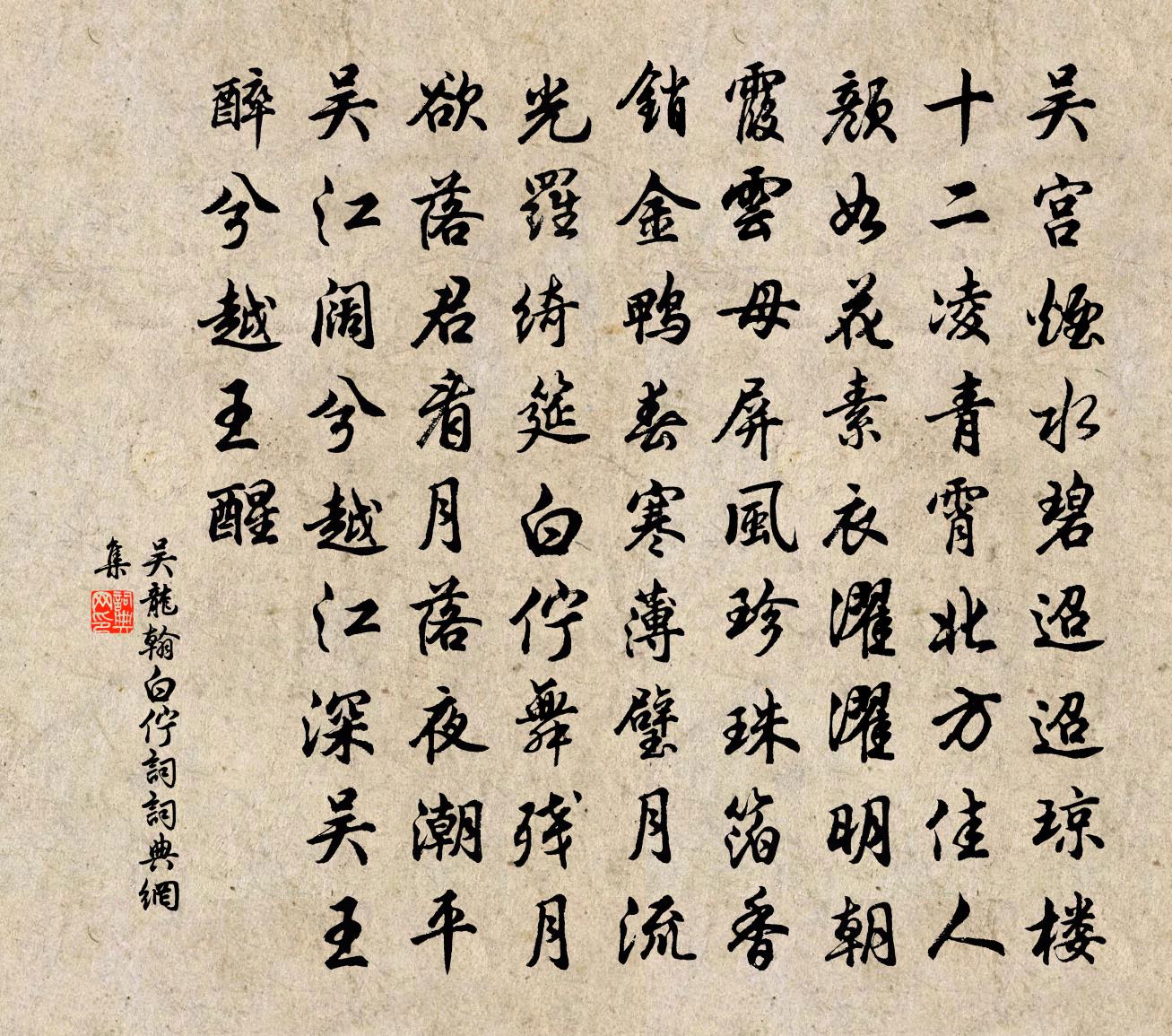 詩詞名句歷史字典書法欣賞書法字典國語詞典說文解字康熙字典古漢語字典標 題 作 者 詩 句 白佇詞作者:吳龍翰 朝代:宋代白佇詞原文吳宮煙水碧迢迢,瓊樓十二凌青霄。北方佳人顏如花,素衣濯濯明朝霞。雲母屏風珍珠箔,香銷金鴨春寒薄。璧月流光羅綺筵,白佇舞殘月欲落。君看月落夜潮平,吳江闊兮越江深,吳王醉兮越王醒。詩詞問答問:白佇詞的作者是誰?答:吳龍翰問:白佇詞寫於哪個朝代?答:宋代吳龍翰白佇詞書法欣賞白佇詞書法作品詩詞推薦三月十八日雪中作溫庭筠〔唐代〕芍藥薔薇語早梅,不知誰是艷陽才。今朝領得春風意,不復饒君雪裡開。採菊盧祖皋〔宋代〕旋移 * 不嫌遲,晴日霜庭晚更宜。閒倚石闌衫袖薄,偶然愁思入新詩。濟州道中寄葉勛秀才晁補之〔宋代〕曉路入西郊,新霜著鬢毛。貧交借羸馬,慈母授征袍。野靜狐狸出,天寒雁鵠高。艱難憶親舊,清淚漬平皋。偈六十九首釋道寧〔宋代〕出家佛子,物外高流。挈錫攜缸,訪尋知識。須是踏著自己穩實田地,方解茆庵石室折腳鐺兒。煮粥煎茶,接待往夏夜飲客陳造〔宋代〕矻矻官曹興易窮,得閒何惜一樽同。傍愁邊到無惡客,從竹間來皆好風。勝日詩狂輸酒聖,轉頭渭北復江東。雕鞍過潤陂橋三首楊萬里〔宋代〕歷覽溪中有底鳴,蕭然蘆葉蓼花汀。元來轎頂鳴鳴響,將謂風聲是鴈聲。初夏懷故山陸游〔宋代〕鏡湖四月正清和,白塔紅橋小艇過。梅雨晴時插秧鼓,苹風生處采菱歌。沉迷簿領吟喔少,淹泊蠻荒感慨多。誰謂盩厔客舍耿湋〔唐代〕寥寂荒壘下,客舍雨微微。門見苔生滿,心慚吏到稀。籬花看未發,海燕欲先歸。無限堪惆悵,誰家復搗衣。寒食應制韋承慶〔唐代〕鳳城春色晚,龍禁早暉通。舊火收槐燧,餘寒入桂宮。鶯啼正隱葉,雞斗始開籠。藹藹瑤山滿,仙歌始樂風。問俗李新〔宋代〕窮極天窺涘,幽陰地絕春。石壇荒拆鬼,藥媼下羌神。頭號雀分疏事,晴山親近人。刲羊留髓骨,正欲卜歸辰。康衢謠先秦無名〔先秦〕立我烝民。莫匪爾極。不識不知。順帝之則。次韻喜陳吉老還家二絕黃庭堅〔宋代〕公庭無事吏人休,垂箔寒廳對弈秋。催織青籠篘白酒,竹爐煨栗煮雞頭。朝中措(壽劉仲吉)熊節〔宋代〕麒麟早貴掛朝冠。自合侍金鑾。收拾經綸事業,從容遊戲人間。祗今侍彩,符分楚甸,名在蓬山。直待疏封大國,答李希淳屯田三首邵雍〔宋代〕胸中日月時舒慘,筆下風雲旋合離。老去無成尚如此,不知成後更何為。度關山王貞白〔唐代〕只領千餘騎,長驅磧邑間。雲州多警急,雪夜度關山。石響鈴聲遠,天寒弓力慳。秦樓休悵望,不日凱歌還。和參政丁侍郎從駕出獵宋庠〔宋代〕詔蹕承冬令,郊幾闢獰場。鉤陳來作衛,袀服正騰裝。表野千旌合,舒圍萬騎張。清塵風效職,捧轡日呈祥。寶畤贈處士林逋龔宗元〔宋代〕高蹈遺塵蛻,含華傲素園。璜溪頻下釣,惠帳不驚猿。養浩時清嘯,忘機只寓言。幾回生蝶翅,明月在西軒。梅花趙彥端〔宋代〕南山如佳人,迥立未可親。而況得道者,其間梅子真。頌古十九首釋法全〔宋代〕幾回沾水又拖泥,年老心孤不自知。遊子不歸空悵望,一溪流水落花隨。呈潘潭州十首趙蕃〔宋代〕臂膝真成具老形,每逢趨走嘆伶仃。故園松菊幸亡恙,何日扶藜得屢經。名句推薦嶺外音書斷,經冬復歷春。宋之問《渡漢江》 信人莫若信己,防人毋存幸念。來俊臣《羅織經·閱人卷第一》 今夕不登樓,一年空過秋。高觀國《菩薩蠻·何須急管吹雲暝》 對此懷素心,千里共明月德隱《新秋晚眺》 凡與敵戰,其將愚而不知變,可誘之以利。佚名《百戰奇略·第五卷·利戰》 曲港跳魚,圓荷瀉露,寂寞無人見。蘇軾《永遇樂·彭城夜宿燕子樓》 明主思短而益善,暗主護短而永愚。吳兢《貞觀政要·卷二·論求諫》 日暮鄉關何處是?煙波江上使人愁。崔顥《黃鶴樓 / 登黃鶴樓》 淚濕羅巾夢不成,夜深前殿按歌聲。白居易《後宮詞》 烹羊宰牛且為樂,會須一飲三百杯。李白《將進酒》
