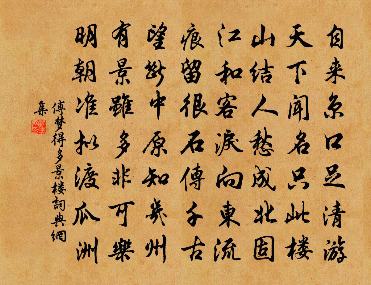 詩詞名句歷史字典書法欣賞書法字典國語詞典說文解字康熙字典古漢語字典標 題 作 者 詩 句 多景樓作者:傅夢得 朝代:宋代多景樓原文自來京口足清游,天下聞名只此樓。山結人愁成北固,江和客淚向東流。痕留很石傳千古,望斷中原知幾州。有景雖多非可樂,明朝準擬渡瓜洲。詩詞問答問:多景樓的作者是誰?答:傅夢得問:多景樓寫於哪個朝代?答:宋代傅夢得多景樓書法欣賞多景樓書法作品詩詞推薦偈六十三首釋道寧〔宋代〕禪人莫莽鹵,二月又初五。透徹祖師關,一句該今古。春色無高下,園林花木紅。總持門大啟,何處覓圓通。休問雜曲歌辭。行路難翁綬〔唐代〕行路艱難不復歌,故人榮達我蹉跎。雙輪晚上銅梁雪,一葉春浮瘴海波。自古要津皆若此,方今失路欲如何。君看景德祀九宮貴神三首佚名〔宋代〕倬彼垂象,照臨下土。躔次運行,功德周普。九宮既位,惟德是輔。神之至上,皇皇斯覩。嘗北梨葛天民〔宋代〕每到年頭感物華,新嘗梨到野人家。甘酸尚帶中原味,腸斷春風不見花。木芙蓉李流謙〔宋代〕秋光冷如冰,秋花淡無色。偶見此粲者,濃 * 孤寂。天寒翠袖薄,那得在空谷。東風嬖桃李,倚樹三嘆息。偈頌一百零九首釋可湘〔宋代〕直下便瞥,炎天降雪。當今蹉者一回,前面煞有酷熱。那堪鐵彈鑄未成,臘八冰不結。且過六月七月八月,更聽松居士問馬祖不與萬法為侶圖贊釋紹曇〔宋代〕萬法本空,與誰為侶。道得十成,難為共語。雨中移竹梅堯臣〔宋代〕荷鍤冒秋霖,蕭條移翠竹。欲分溪上陰,聊助池邊綠。中散林未開,子猷心已足。青青謝栽培,豈愧凡草木。對月了殘經贊釋了惠〔宋代〕麻線貫行針,太陽相對面。通身破綻多,如何補得遍。簡虞子建張鎡〔宋代〕虞君借屋王城裡,閉門端從窮經史。游謁俱非射利徒,名公往往為如已。年來清貧漸到骨,造命由天常自委。屬客為運使蔡國博壽二首衛涇〔宋代〕西山南浦氣蔥蔥,夜擁長庚粲碧空。惠露昔霑江漢表,使星今照鬥牛中。晚粳已喜霜前熟,宿麥應從雨后豐。十一對菊花二首張耒〔宋代〕躬耕遇歲真吾事,牛下齊兒婦妾歌。招飲風煙過閒日,遶籬栽菊可如何。炙背俯晴軒詩樓鑰〔宋代〕炙背情方適,融霜日正暾。何妨憑曲幾,相與俯晴軒。愛景欣亭午,閒身得負暄。映檐成白醉,挾纊謝奇溫。豈止謝小娥夢盜姓名佚名〔唐代〕車中猴,門東草。禾中走,一日夫。四月十三日池上飲晁公溯〔宋代〕圓荷受白露,可愛池上涼。相將攜筇來,羽衣颯飄揚。停觴待明月,少焉出西方。澄波照河漢,俯仰清茫茫。悠然宿船家小舟中凡三日夜作此李流謙〔宋代〕自昔說離亂,經時足嘆吁。何為來曠野,端是辱泥塗。相國跛男子,封侯裸丈夫。未須多感慨,事業出艱虞。至華藏寺先呈璉長老張鎡〔宋代〕切莫撞鐘領眾迎,作家相見要情真。亦庵自是優婆塞,知事當人定不瞑。次韻子瞻和淵明飲酒二十首蘇轍〔宋代〕諸妄不可賴,所賴惟一真。內欲求性命,油然反清淳。外將應物化,致一常日新。商於四父老,攜手初逃秦。翻然春夜溫故六言二十首劉克莊〔宋代〕相郎穴廚而竊,王相坎壁以藏。十襲為傳家寶,一點無入已贓。酹江月(戲題玉林)黃升〔宋代〕玉林何有,有一彎蓮沼,數間茅宇。斷塹疏籬聊補葺,那得粉牆朱戶。禾黍秋風,雞豚曉日,活脫田家趣。客來茶名句推薦寄治亂於法術,托是非於賞罰韓非及後人《韓非子·大體》 愁無限,消瘦盡,有誰知?閒教玉籠鸚鵡念郎詩。納蘭性德《相見歡·落花如夢淒迷》 江流石不轉,遺恨失吞吳。杜甫《八陣圖》 蕃漢斷訊息,死生長別離。張籍《沒蕃故人》 嘆隙中駒,石中火,夢中身。蘇軾《行香子·述懷》 香霧雲鬟濕,清輝玉臂寒。杜甫《月夜》 三杯吐然諾,五嶽倒為輕。李白《俠客行》 莫避春陰上馬遲。春來未有不陰時。辛棄疾《鷓鴣天·送歐陽國瑞入吳中》 鼓吹助清賞,鴻雁起汀洲。蘇轍《水調歌頭·徐州中秋》 其人雖已沒,千載有餘情。陶淵明《詠荊軻》