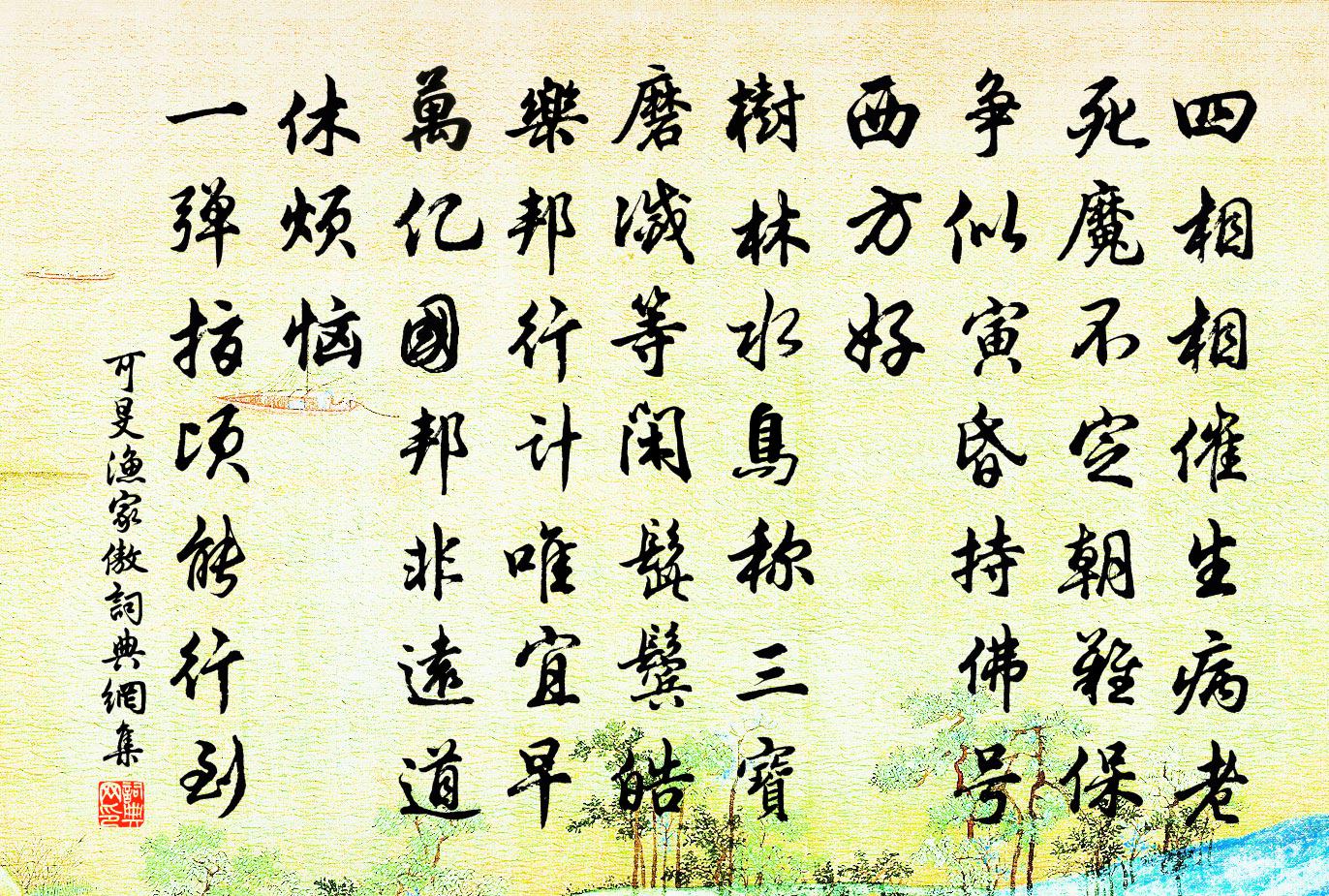 詩詞名句歷史字典書法欣賞書法字典國語詞典說文解字康熙字典古漢語字典標 題 作 者 詩 句 漁家傲作者:可旻 朝代:宋代漁家傲原文四相相催生病老。死魔不定朝難保。爭似寅昏持佛號。西方好。樹林水鳥稱三寶。磨滅等閒髭鬢皓。樂邦行計唯宜早。萬億國邦非遠道。休煩惱。一彈指頃能行到。詩詞問答問:漁家傲的作者是誰?答:可旻問:漁家傲寫於哪個朝代?答:宋代問:漁家傲是什麼體裁?答:詞可旻漁家傲書法欣賞漁家傲書法作品詩詞推薦夜中獨步庭下陸游〔宋代〕山月明如畫,江風冷借秋。衰遲亦可嘆,幽獨自成愁。斗柄垂江渚,笳聲下戌樓。我惟詩思在,從此亦宜休!東方半明韓愈〔唐代〕東方半明大星沒,獨有太白配殘月。嗟爾殘月勿相疑,同光共影須臾期。殘月暉暉,太白睒睒。雞三號,更五點。阮郎歸(西湖春暮)馬子嚴〔宋代〕清明寒食不多時。香紅漸漸稀。番騰妝束鬧蘇堤。留春春怎知。花褪雨,絮沾泥。凌波寸不移。三三兩兩叫船兒。次韻奉酬黃泰之狀元見寄喻良能〔宋代〕千佛經中第一人,明光前殿奏雄文。論心詎止稱三益,識面端能勝百聞。疇昔清談如扣玉,只今佳句欲凌雲。高情挽孫花翁徐集孫〔宋代〕清氣散乾坤,人亡名尚存。玉寒埋葛嶺,墨淡慘秦村。井菊風號冢,山花月返魂。子孫無處覓,吟客酹芳尊。卜運算元 嘆世迷王哲〔元代〕堪嘆世間人,誰肯望天覷。北斗南辰日夜移,飛走鳥和兔。恁地被煎催,尚自生貪妒。忽日*都勾你來,著甚詞因送人之圓通釋道璨〔宋代〕無數飛花舞曉風,天開二十五圓通。要知門戶從何入,問取溪邊石耳峰。毗陵辭滿出舍添倅廳楊萬里〔宋代〕小住氶廳更一旬,客魂先入故鄉春。未離鼓角聲中夢,巳是譙門外面人。論項賈似道〔宋代〕青項堆青鈿,白毛根閃青。硃砂火盆底,桃皮等類形。白腐冬瓜大,寬臊壘起星。毛丁有,入手不當輕。沛公亭傅若金〔元代〕遙山寂寂對危亭,壞礎欹沙柳自青。四海久非劉社稷,千秋猶有漢精靈。豐西水散煙沉浦,碭北雲來雨入庭。坐想暮秋閒望魏野〔宋代〕水閣閒登望,郊原欲刈禾。壞簷巢燕少,積雨病蟬多。砧隔寒溪搗,鍾隨晚吹過。扁舟何日去,江上負煙簑。寄崑山李宰覓石曾幾〔宋代〕崑山定飛來,美玉山所有。山只用功深,刓畫歲時久。崢嶸出峰巒,空洞開戶牖。幾書通置郵,一片未入手。即今題楊商卿扇范成大〔宋代〕君歸我去兩銷魂,愁滿千山鎖瘴雲。後夜短檠風雨暗,誰能相伴細論文。淳熙十六年皇后冊寶十三首佚名〔宋代〕華榱壁璫,有聲椒殿。備物來陳,多德式煥。日冊日實,是刻是互。閏舉以行,皇矣懿典。贈古泉相士黎廷瑞〔宋代〕土階章韶風日美,巢父不聽卻洗澗中水。象犀滿山珠塞淵,棄不之顧但酌嶺外泉。嗚呼千丈之渾泥數斗,一滴清泠梅花白玉蟾〔宋代〕損之又損玉精神,松竹新來漸卜鄰。月夜一枝香暗度,溪樓數點影橫陳。直須何遜為知己,始信張良似婦人。從此苑中遇雪應制沈佺期〔唐代〕北闕彤雲掩曙霞,東風吹雪舞仙家。瓊章定少千人和,銀樹長芳六出花。題桑子鋪石壁孫沖〔宋代〕峨峨溪畔石,迢迢石邊路。寄言名利徒,清閒誠足慕。大風黃庭堅〔宋代〕霜重天高日色微,顛狂紅葉上階飛。北風不惜江南客,更入破窗吹客衣。癸丑十一月下旬溫燠如春晦日忽大風作雪陸游〔宋代〕今年一冬晴日多,草木萌甲風氣和。百錢布被未議贖,老翁曝背兒行歌。吾儕小人慮不遠,積雪苦寒來豈晚?青天名句推薦世有伯樂,然後有千里馬。千里馬常有,而伯樂不常有。韓愈《雜說四·馬說》 南國有佳人,容華若桃李。曹植《雜詩·南國有佳人》 至長反短,至短反長,天之道也。呂不韋《呂氏春秋·論·似順論》 烹羊宰牛且為樂,會須一飲三百杯。李白《將進酒》 天朗氣清,惠風和暢王羲之《蘭亭集序 / 蘭亭序》 草木雖無情,因依尚可生李白《樹中草》 還作江南會,翻疑夢裡逢。戴叔倫《客夜與故人偶集 / 江鄉故人偶集客舍》 松江上,念故人老矣,甘臥閒雲。吳文英《沁園春·送翁賓暘游鄂渚》 碧毯線頭抽早稻,青羅裙帶展新蒲。白居易《春題湖上》 可憐九月初三夜,露似真珠月似弓。白居易《暮江吟》