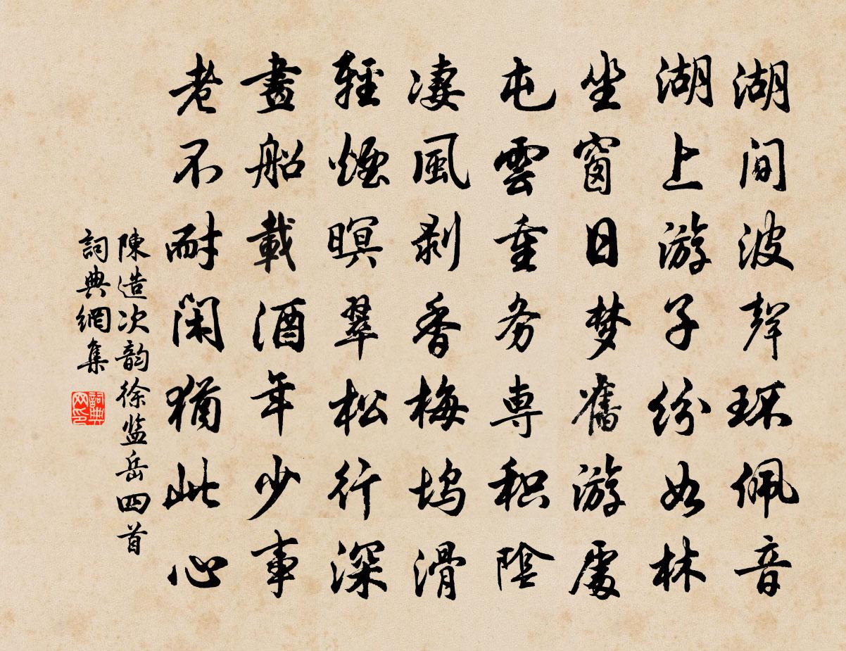 詩詞名句歷史字典書法欣賞書法字典國語詞典說文解字康熙字典古漢語字典標 題 作 者 詩 句 次韻徐監岳四首作者:陳造 朝代:宋代次韻徐監岳四首原文湖間波聲環佩音,湖上遊子紛如林。坐窗日夢舊遊處,屯雲重務專積陰。淒風剝香梅塢滑,輕煙暝翠松行深。畫船載酒年少事,老不耐閒猶此心。詩詞問答問:次韻徐監岳四首的作者是誰?答:陳造問:次韻徐監岳四首寫於哪個朝代?答:宋代陳造次韻徐監岳四首書法欣賞次韻徐監岳四首書法作品詩詞推薦過芙蓉對鏡嶺韓元吉〔宋代〕世事日千變,勞生憂患多。誰知度炎熟,正爾陟嵯峨。峰矗蓮初綻,崖枯鏡未磨。江東茲絕險,嘆我兩經過。漂母冢羅隱〔唐代〕寂寂荒墳一水濱,蘆洲絕島自相親。青娥已落淮邊月,白骨甘為泉下塵。原上荻花飄素髮,道傍菰葉碎羅巾。雖然對雨獨酌韋莊〔唐代〕榴花新釀綠於苔,對雨閒傾滿滿杯。荷鍤醉翁真達者,臥雲逋客竟悠哉。能詩豈是經時策,愛酒原非命世才。門外和鄭樞山竹夫人韻黃庚〔宋代〕玉環傾國起胡兵,有色終污後世名,九夏專房何在貌,一身空洞若為情。寵名本自無心得,婦節從來澈骨清。愁見句吳沆〔宋代〕已經平子宜地憾,未見夷吾得不憂。臨江仙(登泗州嶺·九之一)鄧肅〔宋代〕帶雨梨花看上馬,問人底事匆匆。于飛有願恨難從。大鵬摶九萬,鸚鵡鎖金籠。忽忽便為千里隔,危岑已接高穹。頌古一百二十一首釋宗杲〔宋代〕猛焰不容蚊蚋泊,大海那能宿死屍。任是三頭並六臂,望風無不豎降旗。木蘭花慢·拆桐花爛熳柳永〔宋代〕拆桐花爛熳,乍疏雨、洗清明。正艷杏燒林,緗桃繡野,芳景如屏。傾城,盡尋勝去,驟雕鞍紺幰出郊坰。風暖繁導引佚名〔宋代〕九虞初畢,黼座掩瑤觴。羽衛盛煌煌。數聲清蹕來天上,想像赭袍光。新成清廟勗雲堂。孝饗奉蒸嘗。子孫千載承紫瑞香三首陳藻〔宋代〕無數枝頭簇簇葩,大枝直上細枝斜。商量開盡商量落,全要前花見後花。和樂天誚失婢榜者劉禹錫〔唐代〕把鏡朝猶在,添香夜不歸。鴛鴦拂瓦去,鸚鵡透籠飛。不逐張公子,即隨劉武威。新知正相樂,從此脫青衣。晨起陸游〔宋代〕倦枕廉纖雨,幽窗料峭寒。溪柴旋篝火,野蔌斗登盤。年老衣冠古,身閒宇宙寬。兒孫生我笑,趨揖已儒酸。東門行佚名〔兩漢〕出東門,不顧歸;來入門,悵欲悲。盎中無斗米儲,還視架上無懸衣。拔劍東門去,舍中兒母牽衣啼。“他家但願頌證道歌證道歌釋印肅〔宋代〕三乘五性皆醒悟,方知自有珍珠庫。臨時分付與兒孫,不勞更倚他門戶。登郭隗台皇甫松〔唐代〕燕相謀在茲,積金黃巍巍。上者欲何顏,使我千載悲。北京留守王太師輓歌詞二首司馬光〔宋代〕盧肇時推重,終軍眾共賢。如可奪標日,未及棄繻年。官曆清塗遍,名居美事先。人間有五福,視履豈非全。久滯越中貽謝南池會稽賀少府孟浩然〔唐代〕陳平無產業,尼父倦東西。負郭昔雲翳,問津今已迷。未能忘魏闕,空此滯秦稽。兩見夏雲起,再聞春鳥啼。懷仙法立上人釋祖欽〔宋代〕萬法無根,人何而立。一念心堅,銀山鐵壁。發大誓願,大解脫幢。萬木生秋風自涼,庭前一陣桂花香。朝雞王樂道司馬光〔宋代〕小雞距短雙翅垂,廣場勇門無所施。清曉長鳴獨先眾,朝者恃此能知時。星河滿天月光白,東望扶桑悄無色。一聲題五龍廟蕭注〔宋代〕五龍兄弟古英名,今日拿舟過悅城。莫向草茅久盤屈,早施霖雨活蒼生。名句推薦愛親者,不敢惡於人;敬親者,不敢慢於人。孔子及其弟子《孝經·天子》 萬馬不嘶,一聲寒角,令行柳營。劉過《沁園春·張路分秋閱》 庭前雪壓松桂叢,廊下點點懸紗籠。劉禹錫《更衣曲》 故人何在,煙水茫茫。柳永《玉蝴蝶·望處雨收雲斷》 剪不斷,理還亂,是離愁。別是一般滋味在心頭。李煜《相見歡·無言獨上西樓》 亭皋木葉下。隴首秋雲飛。柳惲《搗衣詩》 學不精勤,不如不學 。令狐德棻《周書·列傳·卷二十五》 知君慣度祁連城,豈能愁見輪台月。岑參《送李副使赴磧西官軍》 觸簾風送景陽鍾,鴛被繡花重。顧敻《虞美人·觸簾風送景陽鍾》 令之有漸,軌之有度,寵之有節房玄齡《晉書·列傳·第六十二章》