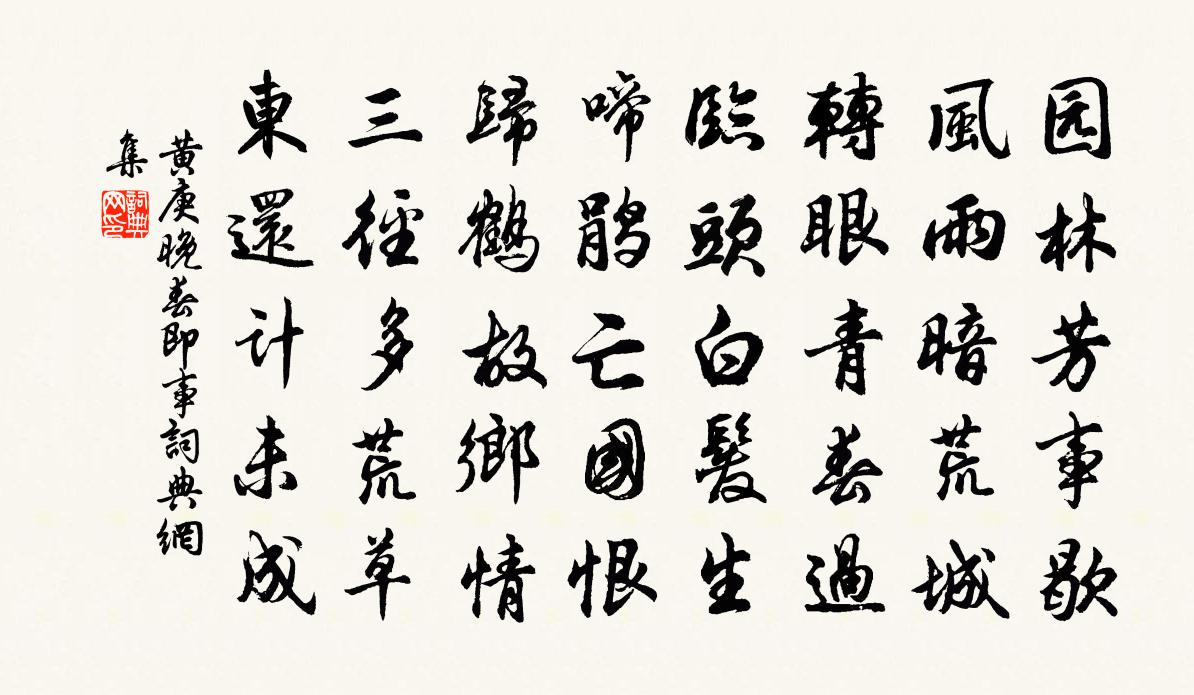 詩詞名句歷史字典書法欣賞書法字典國語詞典說文解字康熙字典古漢語字典標 題 作 者 詩 句 晚春即事作者:黃庚 朝代:宋代晚春即事原文園林芳事歇,風雨暗荒城。轉眼青春過,臨頭白髮生。啼鵑亡國恨,歸鶴故鄉情。三徑多荒草,東還計未成。詩詞問答問:晚春即事的作者是誰?答:黃庚問:晚春即事寫於哪個朝代?答:宋代黃庚晚春即事書法欣賞晚春即事書法作品詩詞推薦病癒簡劉小村文天祥〔宋代〕秋光沁人骨,意氣曉來新。古鼎龍團雪,虛檐麈尾春。商山弈棋老,赤壁洞簫賓。風月真倉扁,招呼入屋頻。田舍即事十首劉克莊〔宋代〕古來觀社見春秋,茜袂銀釵盡出遊。欲與魯人同獵較,可憐身世尚它州。冬夜獨坐羅公升〔宋代〕庭幽蟄談口,燭盡輟書卷。牆外醉客喧,堪憎更堪羨。送梅臞三山胡仲弓〔宋代〕曾共梅花約,論心到歲寒。如何傾別酒,獨自上吟鞍。藥裹留余劉,詩囊有近刊。懷人眇雲際,頻展墨龍看。小池釋行海〔宋代〕白綿飛盡綠絲深,無數魚兒聚藻陰。日夜潺湲聲不斷,分明一片伯牙心。恭和御製賜牟子才韻宋度宗〔宋代〕視草詞臣地位高,玉堂深夜許焚膏。文華瑞世呈儀鳳,顧問承恩直禁鼇。喜有奇才追宋軾,光膺聖制勝唐綯。重修池鶴八絕句。鶴答鳶白居易〔唐代〕無妨自是莫相非,清濁高低各有歸。鸞鶴群中彩雲里,幾時曾見喘鳶飛?楓橋寺小憩程公許〔宋代〕寂歷少林壁,酸寒飯顆山。相逢如有舊,示我亦無還。延慶院黃軫〔宋代〕寮剎標奇處,煙蘿鄉亂流。地靈僧得住,好山客多游。燈影連金像,鐘聲散石樓。風雷等間作,咫尺是龍湫。答雲甫程文許月卿六〔宋代〕風將楊柳綠鋪地,月畫蒲萄架在池。卻扇清風嫩涼夜,攜筇明月共歸時。晴歸陳著〔宋代〕兒造弄晴曦,安排老我歸。江收閒水退,山戴斷雲飛。晚色明官路,清寒攪客衣。行行到嵩曲,猶可及斜暉。江行夜泊李中〔唐代〕扁舟倦行役,寂寂宿江乾。半夜風雷過,一天星斗寒。潮平沙觜沒,霜苦雁聲殘。漁父何疏逸,扣舷歌未闌。乙亥冬彭秋宇〔宋代〕禍亂方來苦不禁,此生誰料有如今。四郊雲擾旌旗影,諸閫風寒社稷心。杞國有人憂凜凜,桃源無路入深深。少陵題令宣和尚院貫休〔唐代〕軒窗領嵐翠,師得世情忘。惟愛談諸祖,曾經宿大荒。泉聲淹臥榻,雲片犯爐香。寄語題門者,看經在上方。句汪韶〔宋代〕十 * 常如意少,百千億任化身多。晦日重宴高氏林亭陳子昂〔唐代〕公子好追隨。愛客不知疲。象筵開玉饌。翠羽飾金卮。此時高宴所。詎滅習家池。循涯倦短翮。何處( 一作以 送復夢赴韋令幕元稹〔唐代〕世上於今重檢身,吾徒耽酒作狂人。西曹舊事多持法,慎莫吐他丞相茵。汴河范成大〔宋代〕指顧枯河五十年,龍舟早晚定疏川?還京卻要東南運,酸棗棠梨莫蓊然。東門之墠佚名〔先秦〕東門之墠,茹藘在阪。其室則邇,其人甚遠。東門之栗,有踐家室。豈不爾思?子不我即!正月二十日上山莊二月晦日歸不見花馮時行〔宋代〕山巑屼,立屏幛。山上無花不見春,下山花落空惆悵。嫣香空後芳草萌,芳草萋萋愁更生。子規啼血不見花,春又名句推薦醉不成歡慘將別,別時茫茫江浸月。白居易《琵琶行 / 琵琶引》 美人卷珠簾,深坐顰蛾眉。李白《怨情》 水色淥且明,令人思鏡湖。李白《登單父陶少府半月台》 高樓送客不能醉,寂寂寒江明月心。王昌齡《芙蓉樓送辛漸二首》 寒眼亂空闊,客意不勝秋。楊炎正《水調歌頭·登多景樓》 拋家傍路,思量卻是,無情有思。蘇軾《水龍吟·次韻章質夫楊花詞》 節用儲蓄,以備凶災范曄《後漢書·本紀·肅宗孝章帝紀》 君歌楊叛兒,妾勸新豐酒。李白《楊叛兒》 仁義禮善之於人也,辟之若貨財粟米之於家也。荀子《荀子·大略》 天山雪雲常不開,千峰萬嶺雪崔嵬。岑參《天山雪歌送蕭治歸京》