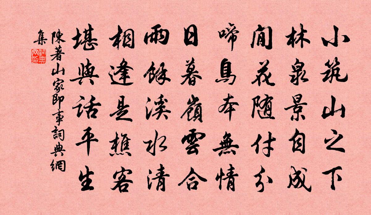 詩詞名句歷史字典書法欣賞書法字典國語詞典說文解字康熙字典古漢語字典標 題 作 者 詩 句 山家即事作者:陳著 朝代:宋代山家即事原文小築山之下,林泉景自成。閒花隨付分,啼鳥本無情。日暮嶺雲合,雨余溪水清。相逢是樵客,堪與話平生。詩詞問答問:山家即事的作者是誰?答:陳著問:山家即事寫於哪個朝代?答:宋代陳著山家即事書法欣賞山家即事書法作品詩詞推薦貧歌陸游〔宋代〕壽居福之首,貧為士之常。造物賦我貧,乃以壽見償。處常而受福,每恐不得當。掬澗以沃渴,屑柏以為糧;雖雲明堂大禮慶成詩程無鳳〔宋代〕森嚴羽衛擁和鑾,咫尺龍顏侍至尊。禋祀儀文勤聖問,敬天實意進芻言。百神受職來鴻祉,多士承休肅駿奔。右饗頌古四十五首釋如珙〔宋代〕斬蛇卻非小小事,直是教他脫苦輪。座主高茅心未泯,如何胡亂妄通言。菩薩蠻(次圭父回文韻)朱熹〔宋代〕暮江寒碧縈長路。路長縈碧寒江暮。花塢夕陽斜。斜陽夕塢花。客愁無勝集。集勝無愁客。醒似醉多情。情多醉似劉公實母夫人董氏輓詩蔡戡〔宋代〕杏圃仙遊遠,桃源往事虧。名高孝婦傳,詞掞外孫碑。孟鼎方知貴,萊衣不復嬉。生男有如此,天道豈無知。峴潭(山)作孟浩然〔唐代〕石潭傍隈隩,沙榜曉夤緣。試垂竹竿釣,果得查頭鯿。美人騁金錯,縴手膾紅鮮。因謝陸內史,蓴羹何足傳。挽致政朱司戶二首王邁〔宋代〕枕上功名淚不乾,鏡中勳業老猶看。起家喜有千金子,入手纏沾九品官。袞袞天朝來晚賁,匆匆人事異悲歡。最憐緣識宋太宗〔宋代〕朱明日盛殘花卉,瓊苑爭游諠帝里。寶馬香車去復來,幾許人心歡不已,金明水上浮仙島,畫舸龍舟非草草。世寧漁家傲(初創真意亭於南溪,游陟晚歸作)葛勝仲〔宋代〕岩壑縈迴雲水窟。林深路斷 * 客。茅屋數椽攜杖舄。人寂寂。侵檐萬個琅玕碧。倦客羈懷清似滌。更無一點飛埃新開墳路梅堯臣〔宋代〕古徑約城斜,鋤荒可過車。直穿深筱去,不比繞村賒。伐樹侵籬腳,裨塍掘澗沙。欲為蘭若處,松柏屬吾家。和送春四首廖行之〔宋代〕瀟湘江上送春歸,酒榼何人共我攜。不是吾儂怨春別,明朝車馬各東西。寄獻僕射相公王禹偁〔宋代〕聖君宵旱念生民,重命甘盤秉國鈞。引馬但傳三刻漏,喘牛休問四時春。羹和舊鼎黃金鉉,雪壓新堤白玉塵。應念寄朱拾遺齊己〔唐代〕一聞歸闕下,幾番熟金桃。滄海期仍晚,清資路漸高。研冰濡諫筆,賦雪擁朝袍。豈念空林下,冥心坐石勞。伍主簿輓詞樓鑰〔宋代〕由來風誼獨穹然,坐享家肥不計年。墮幘何妨各百萬,指囷寧復問三千。靈椿老去仁宜壽,玉樹種成身已仙。袞袞陳情獻江西李常侍五首許棠〔唐代〕二十二三年,游秦復滯燕。徒陪群彥後,自苦此生前。徑折啼猿樹,岩荒噴月泉。東堂曾受薦,垂白志猶堅。淅淅鷓鴣天佚名〔宋代〕落花凝恨夕陽中。悲廢井詩范雲〔南北朝〕因舊未嘗改。緣甘故先竭。歷稔久無禽。一朝見開渫。泌泉既斯涌。短綆鏘安設。已獲丁氏利。方見管公紲。朝中措(和趙黎州□□陪李參政壁游醴泉西園)魏了翁〔宋代〕沙堤除道火成城。換得午橋清。寒色般添酒令,野芳抵當鉶羹。松馨花氣,岸容山意,浦思溪情。誰記一時勝引,嘉定六年皇后閣春貼子詞五首真德秀〔宋代〕不梭織就袞龍衣,已奉君王泰疇祠。準擬腰輿臨繭館,清明前後浴蠶時。紅莧史繩祖〔宋代〕易稱紅莧美柔英,夬決窮陰日旅辰。不以色紅為貴尚,何因赤莧有仙人。名句推薦芳草無情,更在斜陽外范仲淹《蘇幕遮·懷舊》 窮冬烈風,大雪深數尺,足膚皸裂而不知。宋濂《送東陽馬生序》 已知泉路近,欲別故鄉難。夏完淳《別雲間》 舉頭紅日白雲低,四海五湖皆一望。唐寅《伯虎扮乞兒,作詩騙酒》 斜倚畫闌嬌不語,暗移梅影過紅橋,裙帶北風飄。納蘭性德《望江南·詠弦月》 過五關,斬六將馮夢龍《喻世明言·卷三十一》 人而無信,不知其可也。孔子弟子《論語·為政篇》 樂者,所以道樂也,金石絲竹,所以道德也;樂行而民鄉方矣。荀子《荀子·樂論》 枝枝相覆蓋,葉葉相交通。佚名《孔雀東南飛 / 古詩為焦仲卿妻作》 兩人對酌山花開,一杯一杯復一杯。李白《山中與幽人對酌》