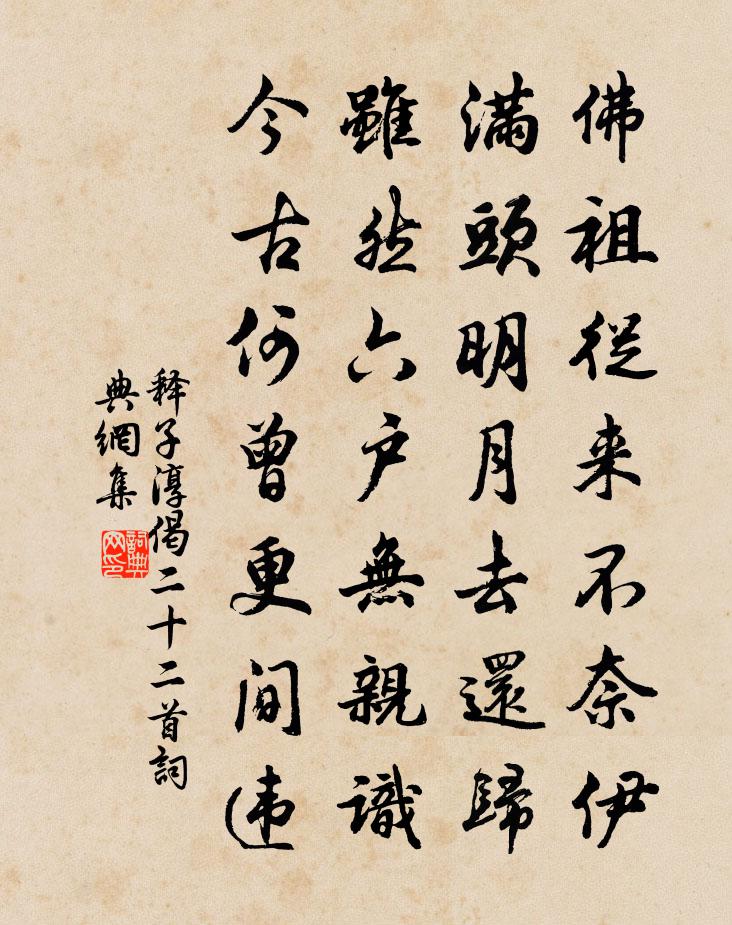 詩詞名句歷史字典書法欣賞書法字典國語詞典說文解字康熙字典古漢語字典標 題 作 者 詩 句 偈二十二首作者:釋子淳 朝代:宋代偈二十二首原文佛祖從來不奈伊,滿頭明月去還歸。雖然六戶無親識,今古何曾更間違。詩詞問答問:偈二十二首的作者是誰?答:釋子淳問:偈二十二首寫於哪個朝代?答:宋代釋子淳偈二十二首書法欣賞偈二十二首書法作品詩詞推薦題研六言四首劉克莊〔宋代〕其面固已晬然,其背貴不可言。寧捧以供李白,勿舉以擲鄭畋。春夢黃庚〔宋代〕銅匜艾納翠氤氳,六六屏山酒半醒。夢入中州看秦畫,春風吹亂玉梨雲。賀仲雨斗門陳藻〔宋代〕濯錦江邊唱絕強,孤青和者亦夔襄。歷年雖久地相遠,在寢豈止升渠堂。縱能帖石防頹岸,隨寓幽居供賞玩。何發青玉案沈端節〔宋代〕使君標韻如徐庾。更名節、高千古。臥治姑溪才小駐。閒雲無定,陽春有腳,又作南昌去。興來亭上清歌度。盡能丙子歲三月十有二日游嵩山宿峻極中院時天氣李廌〔宋代〕舍鞅陟層巘,老步獨多嘆。笑談谷傳響,松聲遞蕭散。欲尋草堂池,土室無僧贊。詩陳琳〔魏晉〕仲尼以聖德。行聘徧周流。遭斥厄陳蔡。歸之命也夫。荔枝堂夕眺三首楊萬里〔宋代〕病骨秋臞怯暮清,涼風偷帶北風輕。迎寒窗隔重糊遍,只放書邊數眼明。下第再過崔邵池陽居馬戴〔唐代〕豈無故鄉路,路遠未成歸。關內相知少,海邊來信稀。離雲空石穴,芳草偃郊扉。謝子一留宿,此心聊息機。冬晴行園中陸游〔宋代〕桔槔灌蔬固已非,竹筧澆花宜見譏。杏繁梅瘦種性別,一氣生殺均天機。細推物理孰不爾,摶風未可嘲卑飛。君其頌古四十四首釋師範〔宋代〕兀兀地思量,無可得思量。無可思量處,直個好思量。大庾嶺頭逢六祖,鰲山店上見曾郎。袷享八首真宗〔宋代〕於赫皇祖,濬發其祥。德盛流遠,奕世彌昌。孝孫有慶,嘉下令芳。神保是享,錫義無疆。西江月(丁巳長沙大閱)趙師俠〔宋代〕笳鼓旌旗改色,弓刀鎧甲增明。攢花簇隊馬蹄輕。稟聽元戎號令。羊祐輕裘臨陣,亞夫細柳屯營。觀瞻已聳定王城次韻陳明錫見寄林季仲〔宋代〕一別從京洛,相逢向海邦。倦遊憐舌在,多病覺眉龐。佳處隨山屐,餘生付酒缸。新詩眩老眼,細讀傍寒窗。逍遙詠宋太宗〔宋代〕乾坤常運轉,兀兀見從生。利物終相應,施為願要精。身慵何隱遁,舌辯謾縱橫。種性歸真理,因緣有重輕。寄楊贊圖學士學士與元昆俱以龍腦登選黃滔〔唐代〕東堂第一領春風,時怪關西小驥慵。華表柱頭還有鶴,華歆名下別無龍。君恩鳳閣含毫數,詩景珠宮列肆供。今日同韋舍人元旦早朝徐彥伯〔唐代〕夕轉清壺漏,晨驚長樂鍾。逶迤綸禁客,假寐守銅龍。予亦趨三殿,肩隨謁九重。繁珂接曙響,華劍比春容。相問偈頌一百五十首釋心月〔宋代〕藥山休去,直得三十二相八十種好,一時現前。然雖如是,也好與一杓。寄題趙尉若鈺蘭所六言四首劉克莊〔宋代〕屈子平章荃蕙,荀卿區別芷槐。志潔真飲露者,性惡似漸滫來。湖中別鑒上人宋之問〔唐代〕願與道林近,在意逍遙篇。自有靈佳寺,何用沃洲禪。送林荊州歸蓬萊釋紹曇〔宋代〕蓬萊山翁抱仙骨,穩跨長鯨游八極。玉壺深貯海山雲,十載窮幽歸未得。年業骨蛻壺倒空,長鯨又化為蒼龍。了無名句推薦非臣不亂,非臣不平。李大師、李延壽《南史·列傳·卷十八》 對酒當歌,人生幾何!曹操《短歌行》 東風隨春歸,發我枝上花。李白《落日憶山中》 琴里知聞唯淥水,茶中故舊是蒙山。白居易《琴茶》 兩岸桃花烘日出,四圍高柳到天垂。姜彧《浣溪沙·山滴嵐光水拍堤》 鴻雁向西北,因書報天涯。李白《千里思》 莫唱當年長恨歌,人間亦自有銀河。袁枚《馬嵬》 黃鶯也愛新涼好,飛過青山影里啼。徐璣《新涼》 非學無以廣才,非志無以成學。諸葛亮《誡子書》 柏府樓台銜倒影,茅茨松竹瀉寒聲。王守仁《次韻陸僉憲元日春晴》