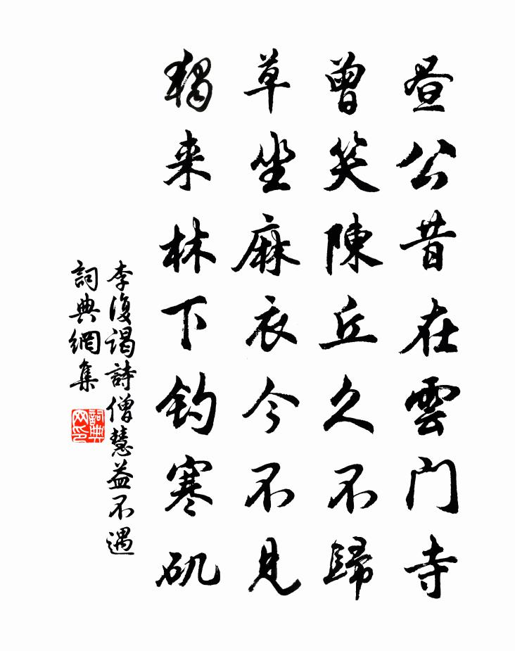 詩詞名句歷史字典書法欣賞書法字典國語詞典說文解字康熙字典古漢語字典標 題 作 者 詩 句 謁詩僧慧益不遇作者:李復 朝代:宋代謁詩僧慧益不遇原文晝公昔在雲門寺,曾笑陳丘久不歸。草坐麻1/1衣今不見,獨來林下釣寒磯。詩詞問答問:謁詩僧慧益不遇的作者是誰?答:李復問:謁詩僧慧益不遇寫於哪個朝代?答:宋代李復謁詩僧慧益不遇書法欣賞謁詩僧慧益不遇書法作品詩詞推薦對酒陸游〔宋代〕古今共有死,長短無百年;方其欲瞑時,如困得熟眠。世以生時心,妄度死者情,疑其不忍去,一笑可絕纓。區區春帖子詞夫人閣十首宋祁〔宋代〕春闕風光麗,春城歌吹喧。瓊蘇獻春酒,金薄鏤春旛。馬重績占隨卦繇辭佚名〔唐代〕南瞻析木,木不自續。虛而動之,動隨其覆。水龍吟(老人壽詞)侯置〔宋代〕夜來霜拂簾旌,淡雲麗日開清曉。香猊金暖,冰壺玉嫩,佳辰寒早。橘綠橙黃,袖紅裙翠,一堂歡笑。正梅妃月姊秋夜陸游〔宋代〕夜雨淒涼客思迷,聞碪卻是夢回時。人人解說悲秋事,不似詩人徹底知。寄立齋二首戴良齊〔宋代〕玄雲太山阿,倏忽起天際。悠哉復何心,適與飄風會。雲間翔虬螭,蜿蟺炫五彩。萬生方顒顒,豈但千里內。吾鄉建隆郊祀八首竇儼〔宋代〕嘉玉制幣,以通神明。神不享物,享於克誠。交廉布書事三首呈郎中機宜詩韻吳說〔宋代〕棲遁雲岩下,無人到此邊。階庭穿蚓穴,窗戶蠹蝸涎。寂寞春將老,淹留月再弦。羈愁知幾許,素髮挽華巔。紹興以後時享二十五首真宗〔宋代〕於後時宋,自天保定。高宗受之,再仆景命。紹開中興,翼善傅聖。何千萬年,永綏厥慶。有懷二首趙蕃〔宋代〕桑落黃而隕,于飛雁翱翔。豈無同心人,滯彼天一方。劉氏賢父子,好古俱志強。向來文墨盟,許我由升堂。三孫呈竹石亭陳著〔宋代〕說道疏時元是密,偶於忙處得尋閒。宿愁復嶺重山外,新趣清風明月閒。和陳和卿四絕姚勉〔宋代〕空齋長夏永和年,鶯囀林陰鷺水田。只好更尋棋一局,莫孤花影午時天。甲寅春之海山雨後訪王淵明知縣釋正覺〔宋代〕誰問春泥沒履牙,蘿門窈窕綠差斜。幽芳松菊淵明徑,深秀溪山摩詰家。默照佛燈寒不掉,對緣心鑒淨無瑕。仍聞簡德允蘇泂〔宋代〕言歸四十日,兩度得尋君。貧病有諸子,情懷無半分。梅花年後雪,雁翅屋東雲。早晚扁舟興,能來與細論。大江東去 壽高伯川王旭〔元代〕月臨南呂,正庭階、開到堯*三葉。風露清明鍾氣質,誕作人間豪傑。器宇宏深,襟靈闊遠,物我俱融徹。滔滔欲夜興鄧深〔宋代〕官舍渾如僧舍幽,爐香靜坐興悠悠。一窗燈火鳴蛩夜,千里湖山落雁秋。只恐有詩成筆下,自餘無事到心頭。何妨次韻汪以南閒居漫吟十首方回〔宋代〕采芑采于田,采芹采於水。豈弟君子心,作人豈異此。神農昔嘗藥,志在起人死。百聖一樂育,亦如嘗藥然。醫國歐陽文忠公夫人輓詞二首蘇轍〔宋代〕先生才蓋世,家事少經心。流落初相偶,委虵志益深。功名入圖史,文字刻繆琳。有助知由內,騶虞欲重吟。好禮梅花李流謙〔宋代〕昨夜臨溪一樹開,人言應與雁俱回。霜葩只在寒梢上,卻是春風自去來。子聰惠書備言行路及游王屋物趣因以答梅堯臣〔宋代〕自我河橋來,清話殊未已。亟言閱通疇,晨駕遂遵彼。尺書忽見遺,經由皆可紀。草草始辭家,匆匆渡河水。前村名句推薦白馬金羈遼海東,羅帷繡被臥春風。李白《春怨》 飛光飛光,勸爾一杯酒。李賀《苦晝短》 外舉不避仇,內舉不避子。韓非及後人《韓非子·外儲說左下》 祖宗疆土,當以死守,不可以尺寸與人。脫脫《宋史·列傳·卷一百一十七》 白髮書生神州淚,盡淒涼、不向牛山滴劉克莊《賀新郎·九日》 腸已斷,淚難收。相思重上小紅樓。辛棄疾《鷓鴣天·晚日寒鴉一片愁》 大廈將顛,非一木所支也。王通《中說·卷三·事君篇》 被冷香消新夢覺,不許愁人不起李清照《念奴嬌·春情》 金河秋半虜弦開,雲外驚飛四散哀。杜牧《早雁》 上有所欲,其神若親,禮下勿辭,拒者無助矣。來俊臣《羅織經·治下卷第三》