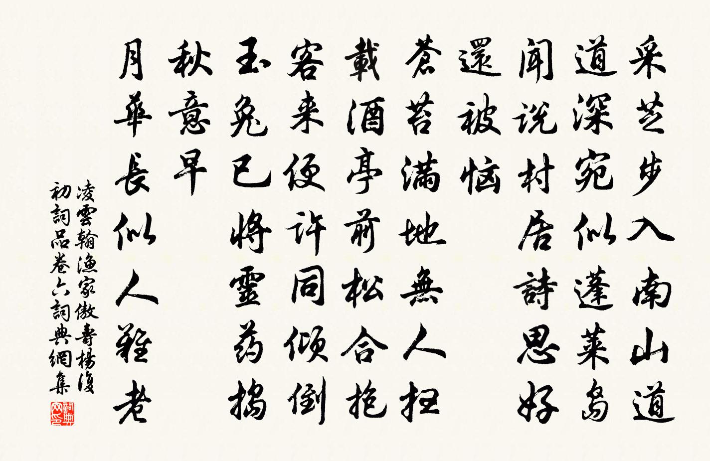 詩詞名句歷史字典書法欣賞書法字典國語詞典說文解字康熙字典古漢語字典標 題 作 者 詩 句 漁家傲 壽楊復初 詞品卷六作者:凌雲翰 朝代:元代原文采芝步入南山道。道深宛似蓬萊島。聞說村居詩思好。還被惱。蒼苔滿地無人掃。載酒亭前松合抱。客來便許同傾倒。玉兔已將靈藥搗。秋意早。月華長似人難老。詩詞問答問:《漁家傲 壽楊復初 詞品卷六》的作者是誰?答:凌雲翰問:該詩寫於哪個朝代?答:元代問:該詩是什麼體裁?答:詞書法欣賞漁家傲 壽楊復初 詞品卷六書法作品詩詞推薦蓬島山劉倓〔宋代〕軋軋筍輿過翠微,路經蓬島鎖雲霏。雨從半嶺岩窩出,雲在行人腳下飛。浣溪沙(夜飲仲明小軒)韓淲〔宋代〕一曲青山映小池。林疏人靜月明時。相逢杯酒也相宜。醉眼不知春事少,歡情猶得漏聲遲。神仙何處夢魂飛。句馮去辯〔宋代〕琴心自娛誰料理,犢鼻雖貧未主臣。訪吳安撫竹洲汪莘〔宋代〕憶昔見公十載前,知公即日圖凌煙。而今見公十載後,豈意翻為竹洲叟。黃金照白天門開,夜叉安得生風雷。龍文登開元寺樓送崔少府還平望驛皎然〔唐代〕登望思慮積,長亭樹連連。悠揚下樓日,杳映傍帆煙。入夜四郊靜,南湖月待船。崇仙觀吳鎰〔宋代〕人生塵土不可耐,天上高寒定自嘉。但約 * 擘麟脯,莫尋句漏問丹砂。題壁二首胡叔陽子〔宋代〕知君色慾未能除,好把精神契太初。從今發誓休貪慾,我保教君入太虛。貧女詞寄從叔先輩簡孟郊〔唐代〕蠶女非不勤,今年獨無春。二月冰雪深,死盡萬木身。時令自逆行,造化豈不仁。仰企碧霞仙,高控滄海雲。永別入朝感舊宋庠〔宋代〕二紀便番冒主恩,歸來榮感兩驚魂。昌辰盡見群龍出,急景俱隨駭駟奔。史冊褒賢空汗竹,山丘餘泣已陳根。此身倦尋芳慢·露晞向晚王雱〔宋代〕露晞向晚,簾幕風輕,小院閒晝。翠逕鶯來,驚下亂紅鋪繡。倚危牆,登高榭,海棠經雨胭脂透。算韶華,又因循夜行船趙軏〔宋代〕今夜陰雲初霽。畫簾外、月華如水。露靄晴空,風吹高樹,滿院中秋意。皎皎蟾光當此際。怎奈何、不成況味。莫題海智寺壁釋紹嵩〔宋代〕步步入山門,門前眾水分。上潮吞海日,古廟聚寒雲。樹影中流見,秋濤隔嶺聞。還應覓新句,不琢自成文。送王季德提刑寶文少卿楊萬里〔宋代〕寶儲依舊接英游,璗節何曾遠藻旒。卿月使星銀漢曉,繡衣彩服太湖秋。豺當道上狐何問,鷹擊霜前免已愁。火急趙元信近來得小鬟歌曲便須熟寐此還是有所得鄭剛中〔宋代〕清歌聲里便高眠,古老詩中借一聯。猿抱子歸青嶂里,鳥啼花落碧岩前。和集賢劉學士早朝作白居易〔唐代〕吟君昨日早朝詩,金御爐前喚仗時。煙吐白龍頭宛轉,扇開青雉尾參差。暫留春殿多稱屈,合入綸闈即可知。從此予往來秦熙汧隴間不啻十數年時聞下里之歌遠李復〔宋代〕牛車欲住更催行,官要刻日到新城。軍有嚴期各努力,秋田無種何須耕。攤破浣溪沙·手卷真珠李璟〔唐代〕手卷真珠上玉鉤,依前春恨鎖重樓。風裡落花誰是主,思悠悠。青鳥不傳雲外信,丁香空結雨中愁。回首綠波三楚橫林望見惠山,寄懷尤延之三首楊萬里〔宋代〕平生玉樹伴蒹遐,晚歲春蘭隔菊花。咫尺遂初堂下水,寄詩猶自怨人遐。思蜀陸游〔宋代〕西遊陳跡浩無窮,回首真同一夢中。柳拂驛牆思鳳集,鼓喧市里憶蠶叢。故人丘隴秋蕪碧,舊隱園林夕照紅。自閔到西山懷趙景文似諸孤陳著〔宋代〕山屋著孤嫠,採薇人更誰。寒鐙長夜影,春帖去年詩。後死只多感,獨來能幾時。願言相勸學,西席佇賢師。名句推薦明朝寒食了,又是一年春。顧太清《臨江仙·清明前一日種海棠》 有誰知我此時情,枕前淚共階前雨,隔個窗兒滴到明。聶勝瓊《鷓鴣天·別情》 玉璫緘札何由達,萬里雲羅一雁飛。李商隱《春雨》 隱約遙峰,和淚謝娘眉嫵。史達祖《綺羅香·詠春雨》 久在樊籠里,復得返自然。陶淵明《歸園田居·其一》 精誠由中,故其文語感動人深。王充《論衡·卷十三·超奇篇》 掩妾淚,聽君歌。李白《夜坐吟》 丹楓萬葉碧雲邊,黃花千點幽岩下。張掄《踏莎行·秋入雲山》 靜夜沉沉,浮光靄靄,冷浸溶溶月。丘處機《無俗念·靈虛宮梨花詞》 羅襟濕未乾,又是淒涼雪。張淑芳《滿路花·冬》