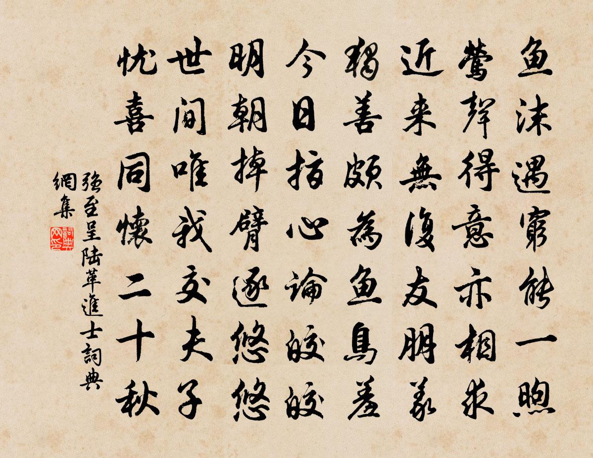 詩詞名句歷史字典書法欣賞書法字典國語詞典說文解字康熙字典古漢語字典標 題 作 者 詩 句 呈陸革進士作者:強至 朝代:宋代呈陸革進士原文魚沫遇窮能一煦,鶯聲得意亦相求。近來無復友朋義,獨善頗為魚鳥羞。今日指心論皎皎,明朝掉臂逐悠悠。世間唯我交夫子,憂喜同懷二十秋。詩詞問答問:呈陸革進士的作者是誰?答:強至問:呈陸革進士寫於哪個朝代?答:宋代強至呈陸革進士書法欣賞呈陸革進士書法作品詩詞推薦聞鶴嘆白玉蟾〔宋代〕霜翎雪羽臙脂頂,玄裳翠距白玉頸。何年乘風下太清,芝田煙暝瑤池冷。天台山上玉京天,何似青天玉帝前。曉雲次韻劉元煇喜予還家攜酒見訪三首方回〔宋代〕死者已無知,生者暫為客。三年歸故廬,松竹元自碧。屢驚山中人,永臥泉下夕。一二老朋友,何處卜兆宅。獨君除草李新〔宋代〕綠茵春葄暖無加,醉眼蒙茸纈萬花。聞道芟夷殊不惡,直須著意認蘭芽。句柴宗慶〔宋代〕曾觀大海難為水,除去梁園總是村。朝日梅堯臣〔宋代〕日色才出海,曉月無光彩。曉月在青空,不與日色同。誠知大君德,照耀無不通。詠梅周南〔宋代〕此君一日不可欠,獨爾梅花動隔年。更有晦冥風雨在,可能相見不依然。雙檜分題金君卿〔宋代〕名藍壓城闉,嶻岌聳雙檜。得地不孤立,陵風自相對。根盤乖龍獰,葉剪蒼壁碎。交柯紐頑銅,疊影森翠蓋。勁無呂司空輓詞三首蘇轍〔宋代〕將相家聲近,勛名晚歲隆。給扶安舊德,賜府壓群公。不見彌縫跡,空推翼戴功。山公舊多可,寒士泣清風。寄黃溪雲趙希桐〔宋代〕十年成遠別,幾度上高樓。風遞江南信,雲消渭北愁。春心驚海燕,曉夢入溪鷗。何日西窗燭,相看說舊遊。禪人並化主寫真求贊釋正覺〔宋代〕功轉密藏,尋蹤跡以無方。影現益彰,歷因緣而有常。身分塵剎普,舌拄梵天長。心心不觸菩提用,法法無依般若與道源游西莊遇齊道人同往草堂為齊書此此蘇軾〔宋代〕桑麻已零落,藻荇復銷沉。園宅在人境,歲時傷我心。強穿南埭路,遙望北山岑。欲與道人語,跨鞍聊一尋。一翦梅謝應芳〔元代〕東風吹醒老梅枝。南也芳菲。北也芳菲。月明半夜五更時。笛也爭吹。角也爭吹。青松澗底獨離奇。寒也誰知。暖水龍吟 落葉王沂孫〔宋代〕曉霜初著青林,望中故國淒涼早。蕭蕭漸積,紛紛猶墜,門荒徑悄。渭水風生,洞庭波起,幾番秋杪。想重崖半沒又平律一首梅堯臣〔宋代〕漢家天下將,廟古像公圭。百戰自忘楚,一時空王齊。鄉人奏簫鼓,舟子賽豚雞。不改寒潮水,朝平暮復低。和姜總管喜民間種麥虞儔〔宋代〕腰鐮刈晚禾,荷鋤種新麥。田家競作苦,羔豚勞歲夕。翠浪愜初懷,黃雲期後穫。晴暖得天時,肥瘠隨地力。賸欲西江月·題溧陽三塔寺張孝祥〔宋代〕問訊湖邊春色,重來又是三年。東風吹我過湖船,楊柳絲絲拂面。世路如今已慣,此心到處悠然。寒光亭下水連天對食作陸游〔宋代〕賤士窮愁殆萬端,幸隨所遇即能安。乞漿得酒豈嫌薄,賣馬僦船常覺寬,少壯已辜三釜養,飄零敢道一袍單。飯余奉和添酒中六詠酒槍皮日休〔唐代〕象鼎格仍高,其中不烹飪。唯將煮濁醪,用以資酣飲。偏宜旋樵火,稍近餘酲枕。若得伴琴書,吾將著閒品。贈盧長史溫庭筠〔唐代〕移病欲成隱,扁舟歸舊居。地深新事少,官散故交疏。道直更無侶,家貧唯有書。東門煙水夢,非獨為鱸魚。雜曲歌辭。十二月樂辭。七月李賀〔唐代〕星依雲渚冷,露滴盤中圓。好花生木末,衰蕙愁空園。夜天如玉砌,池葉極青錢。僅厭舞衫薄,稍知花簟寒。曉風名句推薦亂鴉三四點,愁坐話無憀。陳維崧《臨江仙·寒柳》 見說新愁,如今也到鷗邊張炎《高陽台·西湖春感》 無言獨上西樓,月如鉤。李煜《相見歡·無言獨上西樓》 午枕夢初殘,高樓上,獨憑闌乾。朱栴《青杏兒·秋》 將順其美,匡救其惡,故上下能噲親也司馬遷《史記·管晏列傳》 短景歸秋,吟思又接愁邊。史達祖《玉蝴蝶·晚雨未摧宮樹》 醉里且貪歡笑,要愁那得工夫。辛棄疾《西江月·遣興》 多情卻被無情惱。蘇軾《蝶戀花·春景》 父兄教子弟,必正其身以率子,無庸徒事言詞也。王永彬《圍爐夜話·第三三則》 諸侯之寶三:土地、人民、政事。寶珠玉者,殃必及身。孟子《孟子·盡心章句下·第二十八節》