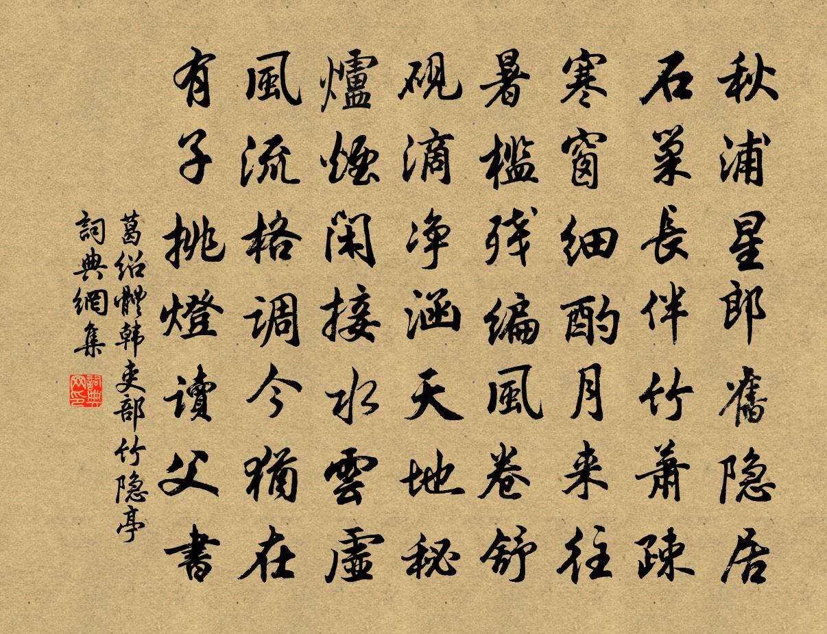 詩詞名句歷史字典書法欣賞書法字典國語詞典說文解字康熙字典古漢語字典標 題 作 者 詩 句 韓吏部竹隱亭作者:葛紹體 朝代:宋代韓吏部竹隱亭原文秋浦星郎舊隱居,石巢長伴竹蕭疎。寒窗細酌月來往,暑檻殘編風卷舒。硯滴淨涵天地秘,爐煙閒接水雲虛。風流格調今猶在,有子挑燈讀父書。詩詞問答問:韓吏部竹隱亭的作者是誰?答:葛紹體問:韓吏部竹隱亭寫於哪個朝代?答:宋代葛紹體韓吏部竹隱亭書法欣賞韓吏部竹隱亭書法作品詩詞推薦和方孚若瀑上種梅五首劉克莊〔宋代〕百匝千回看不足,管他急雪濺奔瀧。瑤林錯立明梁苑,寶璐橫陳照楚邦。愛殺嚼芳仍嗅蕊,吟狂哆口更疏厖。曉來和呂與叔秘書省觀蘭張耒〔宋代〕千里猗猗誰取將,忽驚顏色照文房。每憐墜露時施澤,更許光風為泛香。獨秀已先梁苑草,托根寧復楚天霜。坐令梅林即事四首劉應時〔宋代〕藜杖緣溪轉小橋,背風深處似相招。兒童指點皆驚怪,喚作枝頭雪未消。逍遙詠宋太宗〔宋代〕香湯沐浴更齋清,運動形軀四體輕。魔鬼自然生怕怖,神魂必定轉安寧。從無入有皆真實,去住何難妙最精。五行中秋寄陳碧棲萬哲〔宋代〕秋氣清如此,秋花香奈何。人生還健在,月色況明多。有酒君當醉,無愁我欲歌。樓高俯松頂,誰共酌姮娥。點絳唇元好問〔金代〕簾卷荷香,綺羅人在薰風裡。謝庭家世。來作閨門瑞。象服魚軒,占盡人間貴。應難比。蟠桃花底。一醉三千歲。復挽沈端節〔宋代〕氣概凌雲孰敢先,中興事業冠英躔。朝廷議論一言定,翰墨風流四海傳。恰跨鰲頭各紫閣,忽騎箕尾上青天。竹林寄文照大師釋智圓〔宋代〕兩制音書數往來,城中棲隱遠塵埃。吟齋夜靜開明月,講石秋深掃綠苔。出俗舊題留雪苑,臥雲幽興夢天台。林間歲晚陸游〔宋代〕歲晚霜風正怒號,荒村敗屋擁藜蒿。窮猶可勉聖賢事,老豈遽忘鉛槧勞。從宦雖如棋已決,治經竊比繭初繅。閉門贈裴九侍御昌江草堂彈琴賈至〔唐代〕朔風吹疏林,積雪在崖巘。鳴琴草堂響,小澗清且淺。沉吟東山意,欲去芳歲晚。悵望黃綺心,白雲若在眼。會稽頌王右軍祠諸葛興〔宋代〕典午西兮金谷輩,渡而東兮藹多士。嘉內史兮屏浮華,淡物累兮頤天粹。升冶城兮遐想,友東山兮雅志。修禊事兮和元遺山八首王奕〔宋代〕荒荒望魯甸,姬孔廟粼粼。允祚五十代,顏孟東西鄰。旁求侍坐翁,草莽迷城闉。豈應髮膚體,竟此成湮淪。鏗爾龍毋廟曾豐〔宋代〕母乘乾變化,兒主震神通。江海藩籬外,風雷掌握中。水居依罔極,血食至無終。為在扶桑國,曾收平日功。春遊茅山酬杜評事見寄權德輿〔唐代〕喜得賞心處,春山豈計程。連溪芳草合,半嶺白雲晴。絕澗漱冰碧,仙壇挹顥清。懷君在人境,不共此時情。喜雨詩張昭遠〔宋代〕幽谷從來分外清,那堪雨過月華新。行將高謝浮名事,卜築岩旁效子真。正月雨雪曾豐〔宋代〕少陽當進猶自抑,老陰當退猶自激。煦煦才融地出青,颼颼又肅天生白。一曝十寒權在天,春行冬令風弄權。我欲一翦梅吳文英〔宋代〕遠目傷心樓上山。愁里長眉,別後峨鬟。暮雲低壓小闌乾。教問孤鴻,因甚先還。瘦倚溪橋梅夜寒。雪欲消時,淚頌古釋慧空〔宋代〕錢塘潮頭來,成都藥市集。叵尀汝州風,吹落毛僧笠。八景歌趙汝鐩〔宋代〕積雨初過湘水滿,夕陽盪金接天遠。影掛寒罾江步斜,紅殘茅檐沙巷晚。小艇澤畔收釣緡,鼓枻滄浪歌濯纓。醉眼寄夫黃峨〔明代〕雁飛曾不到衡陽,錦字何由寄永昌。三春花柳妾薄命,六詔風煙君斷腸。曰歸曰歸愁歲暮,其雨其雨怨朝陽。相憐名句推薦高節志凌雲,不敢當滕六。環山樵《薛寶釵·雪竹》 君知否,是山西將種,曾系詩盟。劉過《沁園春·張路分秋閱》 孤煙村際起,歸雁天邊去。孟浩然《南歸阻雪》 老至居人下,春歸在客先。劉長卿《新年作》 唯有門前鏡湖水,春風不改舊時波。賀知章《回鄉偶書二首》 哀蟬無留響,叢雁鳴雲霄。陶淵明《己酉歲九月九日》 遊人不管春將老,來往亭前踏落花。歐陽修《豐樂亭遊春·其三》 古人學問無遺力,少壯工夫老始成。陸游《冬夜讀書示子聿》 混沌初開,乾坤始奠。程登吉《幼學瓊林·卷一·天文》 求之有道,得之有命,是求無益於得也,求在外者也。孟子《孟子·盡心章句上·第三節》
