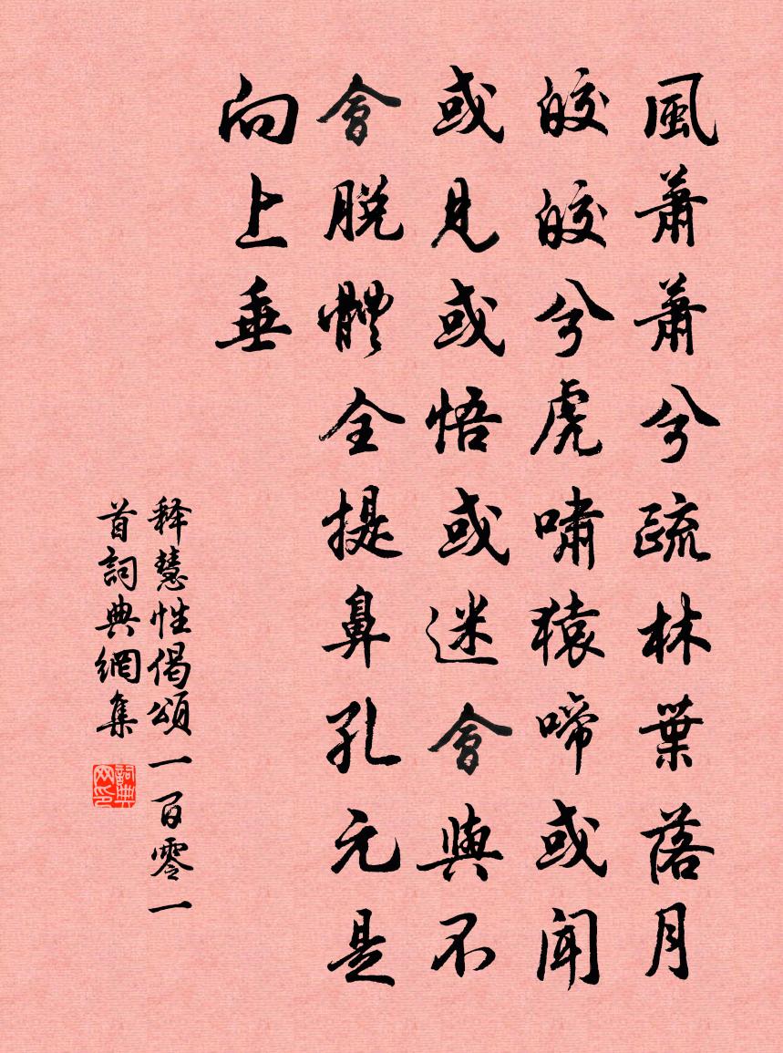 詩詞名句歷史字典書法欣賞書法字典國語詞典說文解字康熙字典古漢語字典標 題 作 者 詩 句 偈頌一百零一首作者:釋慧性 朝代:宋代偈頌一百零一首原文風蕭蕭兮疏林葉落,月皎皎兮虎嘯猿啼。或聞或見,或悟或迷。會與不會,脫體全提,鼻孔元是向上垂。詩詞問答問:偈頌一百零一首的作者是誰?答:釋慧性問:偈頌一百零一首寫於哪個朝代?答:宋代釋慧性偈頌一百零一首書法欣賞偈頌一百零一首書法作品詩詞推薦競渡蘇轍〔宋代〕史君欲聽榜人謳,一夜江波拍岸流。父老不知招屈恨,少年爭作弄潮游。長鯨破浪聊堪比,小旆逆風殊未收。角勝醉戲諸妓白居易〔唐代〕席上爭飛使君酒,歌中多唱舍人詩。不知明日休官後,逐我東山去是誰?除浙西憲舟過釣台有感陳傅良〔宋代〕一再登臨萬事非,裹頭還已雪垂垂。敢論筆力今無恨,欲附碑陰始不疑。台閣有人堪共政,江山如此且隨宜。論功偈傾一百六十九首釋智朋〔宋代〕冬不寒,臘後看。酸風颳地,凍破泥團。毗盧樓閣前,少林深雪裹,誰知猶隔萬重關。食鰣魚賀鑄〔宋代〕雨長沙田三尺蘆,截江邏釣待嘉魚。上鉤一尾夸先得,下筋千錢忍棄余。倦客罷彈腰下鋏,故人忘寄腹中書。知機送化主釋崇岳〔宋代〕勞生擾擾夢喧譁,夢破喧譁也大差。雲淨水天江上望,一輪皎潔落誰家。雲安聞鵑汪元量〔宋代〕雲安風景愚能說,蒼峽風掀浪如雪。杜鵑叫得口流血,染遍山花歸不得。臣甫再拜喔新詩,詩成甫也成愁絕。都人秋興汪莘〔宋代〕天處涵天心廣大,月中吐月性光明。夜來飛上崑崙頂,獨倚瓊樓嘯一聲。江雨三首楊萬里〔宋代〕雨里油窗莫要關,滴來堪玩灑堪聞。萬珠貢入龍宮了,剩得檐前數顆看。濟川阻雪九月二十七日客況 其三王冕〔元代〕滕州濟州山不多,平林大野少人家。解貂且問將軍酒,對雪誰言學士茶?直北五更聞玉笛,江南十月老梅花。相逢水龍吟蘇軾〔宋代〕萬里,不可到。天台有司馬子微,身居赤域,名在絳闕,可往從之。”自然乃還,受道於子微,白日仙去。子微著龍標野宴王昌齡〔唐代〕沅溪夏晚足涼風,春酒相攜就竹叢。莫道弦歌愁遠謫,青山明月不曾空。璞翁釋心月〔宋代〕隱密全真處,渾崙未剖時。從來只與麽,不用討瑕疵。徐十八晦落第歐陽詹〔唐代〕嘉穀不夏熟,大器當晚成。徐生異凡鳥,安得非時鳴。汲汲有所為,驅驅無本情。懿哉蒼梧鳳,終見排雲征。同錦州胡郎中清明日對雨西亭宴張籍〔唐代〕郡內開新火,高齋雨氣清。惜花邀客賞,勸酒促歌聲。共醉移芳席,留歡閉暮城。政閒方宴語,琴築任遙情。水淺舟滯解悶十絕鄭獬〔宋代〕斗城縹緲浮雲里,歸路陂陀碧草斜。北極已看龍虎氣,神州漸近帝王家。七言四韻十六首張伯端〔宋代〕學仙須是學天仙,惟有金丹最的端。二物會時情性合,五行全處虎龍蟠。本因戊己為媒聘,遂使夫妻鎮合歡。只候洞庭秋月王之道〔宋代〕扁舟夜泊蒹葭側,湖外雲間見明月。月光搖水制金蛇,坐想騷人賦秋色。舉杯向天屬姮娥,君當照坐吾當歌。全勝雁山總題此山本朝方顯戴復古〔宋代〕幾山兼幾水,更有幾煙霞。不立仙人宅,都為釋氏家。賓秋多少雁,報曉一雙鴉。有此山林勝,如何在海涯。送張法曹宋祁〔宋代〕駛騎柳枝鞭,春逵望雒廛。賦才賓右俊,掾諾府中賢。宮楯含櫻密,王渠泛醳聯。勝期資一笑,刑矢措周年。名句推薦別有根芽,不是人間富貴花。納蘭性德《採桑子·塞上詠雪花》 不怨天,不尤人。孔子弟子《論語·憲問篇》 遊說萬乘苦不早,著鞭跨馬涉遠道。李白《南陵別兒童入京》 碧野朱橋當日事,人不見,水空流。秦觀《江城子·西城楊柳弄春柔》 耽於女樂,不顧國政,則亡國之禍也。韓非及後人《韓非子·十過》 旅客三秋至,層城四望開。杜審言《登襄陽城》 百花頭上開,冰雪寒中見。辛棄疾《生查子·重葉梅》 文豈有常體,但以有體爲常李大師、李延壽《南史·列傳·卷三十二》 藥醫不死病,佛度有緣人。馮夢龍《醒世恆言·卷十》 兩岸荔枝紅,萬家煙雨中。李師中《菩薩蠻·子規啼破城樓月》