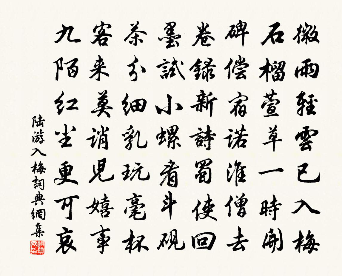 詩詞名句歷史字典書法欣賞書法字典國語詞典說文解字康熙字典古漢語字典標 題 作 者 詩 句 入梅作者:陸游 朝代:宋代入梅原文微雨輕雲已入梅,石榴萱草一時開。碑償宿諾淮僧去,卷錄新詩蜀使回。墨試小螺看斗硯,茶分細乳玩毫杯。客來莫誚兒嬉事,九陌紅塵更可哀!詩詞問答問:入梅的作者是誰?答:陸游問:入梅寫於哪個朝代?答:宋代問:陸游的名句有哪些?答:陸游名句大全陸游入梅書法欣賞入梅書法作品詩詞推薦入臨川境馬上作陸游〔宋代〕投老縻身薄領間,卻因馬上得偷閒。兼旬敢恨常為客,一飯何曾不對山。銅鏡無情欺白髮,霜風有力散酡顏。今宵郊廟朝會歌辭方皇樂歌佚名〔宋代〕修理方丘,吉蠲是宜。籩豆靜嘉,登於有司。芬芬聲香,來享來盞。郊行將終,聲歌和之。燕二首劉克莊〔宋代〕野老柴門日日開,且無欄檻礙飛回。勸君莫入珠簾去,羯鼓如雷打出來。光武帝臨淄勞耿弇劉秀〔兩漢〕車駕至臨溜自勞軍,群臣大會。帝謂弇曰:“昔韓信破歷下以開基,今將軍攻祝阿以發跡,此皆齊之西界,功足相浣溪沙劉雲震〔元代〕粉署含香舊有名。庖刀試手便崢嶸。并州人物未飄零。父 * 傳新政好,兒童都道長官清。十分和氣滿春城。大衍易吟四十首方回〔宋代〕大有同人盛,離柔寓戒辭。無威斯近弱,不廣即為私。棲霞寺王隨〔宋代〕翠巘聳層雲,珍祠古蹟存。獲登千佛嶺,仰荷九天恩。塔影凌虛閣,鐘聲度遠村。僧言前太守,罕有到松門。贈無擇老禪因觀稼鄭霖〔宋代〕兩年風雨為民愁,那得偷閒物外游。誰謂秋鴻留爪甲,吳儂一稔殿眉頭。觀燈口號姜夔〔宋代〕市樓歌鼓太喧譁,燈若連珠照萬家。太守令嚴君莫舞,遊人空戴玉梅花。夢回林景熙〔宋代〕夢回荒館月籠秋,何處砧聲喚客愁。深夜無風蓮葉響,水寒更有未眠鷗。張夫人輓詞張耒〔宋代〕世德簪纓貴,家風孝友傳。承夫知不忌,愛子故親賢。飄忽人間夢,生平物外緣。諸天清淨報,可但閟重泉。羸疾益間呈聶長孺學士宋祁〔宋代〕病緒蹇騷騷,彌旬曠坐曹。緣憂初得損,非巧亦成勞。計月銷雙臂,驚年變二毛。隙塵閒日滿,當藥晬時熬。顧此寄尚顏師吳融〔唐代〕僧中難得靜,靜得是吾師。到闕不求紫,歸山只愛詩。臨風翹雪足,向日剃霜髭。自嘆眠漳久,雙林動所思。物外亭宋祁〔宋代〕飛宇冠蒼岑,盤盤上百尋。風含太虛爽。雲作下方陰。塢桂寒仍燠,岩猿暝始吟。知君有高興,天壤共登臨。西陵絕句詩十四首李鄴嗣〔清代〕司馬墳前客過頻,灰飛常見紙錢新。豈如哭祭文山客,只有西台甲乙人。和史守八月十四日月二首郭印〔宋代〕半秋雲物掃遙天,對月憑欄一憮然。明夜半規應盡滿,此時清賞更無前。瓊樓頗覺三山近,玉斧誰將七寶連。我欲春思貽李方陵盧綸〔唐代〕長安三月春,難別復難親。不識冶遊伴,多逢憔悴人。漸知歡澹薄,轉覺老殷勤。去矣盡如此,此辭悲未陳。登庾樓董嗣杲〔宋代〕千年傳說庾公游,遠戌秋塵障兩眸。往事未知誰可語,今朝聊復此登樓。淮山鳥去沖煙滅,楚澤帆歸帶日收。閒客次韻周秀實見寄長篇王洋〔宋代〕當年識君恨不早,麗句清高人縹緲。有如商律變初秋,慢綠夭紅俱一掃。自親蘭杜襲餘芳,歸爇寒爐陋昏棗。乃知延平次趙糾曹韻十四首綠淨陳宓〔宋代〕清池綠如梁,到此顏為破。幸有詩仙來,珠璣剩教唾。名句推薦別離在今晨,見爾當何秋。韋應物《送楊氏女》 他人有心,予忖度之。佚名《巧言》 積雪覆平皋,飢鷹捉寒兔。孟浩然《南歸阻雪》 涉江采芙蓉,蘭澤多芳草。佚名《涉江采芙蓉》 情者文之經,辭者理之緯;經正而後緯成,理定而後辭暢:此立文之本源也。劉勰《文心雕龍·情采》 喧啾百鳥群,忽見孤鳳凰。韓愈《聽穎師彈琴》 寒梅最堪恨,常作去年花。李商隱《憶梅》 且趁閒身未老,盡放我、些子疏狂。蘇軾《滿庭芳·蝸角虛名》 自與東君作別,剗地無聊。納蘭性德《風流子·秋郊即事》 坡謂西湖,正如西子,濃抹淡妝臨鏡台。劉過《六州歌頭·寄稼軒承旨》