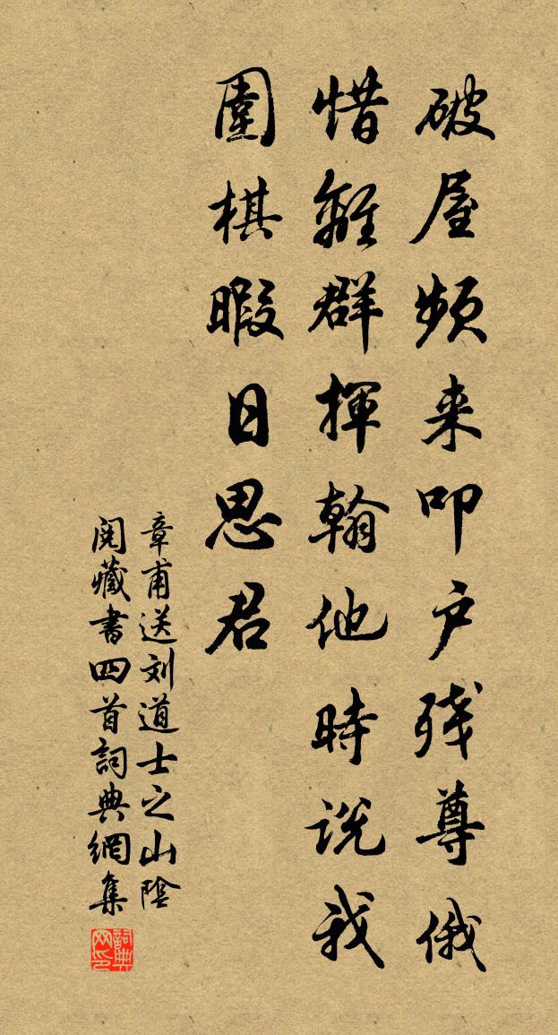 詩詞名句歷史字典書法欣賞書法字典國語詞典說文解字康熙字典古漢語字典標 題 作 者 詩 句 送劉道士之山陰閱藏書四首作者:章甫 朝代:宋代送劉道士之山陰閱藏書四首原文破屋頻來叩戶,殘尊俄惜離群。揮翰他時說我,圍棋暇日思君。詩詞問答問:送劉道士之山陰閱藏書四首的作者是誰?答:章甫問:送劉道士之山陰閱藏書四首寫於哪個朝代?答:宋代章甫送劉道士之山陰閱藏書四首書法欣賞送劉道士之山陰閱藏書四首書法作品詩詞推薦偈六十三首釋道寧〔宋代〕高提祖印,獨耀寰區。坐卻舌頭,聖凡罔測。聲前要旨,妙葉難該。句後玄關,金鍼雙鎖。通人分上,肯受提撕。夢西曹夜直李石〔宋代〕再任雖祠祿,多年本為親。青縑猶夢寐,彩服困風塵。老境人情變,韶華物色新。只堪攜茗碗,禪觀對幽人。生合歡楊維楨〔元代〕朝作生合歡,暮作生離泣。安得並蒂堅,堅似七姑汁?山出雲李紳〔唐代〕杳靄祥雲起,飄颺翠嶺新。縈峰開石秀,吐葉間松春。林靜翻空少,山明度嶺頻。回崖時掩鶴,幽澗或隨人。姑射暇日弄筆戲書陸游〔宋代〕天地為我廬,江山為我客。北斗以酌酒,恨我飲量窄。人生但閉戶,烏用分菽麥。贈君玉四方,憒憒無皂白。冬日雜興趙蕃〔宋代〕久矣勞生厭,欣然野趣俱。蒼姿松砥節,外飾橘紆朱。翰墨真吾好,功名已後圖。一椽今粗有,二頃莫憂無。東軒陸游〔宋代〕終日在東廂,閒消百刻香。一枰分黑白,雙硯列朱黃。荷氣侵簾馥,桐陰覆井涼。前知今夕夢,孤榜上瀟湘。丁寓田家有贈王維〔唐代〕君心印尚棲隱,印久欲傍歸印路。在朝印每為言,解印果成趣。晨雞鳴鄰里,群動從所務。農夫行餉田,閨妾起縫齋宮偶題張蘊〔宋代〕眾綠扶疏雨氣清,柳花吹作小池萍。文窗晝寂齋房邃,三漱華池誦玉經。次韻杜安行嘉陵春日書事十首郭印〔宋代〕老覺情懷別,愁隨節令來。草茅思雨露,天地漲氛埃。屋雀春彌怨,山雲晝不開。何人知此意,藜杖獨登台。奉和九月九日登慈恩寺浮圖應制李從遠〔唐代〕九月從時豫,三乘為法開。中霄日天子,半座寶如來。摘果珠盤獻,攀萸玉輦回。願將塵 * ,遙奉光明台。頌古四十四首釋師範〔宋代〕大士錯解注,志公錯註解。臭肉積屠門,堪笑無人買。和襲美泰伯廟陸龜蒙〔唐代〕故國城荒德未荒,年年椒奠濕中堂。邇來父子爭天下,不信人間有讓王。頃在金陵郡齋與黃觀復夜坐漏箭下一二十刻率蘇泂〔宋代〕映雪工夫久已無,引錐自刺一何愚。青燈一盞書狼藉,畫作金陵瞌睡圖。次懶窠見寄韻胡仲弓〔宋代〕園丁無擇種,蕭艾雜椒蘭。世欲欠真識,達人當大觀。無弦徒自賞,有鋏真空彈。獨倚西風立,推敲一字難。復古詩首句雲獨步復靜坐輒繼二章靜坐司馬光〔宋代〕一榻僅容膝,身心俱寂然。直緣和樂內,亦不為安禪。棐幾陳編掩,竹窗殘局捐。尚余喧噪在,野鳥與林蟬。翠屏列畫蔣晉〔宋代〕青峰如屏高插天,懸崖積翠生雲煙。誰把王維舊墨跡,巍巍高掛安居前。勝景應知世稀有,妙學丹青乃縮手。嗟哉春懷高翥〔宋代〕江南春盡尚春寒,添盡征衣獨掩關。日暮酒醒聞謝豹,所思多在水雲間。次韻酬因勝老方岳〔宋代〕誤脫農蓑拾漢科,空山奈此月明何。秋風又跨揚州鶴,行路正難愁思多。汪漕使即梅圃作浮月亭追和古詩餘亦補和魏了翁〔宋代〕一元播群卉,其氣清以馥。詩人競稱許,胡然於梅獨。黃宮播雷鞀,玉管動葭轂。惟梅命於陽,清 * 朴蔌。正冬名句推薦雲和積雪蒼山晚,煙伴殘陽綠樹昏。周朴《春日秦國懷古》 一聲何滿子,雙淚落君前。張祜《宮詞·故國三千里》 相顧無相識,長歌懷採薇。王績《野望》 此身合是詩人未?細雨騎驢入劍門。陸游《劍門道中遇微雨》 聞人善則疑之,聞人惡則信之,此滿腔殺機也。陳繼儒《小窗幽記·集靈篇》 尋桃覓柳,開遍南枝未覺。辛棄疾《瑞鶴仙·賦梅》 深夜無風新雨歇,涼月,露迎珠顆入圓荷。閻選《定風波·江水沉沉帆影過》 零落江南不自由。兩綢繆。料得吟鸞夜夜愁。姜夔《憶王孫·番陽彭氏小樓作》 笑別廬山遠,何煩過虎溪。李白《別東林寺僧》 風雨送春歸,飛雪迎春到。 * 《卜運算元·詠梅》
